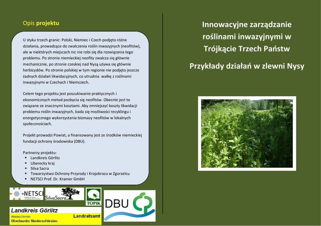 Opis projektu U styku trzech granic: Polski, Niemiec i Czech podjęto różne działania, prowadzące do zwalczenia roślin inwazyjnych (neofitów), ale w niektórych miejscach nic nie robi się dla rozwiązania tego problemu. Po stronie niemieckiej neofity zwalcza się głównie mechanicznie, po stronie czeskiej nad Nysą używa się głównie herbicydów. Po stronie polskiej w tym regionie nie podjęto jeszcze żadnych działań likwidacyjnych, co utrudnia walkę z roślinami inwazyjnymi w Czechach i Niemczech. Celem tego projektu jest poszukiwanie praktycznych i ekonomicznych metod pozbycia się neofitów. Obecnie jest to związane ze znacznymi kosztami. Aby zmniejszyć koszty likwidacji problemu roślin inwazyjnych, bada się możliwości recyklingu i energetycznego wykorzystania biomasy neofitów w lokalnych społecznościach. Projekt prowadzi Powiat, a finansowany jest ze środków niemieckiej fundacji ochrony środowiska (DBU). Partnerzy projektu: Landkreis Görlitz Liberecky kraj Silva Sacra Towarzystwo Ochrony Przyrody i Krajobrazu w Zgorzelcu NETSCI Prof. Dr. Kramer GmbH Innowacyjne zarządzanie roślinami inwazyjnymi w Trójkącie Trzech Państw Przykłady działań w zlewni Nysy Program warsztatów Zaproszenie na warsztaty 13.00 – 13.10 Powitanie i wprowadzenie Dr. Volker Wachendörfer i Prof. Dr. Matthias Kramer Gdzie? 13.10 – 13.50 Rezultaty projektu po stronie czeskiej Ing. Martin Modrý, Ph.D. IHK Zittau Konferenzraum Bahnhofstraße 30 02736 Zittau Kiedy? 13.50 – 14.20 Wyniki mapowania roślin inwazyjnych po stronie polskiej mgr. Waldemar Bena 14.20 – 14.50 Wyniki mapowania po stronie niemieckiej Kay Sbrzesny 14.50 – 16.10 Możliwości wykorzystania neofitów w Trójkącie Trzech Państw Oliver Renner 16.10 – 16.40 Dyskusja podsumowująca 24. kwietnia 2009 od godz. 13.00 do 16.40 Zapisy Prosimy o zgłaszanie chęci uczestnictwa w warsztatach do 13 kwietnia 2009 na podany niżej adres. Uczestnictwo w warsztatach jest bezpłatne. Organizatorzy W imieniu partnerów projektu „Innowacyjne zarządzanie roślinami inwazyjnymi w Trójkącie Trzech Panstw” Projektkonsortium „Innovatives Neophytenmanagement im Dreiländereck“ Oliver Renner Tel.: 03583 / 86 30 00 [email protected] Bahnhofstraße 30 02736 Zittau http://www.silvasacra.cz/inid