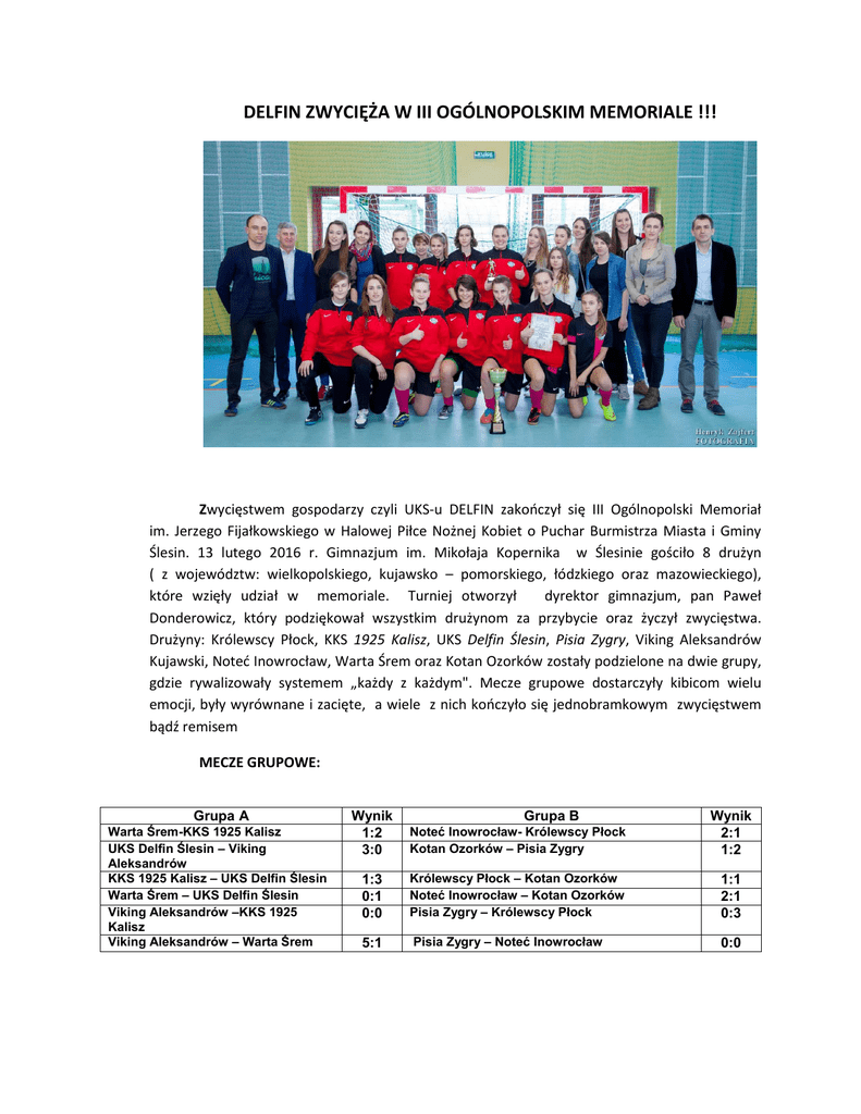 DELFIN ZWYCIĘŻA W III OGÓLNOPOLSKIM MEMORIALE !!! Zwycięstwem gospodarzy czyli UKS-u DELFIN zakończył się III Ogólnopolski Memoriał im. Jerzego Fijałkowskiego w Halowej Piłce Nożnej Kobiet o Puchar Burmistrza Miasta i Gminy Ślesin. 13 lutego 2016 r. Gimnazjum im. Mikołaja Kopernika w Ślesinie gościło 8 drużyn ( z województw: wielkopolskiego, kujawsko – pomorskiego, łódzkiego oraz mazowieckiego), które wzięły udział w memoriale. Turniej otworzył dyrektor gimnazjum, pan Paweł Donderowicz, który podziękował wszystkim drużynom za przybycie oraz życzył zwycięstwa. Drużyny: Królewscy Płock, KKS 1925 Kalisz, UKS Delfin Ślesin, Pisia Zygry, Viking Aleksandrów Kujawski, Noteć Inowrocław, Warta Śrem oraz Kotan Ozorków zostały podzielone na dwie grupy, gdzie rywalizowały systemem „każdy z każdym". Mecze grupowe dostarczyły kibicom wielu emocji, były wyrównane i zacięte, a wiele z nich kończyło się jednobramkowym zwycięstwem bądź remisem MECZE GRUPOWE: Grupa A Warta Śrem-KKS 1925 Kalisz UKS Delfin Ślesin – Viking Aleksandrów KKS 1925 Kalisz – UKS Delfin Ślesin Warta Śrem – UKS Delfin Ślesin Viking Aleksandrów –KKS 1925 Kalisz Viking Aleksandrów – Warta Śrem Wynik 1:2 3:0 Noteć Inowrocław- Królewscy Płock Kotan Ozorków – Pisia Zygry Grupa B Wynik 2:1 1:2 1:3 0:1 0:0 Królewscy Płock – Kotan Ozorków Noteć Inowrocław – Kotan Ozorków Pisia Zygry – Królewscy Płock 1:1 2:1 0:3 5:1 Pisia Zygry – Noteć Inowrocław 0:0 W pierwszym półfinale zmierzyły się drużyny UKS Delfin Ślesin oraz Królewskich Płock. Mecz był bardzo zacięty i wyrównany. Bramkę na wagę awansu do finału zdobyła trzy minuty przed końcem spotkania Margarita Królak. W drugim półfinale drużyna Vikinga Aleksandrów Kujawski pokonała Noteć Inowrocław 2:1. Finał dostarczył wielkich emocji i miał niezwykle ciekawy przebieg. Po bramce zdobytej przez Karolinę Liberacką drużyna z Aleksandrowa Kujawskiego wyszła na prowadzenie. Wtedy dała znać o sobie ślesińska publiczność. Delfin niesiony niesamowitym dopingiem kibiców zaczął dominować na boisku. Wyrównanie dała bramka zdobyta po kombinacyjnej akcji przez Sylwię Wiśniewską. Wiara i walka do końca dały Delfinowi wygraną. Na 6 sekund przed końcem meczu Joanna Czerniejewska pięknym strzałem niemalże z połowy boiska zdobyła zwycięskiego gola. Końcowa kolejność w turnieju: 1) UKS Delfin Ślesin, 2) Viking Aleksandrów Kujawski, 3) Noteć Inowrocław, 4) Królewscy Płock, 5) KKS 1925 Kalisz, 6) Pisia Zygry, 7) Kotan Ozorków, 8) Warta Śrem. Joanna Czerniejewska UKS Delfin Ślesin została wybrana najlepszą zawodniczką turnieju. W opinii wszystkich trenerów i opiekunów to był bardzo udany turniej. Złożyły się na to m.in. emocje, które zafundowały sobie i oglądającym wszystkie drużyny oraz wspaniały doping kibiców. Zarząd UKS-u Delfin Ślesin składa podziękowania: Burmistrzowi Miasta i Gminy Ślesin p. Mariuszowi Zaborowskiemu za ufundowanie pucharów oraz dyplomów, Dyrekcji Gimnazjum im. Mikołaja Kopernika w Ślesinie za wsparcie oraz serdeczność, obecnym oraz byłym zawodniczkom za pomoc i zaangażowanie w organizację imprezy, a także wszystkim zawodniczkom oraz kibicom za stworzenie miłej i sportowej atmosfery. Skład UKS-u Delfin Ślesin: Zuzanna Pasik, Margarita Królak, Sylwia Wiśniewska, Joanna Czerniejewska, Adrianna Badic, Aleksandra Zmuda, Weronika Lewandowska, Wiktoria Szczepankiewicz, Weronika Olczak Michalina Maciejewska, trener- Marcin Łukowski.