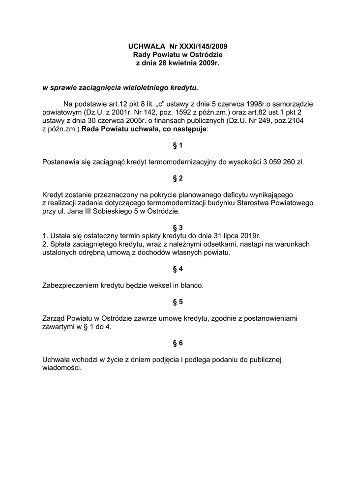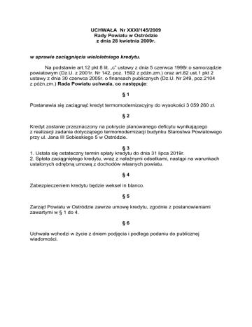 UCHWAŁA Nr XXXI/145/2009 Rady Powiatu w Ostródzie z dnia 28 kwietnia 2009r. w sprawie zaciągnięcia wieloletniego kredytu. Na podstawie art.12 pkt 8 lit. „c” ustawy z dnia 5 czerwca 1998r.o samorządzie powiatowym (Dz.U. z 2001r. Nr 142, poz. 1592 z późn.zm.) oraz art.82 ust.1 pkt 2 ustawy z dnia 30 czerwca 2005r. o finansach publicznych (Dz.U. Nr 249, poz.2104 z późn.zm.) Rada Powiatu uchwala, co następuje: §1 Postanawia się zaciągnąć kredyt termomodernizacyjny do wysokości 3 059 260 zł. §2 Kredyt zostanie przeznaczony na pokrycie planowanego deficytu wynikającego z realizacji zadania dotyczącego termomodernizacji budynku Starostwa Powiatowego przy ul. Jana III Sobieskiego 5 w Ostródzie. §3 1. Ustala się ostateczny termin spłaty kredytu do dnia 31 lipca 2019r. 2. Spłata zaciągniętego kredytu, wraz z należnymi odsetkami, nastąpi na warunkach ustalonych odrębną umową z dochodów własnych powiatu. §4 Zabezpieczeniem kredytu będzie weksel in blanco. §5 Zarząd Powiatu w Ostródzie zawrze umowę kredytu, zgodnie z postanowieniami zawartymi w § 1 do 4. §6 Uchwała wchodzi w życie z dniem podjęcia i podlega podaniu do publicznej wiadomości. UZASADNIENIE do uchwały Nr XXXI/145/2009 Rady Powiatu w Ostródzie z dnia 28 kwietnia 2009r. w sprawie zaciągnięcia kredytu Zarząd Powiatu zdecydował się przedstawić propozycję zmian w budżecie na 2009r. polegającą na wprowadzeniu do zadań inwestycyjnych termomodernizacji budynku Starostwa Powiatowego przy ul. Jana III Sobieskiego 5 w Ostródzie („Koszarowiec”). Zadanie to ogółem będzie wynosiło 3 920 000 tys. zł w tym udział własny 860 740 zł. Finansowanie ma pochodzić ze środków własnych jednostki i kredytu z premią gwarancyjną z BGK w wysokości do 20% kwoty kredytu. Planowany deficyt po zmianach na 2009 r., zgodnie z wyżej wymienioną uchwałą Rady Powiatu wynosi 5 361 260 zł. W 2009 roku planuje się spłacić, zgodnie z wcześniej zawartymi umowami, raty kredytów w kwocie 2 631 127 zł, pożyczki w kwocie 87 500 zł oraz wykupić obligacje na kwotę 2 500 000 zł. Dla sfinansowania powyższych zobowiązań powiat musi zaciągnąć nowe kredyty i pożyczki w wysokości 8 187 132 zł. Dług powiatu na koniec 2009 roku wyniesie 27 102 265 zł (27,21% - wskaźnik ogólnego zadłużenia). Kredyt planuje się spłacić w ciągu dziesięciu lat. Zaciągnięcie kredytu termomodernizacyjnego jest zasadne z uwagi na bardzo korzystne warunki finansowe ( umorzenie 20% kredytu – premia gwarancyjna oraz niskie oprocentowanie). Na dzień dzisiejszy jest to jedno z lepszych rozwiązań aby zacząć adaptację budynku i nie pozwolić na dalszą degradację oraz rozwiązać problem należytej obsługi petentów i zapewnić dobre warunki pracy pracownikom. Pozostałe prace związane z adaptacją planuje się sfinansować po sprzedaży nieruchomości jednostek przenoszonych do nowej siedziby. Aktualna siedziba Starostwa Powiatowego w Ostródzie jest czasowo dopuszczona do użytkowania.