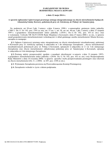 Elektronicznie podpisany przez: Mirosław Górecki - Burmistrz Miasta Kowary dnia 15 maja 2014 r. ZARZĄDZENIE NR 58/2014 BURMISTRZA MIASTA KOWARY z dnia 12 maja 2014 r. w sprawie ogłoszenia I (pierwszego) przetargu ustnego nieograniczonego na zbycie nieruchomości będących własnością Gminy Kowary, położonych przy ul. Górniczej, ul. Polnej i ul. Sanatoryjnej. Na podstawie art. 30 ust. 2 pkt 3 ustawy z dnia 8 marca 1990 r. o samorządzie gminnym (tekst jednolity z 2001 r. Dz. U. Nr 142, poz. 1591 ze zm), art. 37 ust. 1, art. 38, art. art. 40 ust. 1 pkt 1 ustawy z dnia 21 sierpnia 1997 r. o gospodarce nieruchomościami (tekst jednolity z 2010 r, Dz. U. Nr 102, poz. 651 ze zm.) oraz w wykonaniu Uchwały NR XLIV/238/06 Rady Miejskiej w Kowarach z dnia 27 marca 2006 r. ze zm., w sprawie zasad gospodarowania nieruchomościami wchodzącymi w skład gminnego zasobu nieruchomości Miasta Kowary, zarządza co następuje: § 1. Ogłasza I (pierwszy) przetarg ustny nieograniczony na zbycie nieruchomości niezabudowanej, położonej w Kowarach przy ul. Górniczej opisanej w załączniku nr 1 do niniejszego Zarządzenia , zbycie nieruchomości niezabudowanych położonych przy ul. Polnej w Kowarach, opisanych w załączniku nr 2 i nr 3 do niniejszego Zarządzenia oraz zbycie nieruchomości zabudowanej położonej przy ul. Sanatoryjnej w Kowarach, opisanej w załączniku nr 4 do niniejszego Zarządzenia. § 2. Przetarg należy przeprowadzić zgodnie z zasadami określonymi w ustawie z dnia 21 sierpnia 1997r. o gospodarce nieruchomościami (tekst jednolity z 2010r. Dz. U. Nr 102, poz. 651 ze zm.) oraz Rozporządzeniu Rady Ministrów z dnia 14 września 2004r. w sprawie sposobu i trybu przeprowadzania przetargów oraz rokowań na zbycie nieruchomości (Dz. U. z 2004r. nr 207, poz. 2108 ze zm.). § 3. Wykonanie Zarządzenia powierza się Przewodniczącemu Komisji Przetargowej. § 4. Zarządzenie wchodzi w życie z dniem podpisania. Id: 00CCE234-CC36-4861-8783-0B858577539F. Podpisany Strona 1 Kowary, dnia 12.05.2014 r. Załącznik Nr 1 do Zarządzenia Nr 58/2014 Burmistrza Miasta Kowary z dnia 12.05.2014r. OGŁOSZENIE o I ( pierwszym ) przetargu ustnym nieograniczonym na sprzedaż nieruchomości niezabudowanej będącej własnością Gminy Kowary, oznaczonej działką gruntu numer 462/2 ( obręb 1 a.m. 10 ) o pow. 0,4029 ha, położonej w Kowarach przy ul. Górniczej, który odbędzie się w dniu 16 czerwca 2014r. o godz. 1000 . Nieruchomość będąca przedmiotem przetargu była zamieszczona w wykazie nieruchomości przeznaczonych do sprzedaży ( Zarządzenie Nr 40/2014 Burmistrza Miasta Kowary z dnia 27 marca 2014r. ), który został podany do publicznej wiadomości poprzez ogłoszenie w prasie, na stronie internetowej tut. Urzędu oraz wywieszony na tablicy ogłoszeń Urzędu Miejskiego w Kowarach w okresie od 28.03.2014r. do 17.04.2014r. Ogłoszenie o I ( pierwszym ) przetargu ustnym nieograniczonym ( Zarządzenie Nr 58 /2014 Burmistrza Miasta Kowary z dnia 12 maja 2014r. ), było wywieszone na tablicy ogłoszeń Urzędu Miejskiego w Kowarach na okres 30 dni począwszy od 13.05.2014r. do 12.06.2014r., opublikowane na stronie internetowej Urzędu oraz umieszczone w prasie. Oznaczenie nieruchomości w/g danych z ewidencji gruntów i budynków : Nieruchomość oznaczona działką gruntu nr 462/2 ( obręb 1, a.m. 10) o pow. 0,4029 ha , położona w Kowarach przy ul. Górniczej. Oznaczenie nieruchomości wg księgi wieczystej : Dla przedmiotowej nieruchomości Sąd Rejonowy VI Wydział Ksiąg Wieczystych w Jeleniej Górze prowadzi księgę wieczystą KW numer JG1J/00082277/8. Opis nieruchomości : Nieruchomość położona na obrzeżu strefy śródmiejskiej. Działka nieforemna. Około 50% powierzchni działki stanowi skarpa o zmiennej wysokości od 0 do 5,5 m opadająca od ul. Górniczej w kierunku zachodnim. Na skarpie tej znajdują się ruiny budynku gospodarczego oraz drzewostan o umiarkowanym zwarciu, zróżnicowany gatunkowo. Przez południową i północną część działki przepływa ciek wodny, zaś w wypłaszczonej części zachodniej znajduje się mały akwen wodny. Działka niezagospodarowana, pokryta trawą oraz częściowo gruzem i odpadami. Od strony północno- wschodniej do działki przylega ul. Górnicza oraz fragment zespołu garaży. Od strony północno- zachodniej działka przylega do działki 462/2, zaś od strony południowo-zachodniej i południowo - wschodniej do działki zabudowanej 445/4. Działka dość dobrze nasłoneczniona. Dojazd do działki ul. Górniczą, w której Id: 00CCE234-CC36-4861-8783-0B858577539F. Podpisany Strona 2 znajduje się pełne uzbrojenie: energia elektryczna, woda, kanalizacja, gaz, kanalizacja telefoniczna. Przeznaczenie nieruchomości w miejscowym planie zagospodarowania przestrzennego Zgodnie z miejscowym planem zagospodarowania przestrzennego Miasta Kowary dla jednostki urbanistycznej Kowary – Centrum C przyjętym Uchwałą Nr XVI/76/07 Rady Miejskiej w Kowarach z dnia 23.10.2007r., nieruchomość leży w terenie oznaczonym symbolem 1 UT/ZP tj. tereny usług turystyki z dopuszczeniem zieleni parkowej oraz 4KSG tj. garaże. Forma sprzedaży : Na własność Cena wywoławcza : 41.550,00 zł (słownie: czterdzieści jeden tysięcy pięćset pięćdziesiąt złotych ). ( do wylicytowanej w przetargu ceny nieruchomości zostanie doliczony podatek VAT 23% ). Wysokość wadium : 5.000,00 zł ( słownie : pięć tysięcy złotych ) Postąpienie: o wysokości postąpienia decydują uczestnicy przetargu, z tym, że postąpienie nie może wynosić mniej niż 1% ceny wywoławczej z zaokrągleniem w górę do pełnych dziesiątek złotych . Wysokość opłat i termin ich wnoszenia: Należność za nabytą nieruchomość winna być wpłacona jednorazowo przed zawarciem aktu notarialnego na konto Urzędu Miejskiego w Kowarach w PKO BP O. Kowary nr 80 10202124 0000 81020011 0684. Uwagi: Uchwała Nr XLIV/238/06 Rady Miejskiej w Kowarach z dnia 27 marca 20