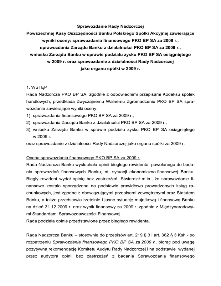 Sprawozdanie Rady Nadzorczej Powszechnej Kasy Oszczędności Banku Polskiego Spółki Akcyjnej zawierające wyniki oceny: sprawozdania finansowego PKO BP SA za 2009 r., sprawozdania Zarządu Banku z działalności PKO BP SA za 2009 r., wniosku Zarządu Banku w sprawie podziału zysku PKO BP SA osiągniętego w 2009 r. oraz sprawozdanie z działalności Rady Nadzorczej jako organu spółki w 2009 r. 1. WSTĘP Rada Nadzorcza PKO BP SA, zgodnie z odpowiednimi przepisami Kodeksu spółek handlowych, przedkłada Zwyczajnemu Walnemu Zgromadzeniu PKO BP SA sprawozdanie zawierające wyniki oceny: 1) sprawozdania finansowego PKO BP SA za 2009 r., 2) sprawozdania Zarządu Banku z działalności PKO BP SA za 2009 r., 3) wniosku Zarządu Banku w sprawie podziału zysku PKO BP SA osiągniętego w 2009 r. oraz sprawozdanie z działalności Rady Nadzorczej jako organu spółki za 2009 r. Ocena sprawozdania finansowego PKO BP SA za 2009 r. Rada Nadzorcza Banku wysłuchała opinii biegłego rewidenta, powołanego do badania sprawozdań finansowych Banku, nt. sytuacji ekonomiczno-finansowej Banku. Biegły rewident wydał opinię bez zastrzeżeń. Stwierdził m.in., że sprawozdanie finansowe zostało sporządzone na podstawie prawidłowo prowadzonych ksiąg rachunkowych, jest zgodne z obowiązującymi przepisami zewnętrznymi oraz Statutem Banku, a także przedstawia rzetelnie i jasno sytuację majątkową i finansową Banku na dzień 31.12.2009 r. oraz wynik finansowy za 2009 r. zgodnie z Międzynarodowymi Standardami Sprawozdawczości Finansowej. Rada podziela opinie przedstawione przez biegłego rewidenta. Rada Nadzorcza Banku – stosownie do przepisów art. 219 § 3 i art. 382 § 3 Ksh - po rozpatrzeniu Sprawozdania finansowego PKO BP SA za 2009 r., biorąc pod uwagę pozytywną rekomendację Komitetu Audytu Rady Nadzorczej i na podstawie wydanej przez audytora opinii bez zastrzeżeń z badania Sprawozdania finansowego PKO BP SA za 2009 r. zaopiniowała pozytywnie Sprawozdanie jako sporządzone zgodnie z księgami i dokumentami oraz stanem faktycznym. Rada pozytywnie zaopiniowała projekt uchwały Zwyczajnego Walnego Zgromadzenia w sprawie przyjęcia Sprawozdania finansowego PKO BP SA za 2009 r. Zgodnie z art. 4a ustawy o rachunkowości Rada zapewnia również, że wszystkie elementy Sprawozdania finansowego PKO BP SA za 2009 r. spełniają wymagania przewidziane w tej ustawie. Ocena sprawozdania Zarządu Banku z działalności PKO BP SA za 2009 r. Rada Nadzorcza Banku - stosownie do przepisów art. 382 § 3 Kodeksu spółek handlowych – po dokonaniu oceny Sprawozdania Zarządu Banku z działalności PKO BP SA za 2009 r., zawierającego informacje o działalności Zarządu jako organu spółki, pozytywnie zaopiniowała projekt uchwały Zwyczajnego Walnego Zgromadzenia w sprawie przyjęcia Sprawozdania Zarządu Banku z działalności PKO BP SA za 2009 r. Ocena wniosku Zarządu Banku w sprawie podziału zysku PKO BP SA osiągniętego w 2009 r. Ze względu na wyzwania stojące przed Bankiem w związku z realizacją Strategii Banku na lata 2010-2012 oraz deklaracje złożone w Prospekcie emisyjnym Akcji Serii D Rada Nadzorcza Banku pozytywnie opiniuje wniosek Zarządu Banku w sprawie przeznaczenia z zysku netto w wysokości 2 432 152 tys. zł, osiągniętego w 2009 r.: 1 000 000 tys. zł na dywidendę dla akcjonariuszy, 1 425 000 tys. zł na kapitał zapasowy oraz 7 152 tys. zł na kapitał rezerwowy. 2. SPRAWOZDANIE Z DZIAŁALNOŚCI RADY JAKO ORGANU SPÓŁKI 1) Informacja o kadencji Rady Nadzorczej Banku i kolejnym roku działalności w kadencji oraz składzie osobowym Rady, pełnionych funkcjach w Radzie oraz zmianach w składzie Rady w trakcie roku obrotowego 2 Rada Nadzorcza (skład wg stanu na 31.12.2009 r.): (wspólna trzyletnia kadencja rozpoczęta w dniu 20 maja 2008 r.) Lp. Data powołania/ odwołania powołany 20 kwietnia 2009 r. do końca Cezary Banasiń- Przewodniczący Rady Nadzorczej Banobecnej kadencji Rady Nadzorczej Banku ski ku (rozpoczęta w dniu 20 maja 2008 r.) (aktem notarialnym /Repertorium A – Nr 2959/2009, uchwałą nr 7/2009) Minister Skarbu Państwa wyznaczył Członka Rady Nadzorczej Banku C. Banasińskiego na Przewodniczącego Rady Nadzorczej Banku powołany 31 sierpnia 2009 r. do końca obecTomasz Zganiacz Wiceprzewodniczący Rady Nadzorczej nej kadencji Rady Nadzorczej Banku Banku (aktem notarialnym /Repertorium A – Nr 5855/2009, uchwałą nr 8/2009) Minister Skarbu Państwa wyznaczył Członka Rady Nadzorczej Banku T. Zganiacza na Wiceprzewodniczącego Rady Nadzorczej Banku Członek Rady Nadzorczej Banku Jan Bossak powołany 26.02.2008 r. na kadencję, która zakończyła się 19.05.2008 r. i na obecną kadencję Rady Nadzorczej Banku (aktem notarialnym /Repertorium A – Nr 1362/2008, uchwałą nr 4/1/2008) Członek Rady Nadzorczej Banku Mirosław Czekaj powołany 31 sierpnia 2009 r. do końca obecnej kadencji Rady Nadzorczej Banku (aktem notarialnym /Repertorium A – Nr 5855/2009, uchwałą nr 5/2009) Członek Rady Nadzorczej Banku Ireneusz Fąfara powołany 31 sierpnia 2009 r. do końca obecnej kadencji Rady Nadzorczej Banku (aktem notarialnym /Repertorium A – Nr 5855/2009, uchwałą nr 6/2009) Imię i nazwisko Funkcja Błażej Lepczyński Członek Rady Nadzorczej Banku powołany 20 kwietnia 2009 r. do końca obecnej kadencji Rady Nadzorczej Banku Alojzy Zbigniew Nowak Członek Rady Nadzorczej Banku powołany 31 sierpnia 2009 r. do końca obecnej kadencji Rady Nadzorczej Banku (aktem notarialnym /Repertorium A – Nr 5855/2009, uchwałą nr 7/2009) Zmiany w składzie Rady Nadzorczej w 2009 r. Lp . Imię i nazwisko Marzena Piszczek Eligiusz Jerzy Krześniak Funkcja Przewodnicząca Rady Nadzorczej Banku Wiceprzewodniczący Rady Nadzorczej Banku 3 Data powołania/ odwołania powołana 26.02.2008 r. na kadencję, która zakończyła się 19.05.2008 r. i na obecną kadencję Rady Nadzorczej Banku (aktem notarialnym /Repertorium A – Nr 1362/2008, uchwałą nr 4/6/2