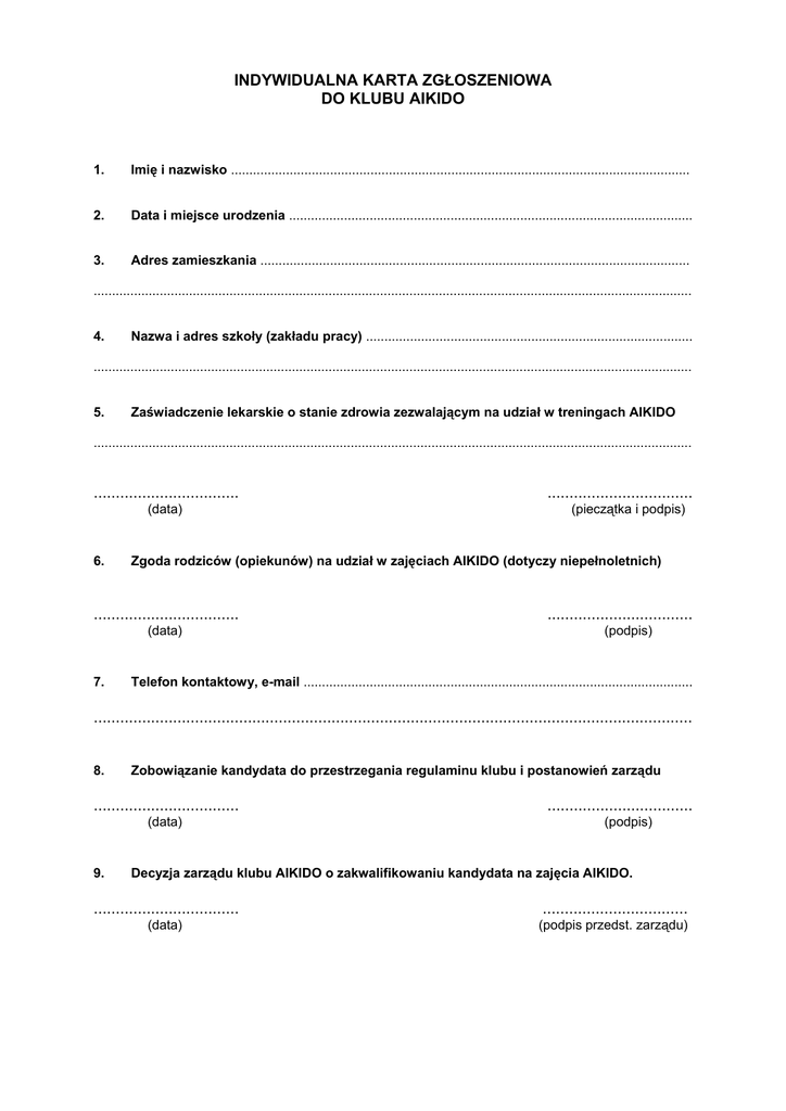 INDYWIDUALNA KARTA ZGŁOSZENIOWA DO KLUBU AIKIDO 1. Imię i nazwisko ............................................................................................................................. 2. Data i miejsce urodzenia .............................................................................................................. 3. Adres zamieszkania ..................................................................................................................... ................................................................................................................................................................... 4. Nazwa i adres szkoły (zakładu pracy) ......................................................................................... ................................................................................................................................................................... 5. Zaświadczenie lekarskie o stanie zdrowia zezwalającym na udział w treningach AIKIDO ................................................................................................................................................................... ................................. (data) 6. (pieczątka i podpis) Zgoda rodziców (opiekunów) na udział w zajęciach AIKIDO (dotyczy niepełnoletnich) ................................. (data) 7. ................................. ................................. (podpis) Telefon kontaktowy, e-mail .......................................................................................................... ........................................................................................................................................ 8. Zobowiązanie kandydata do przestrzegania regulaminu klubu i postanowień zarządu ................................. (data) 9. ................................. (podpis) Decyzja zarządu klubu AIKIDO o zakwalifikowaniu kandydata na zajęcia AIKIDO. ................................. ................................. (data) (podpis przedst. zarządu)