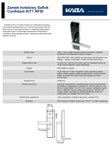 Zamek hotelowy Saflok Confidant KIT1 RFID Confidant KIT1 to zamek hotelowy z możliwością instalacji na drzwiach wyposażonych już w zamek wpuszczany. Nie ma zatem konieczności jego wymiany, a instalacja systemu jest bezproblemowa i nie wymaga kosztownych i kłopotliwych przeróbek. Może współpracować z większością standardowych szyldów i klamek. System pracy Odczyt Programowanie kart Pamięć offline / online (dzięki bezprzewodowej komunikacji umożliwia zbudowanie scentralizowanej kontroli dostępu) karta RFID (ISO 14443, Mifare) lub opcjonalnie BLE (Bluetooth Low Energy) – system umożliwiający użycie smartfona jako klucza na okres od 1 doby do 9 lat, karta może być zaprogramowana do 10 dni przed przyjazdem gościa hotelowego 4000 ostatnich zdarzeń Liczba otwarć do 50 tysięcy (2÷3 lata w przypadku użycia najwyższej jakości baterii). Zamek posiada funkcję powiadamiania o niskim poziomie baterii. W wersji online raport może być wysyłany do działu technicznego Grubość drzwi 35÷60 mm Zamek wpuszczany Wykończenie powierzchni Otoczenie możliwość wykorzystania zainstalowanego zamka wpuszczanego lub nowego o następujących parametrach: dormas (backset) - min. 45 mm, trzpień klamki 7, 8, 8,5 i 9 mm, rozstaw montażowy klamek 38 mm, wysokość korpusu zamka wpuszczanego 135-200 mm, rozstaw między osią klamki a wkładką bębenkową 70-92 mm, przystosowany do wkładek Euro oraz Swiss. chrom satynowany, mosiądz satynowany, pokrywa PCV IP54 według IEC 60529, temperatura -35÷70 °C, 0÷85% wilgotności