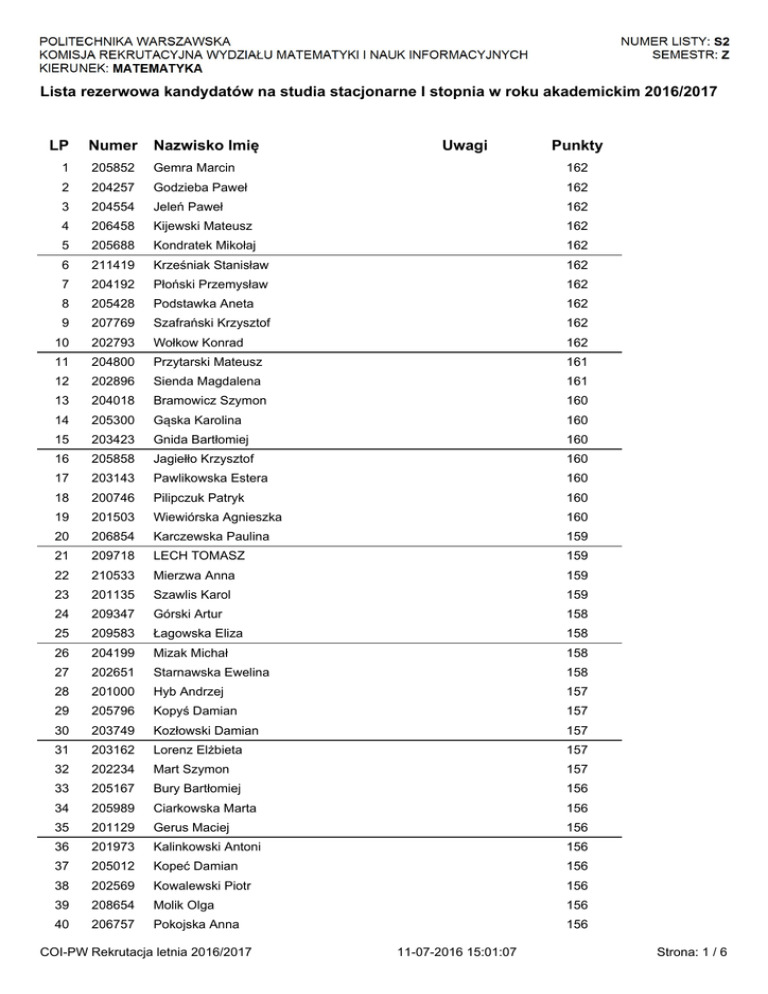 Lista rezerwowa kandydatów na studia stacjonarne I stopnia w roku akademickim 2016/2017 LP Numer Nazwisko Imię 1 205852 Gemra Marcin 162 2 204257 Godzieba Paweł 162 3 204554 Jeleń Paweł 162 4 206458 Kijewski Mateusz 162 5 205688 Kondratek Mikołaj 162 6 211419 Krześniak Stanisław 162 7 204192 Płoński Przemysław 162 8 205428 Podstawka Aneta 162 9 207769 Szafrański Krzysztof 162 10 202793 Wołkow Konrad 162 11 204800 Przytarski Mateusz 161 12 202896 Sienda Magdalena 161 13 204018 Bramowicz Szymon 160 14 205300 Gąska Karolina 160 15 203423 Gnida Bartłomiej 160 16 205858 Jagiełło Krzysztof 160 17 203143 Pawlikowska Estera 160 18 200746 Pilipczuk Patryk 160 19 201503 Wiewiórska Agnieszka 160 20 206854 Karczewska Paulina 159 21 209718 LECH TOMASZ 159 22 210533 Mierzwa Anna 159 23 201135 Szawlis Karol 159 24 209347 Górski Artur 158 25 209583 Łagowska Eliza 158 26 204199 Mizak Michał 158 27 202651 Starnawska Ewelina 158 28 201000 Hyb Andrzej 157 29 205796 Kopyś Damian 157 30 203749 Kozłowski Damian 157 31 203162 Lorenz Elżbieta 157 32 202234 Mart Szymon 157 33 205167 Bury Bartłomiej 156 34 205989 Ciarkowska Marta 156 35 201129 Gerus Maciej 156 36 201973 Kalinkowski Antoni 156 37 205012 Kopeć Damian 156 38 202569 Kowalewski Piotr 156 39 208654 Molik Olga 156 40 206757 Pokojska Anna 156 COI-PW Rekrutacja letnia 2016/2017 Uwagi 11-07-2016 15:01:07 Punkty Strona: 1 / 6 Lista rezerwowa kandydatów na studia stacjonarne I stopnia w roku akademickim 2016/2017 LP Numer Nazwisko Imię 41 202048 Pozorek Anna 156 42 203773 Wójcik Miłosz 156 43 207810 Ekiert Dagmara 155 44 206079 Zalewski Łukasz 155 45 205443 Jasionek Jan 154 46 203179 Kondrad Bohusz 154 47 210890 Krupa Mateusz 154 48 206598 Niedziałek Łukasz 154 49 200290 Stykowska Aleksandra 154 50 208147 Wiśniewski Wiktor 153 51 200954 Dypa Marlena 152 52 211093 Kasperowicz Tomasz 152 53 205519 Mońka Dominika 152 54 209360 Oleksiuk Grzegorz 152 55 205166 Ustymowicz Patryk 152 56 201650 Wilke Aleksandra 152 57 206064 Milan Paweł 151 58 200833 Olesiński Paweł 151 59 203711 Radecka Paulina 151 60 210015 Stasiewicz Karolina 151 61 207092 Wojciechowska Alicja 151 62 207232 Brzeziński Bartosz 150 63 201293 Opalach Dawid 150 64 204520 Ciężka Aleksandra 149 65 206859 Korzeń Kamil 149 66 203426 Ksiądz Jakub 149 67 207648 Polok Kamil 149 68 204049 Adamczyk Paulina 148 69 206822 Łaba Jonasz 148 70 205812 Łapkiewicz Igor 148 71 207295 Picheta Marta 148 72 208799 Sidorowicz Piotr 148 73 206553 Żołądek Marta 148 74 204103 Górnik Przemysław 147 75 208288 Ługowska Nina 147 76 208422 Paszkiewicz Krzysztof 147 77 203047 Zawadzki Jakub 147 78 205279 Gürtler Robert 146 79 200872 Zimna Dorota 146 80 206673 Blajer Klaudia 145 COI-PW Rekrutacja letnia 2016/2017 Uwagi 11-07-2016 15:01:07 Punkty Strona: 2 / 6 Lista rezerwowa kandydatów na studia stacjonarne I stopnia w roku akademickim 2016/2017 LP Numer Nazwisko Imię 81 207346 Królikowski Wojciech 145 82 212036 Osiński Daniel 145 83 203344 Dymowska Monika 144 84 202517 Pacha Zuzanna 144 85 205876 Sudomir Kamila 144 86 206692 Winnicki Ryszard 144 87 203510 Chojnacki Jan 143 88 207710 Gniado Patryk 143 89 201455 Michalska Karolina 143 90 209860 Piętowski Hubert 143 91 211015 Kosut Krzysztof 142 92 201738 Stępień Kamila 142 93 211765 Kania Maja 141 94 211745 Uznański Michał 141 95 206306 Iwankiewicz Katarzyna 140 96 203199 Mamczura Aisza 140 97 203277 Kupisiewicz Sebastian 139 98 209267 Małczak Marcelina 139 99 208801 Matejek Kacper 139 100 202476 Sochanowska Gabriela 139 101 209271 Waszczyńska Ewelina 139 102 208989 Wójtowicz Maciej 139 103 200724 Beck Natalia 138 104 210857 Kałużna Marta 138 105 208001 Krakowiak Filip 138 106 208698 Podleśna Iwona 138 107 200869 Wójcik Michał 138 108 210715 Hawrylak Natalia 137 109 210263 Jaroszenko Michał 137 110 212063 Karliński Marcin 137 111 204720 Kopka Jakub 137 112 208083 Leśniak Mateusz 137 113 204530 Rendaszek Natalia 137 114 206777 Zdanowski Arkadiusz 137 115 208591 Adamowicz Martyna 136 116 204110 Końska Patrycja 136 117 201862 Matusik Grzegorz 136 118 201493 Mrygoń Ernest 136 119 207524 Nowicki Artur 136 120 202638 Ostrowski Patryk 136 COI-PW Rekrutacja letnia 2016/2017 Uwagi 11-07-2016 15:01:07 Punkty Strona: 3 / 6 Lista rezerwowa kandydatów na studia stacjonarne I stopnia w roku akademickim 2016/2017 LP Numer Nazwisko Imię Uwagi Punkty 121 200853 Rusak Anhelina KP,OM 136 122 203397 Prus Aleksandra 135 123 205537 Piróg Adam 134 124 200622 Rębiś Tomasz 134 125 203127 Karsznia Katarzyna 133 126 210268 Nowicka Dominika 133 127 210924 Szulc Martyna 133 128 204149 Chojnowski Cezary 132 129 202100 Cienkowski Maciej 132 130 202138 Gudaszewska Zofia 132 131 206052 Kurowski Michał 132 132 201702 Ląd Agata 132 133 208551 Milanowski Łukasz 132 134 204704 Pałgan Izabela 132 135 203622 Pięta Urszula 132 136 203425 Rodak Szymon 132 137 203703 Ryś Kamila 132 138 208972 Sidorek Gabriel 131 139 202946 Sikora Barbara 131 140 203655 Sentkowska Natalia 130 141 207924 Czarnowska Aneta 129 142 201280 Drzewiecki Bartosz 129 143 202585 Macikowski Michał 129 144 210902 Szulc Karolina 129 145 202416 Kalbarczyk Natalia 128 146 202410 Łysenko Aleksandra 128 147 202887 Piecuska Angelika 128 148 203565 Switalski Piotr 128 149 201785 Świacka Katarzyna 128 150 201134 Tomala Jakub 128 151 210174 Adamczyk Maciej 127 152 208151 Bartczak Beata 127 153 205611 Guzowska Maja 127 154 200474 Hutouskaya Volha 155 204669 Markiewicz Karolina 127 156 204422 Pietreniuk Patryk 127 157 208906 Świeczak Piotr 127 158 209457 Wiszniewiecki Maciej 127 159 200503 Czapla Magdalena 126 160 206842 Melaniuk Aneta 126 COI-PW Rekrutacja letnia 2016/2017 KP,OM 11-07-2016 15:01:07 127 Strona: 4 / 6 Lista rezerwowa kandydatów na studia stacjonarne I stopnia w roku akademickim 2016/2017 LP Numer Nazwisko Imię 161 201606 Pilarski Dawid 126 162 202875 Buczyński Patryk 125 163 204329 Malinowska Julia 125 164 205214 Sobkowicz Emila 125 165 210558 Mikoś Robert 12