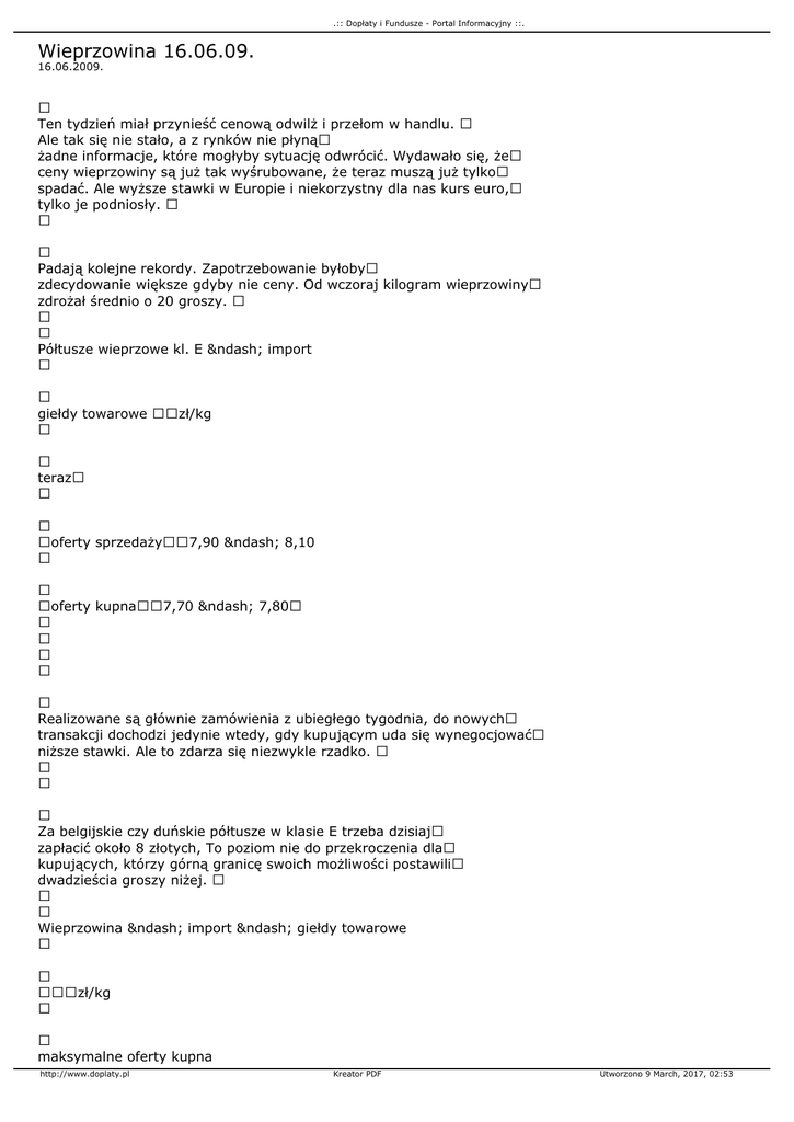 .:: Dopłaty i Fundusze - Portal Informacyjny ::. Wieprzowina 16.06.09. 16.06.2009. Ten tydzień miał przynieść cenową odwilż i przełom w handlu. Ale tak się nie stało, a z rynków nie płyną żadne informacje, które mogłyby sytuację odwrócić. Wydawało się, że ceny wieprzowiny są już tak wyśrubowane, że teraz muszą już tylko spadać. Ale wyższe stawki w Europie i niekorzystny dla nas kurs euro, tylko je podniosły. Padają kolejne rekordy. Zapotrzebowanie byłoby zdecydowanie większe gdyby nie ceny. Od wczoraj kilogram wieprzowiny zdrożał średnio o 20 groszy. Półtusze wieprzowe kl. E – import giełdy towarowe zł/kg teraz oferty sprzedaży7,90 – 8,10 oferty kupna7,70 – 7,80 Realizowane są głównie zamówienia z ubiegłego tygodnia, do nowych transakcji dochodzi jedynie wtedy, gdy kupującym uda się wynegocjować niższe stawki. Ale to zdarza się niezwykle rzadko. Za belgijskie czy duńskie półtusze w klasie E trzeba dzisiaj zapłacić około 8 złotych, To poziom nie do przekroczenia dla kupujących, którzy górną granicę swoich możliwości postawili dwadzieścia groszy niżej. Wieprzowina – import – giełdy towarowe zł/kg maksymalne oferty kupna http://www.doplaty.pl Kreator PDF Utworzono 9 March, 2017, 02:53 .:: Dopłaty i Fundusze - Portal Informacyjny ::. karkówka9,50 szynka8,20 oferty sprzedaży karkówka9,50 – 9,80 szynka8,20 – 8,50 Za półtuszami w górę poszybowały też notowania większości elementów. Tu także coraz rzadziej dochodzi do porozumienia. Producenci podnoszą cenniki, a przetwórcy polują na niższe stawki. I tak zapowiada się kolejny tydzień. Stella Norowska-Woldańska / TVP Informacje Rolnicze http://www.doplaty.pl Kreator PDF Utworzono 9 March, 2017, 02:53