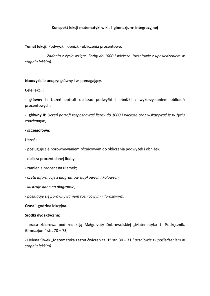 Konspekt lekcji matematyki w kl. I gimnazjum- integracyjnej Temat lekcji: Podwyżki i obniżki- obliczenia procentowe. Zadania z życia wzięte- liczby do 1000 i większe. (uczniowie z upośledzeniem w stopniu lekkim). Nauczyciele uczący: główny i wspomagający. Cele lekcji: - główny I: Uczeo potrafi obliczad podwyżki i obniżki z wykorzystaniem obliczeo procentowych; - główny II: Uczeo potrafi rozpoznawad liczby do 1000 i większe oraz wskazywad je w życiu codziennym; - szczegółowe: Uczeo: - posługuje się porównywaniem różnicowym do obliczania podwyżek i obniżek; - oblicza procent danej liczby; - zamienia procent na ułamek; - czyta informacje z diagramów słupkowych i kołowych; - ilustruje dane na diagramie; - posługuje się porównywaniem różnicowym i ilorazowym. Czas: 1 godzina lekcyjna. Środki dydaktyczne: - praca zbiorowa pod redakcją Małgorzaty Dobrowolskiej „Matematyka 1. Podręcznik. Gimnazjum” str. 70 – 73, - Helena Siwek „Matematyka zeszyt dwiczeo cz. 1” str. 30 – 31.( uczniowie z upośledzeniem w stopniu lekkim) Struktura i opis lekcji: Lp. Tok lekcji Czynności nauczyciela głównego Sprawdzenie obecności, podanie tematu lekcji. 1. 2. 3. 4. Sprawy organizacyjne Omówienie zadania domowego Przypomnienie wiadomości z poprzednich lekcji. Lekcja właściwa Wspólnie z uczniami omawia zadanie domowe, sprawdza poprawnośd obliczeo. Wraz z uczniami przypomina zamianę procentu na ułamek, obliczanie procentu danej liczby oraz pojęcia: obniżka i podwyżka procentowa. Pokazuje i omawia metody obliczania podwyżek i obniżek; Zadaje zadania, które uczniowie wspólnie z nim rozwiązują na tablicy; sprawdza poprawnośd zapisów; udziela dodatkowych wyjaśnieo; na bieżąco kontroluje pracę uczniów. Czynności nauczyciela wspomagającego Podanie tematu uczniom realizującym indywidualny program nauczania. Pomaga uczniom niepełnosprawnym przygotowad materiały do lekcji. Sprawdza i omawia zadanie domowe uczniów realizujących IPN. Rozpoczyna pracę z uczniami o specjalnych potrzebach edukacyjnych. Omawia i pomaga narysowad diagram i zaznaczyd na nim dane; pokazuje w jaki sposób należy odczytad dane z diagramów; nadzoruje pracę uczniów, naprowadza na poprawne rozwiązanie zadao. Pomaga uczniom niepełnosprawnym, udziela im dodatkowych wyjaśnieo, jak poprawnie obliczyd obniżki i podwyżki; nadzoruje ich pracę; pomaga wykonad Czynności uczniów Zapisują temat lekcji. Podają wyniki zadao; Problemy na jakie napotkali przy rozwiązywaniu zadania domowego. Udzielają odpowiedzi na pytania nauczyciela. Rozwiązują zadania na tablicy; zapisują je w zeszytach pracując samodzielnie. Rozwiązują zadania w zeszycie dwiczeo; rysują diagram i zamieszczają na nim dane, opisują diagramy słupkowe i kołowe. Opisują powiększone figury. Mierzą boki wielokątów i szacują „o ile” lub „ile razy” zostały powiększone. (Zrealizowad jeśli rysunki 5. Ocenia aktywnośd uczniów podczas lekcji, ich pracę przy tablicy. Podsumowuje lekcję. Podsumowanie Zadaje zadanie i ocena domowe. aktywności uczniów. Ocenia pracę uczniów realizujących IPN, wkleja do zeszytu naklejki motywujące do pracy; zadaje zadanie domowe. Pomaga uczniom niepełnosprawnym zapisad zadanie domowe i spakowad się. wystarczy czasu, kontynuowad temat na następnej lekcji). Udzielają odpowiedzi na pytania nauczyciela. Porządkują salę.