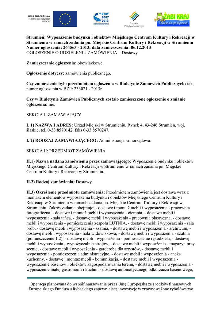 Strumień: Wyposażenie budynku i obiektów Miejskiego Centrum Kultury i Rekreacji w Strumieniu w ramach zadania pn. Miejskie Centrum Kultury i Rekreacji w Strumieniu Numer ogłoszenia: 264563 - 2013; data zamieszczenia: 06.12.2013 OGŁOSZENIE O UDZIELENIU ZAMÓWIENIA – Dostawy Zamieszczanie ogłoszenia: obowiązkowe. Ogłoszenie dotyczy: zamówienia publicznego. Czy zamówienie było przedmiotem ogłoszenia w Biuletynie Zamówień Publicznych: tak, numer ogłoszenia w BZP: 233021 - 2013r. Czy w Biuletynie Zamówień Publicznych zostało zamieszczone ogłoszenie o zmianie ogłoszenia: nie. SEKCJA I: ZAMAWIAJĄCY I. 1) NAZWA I ADRES: Urząd Miejski w Strumieniu, Rynek 4, 43-246 Strumień, woj. śląskie, tel. 0-33 8570142, faks 0-33 8570247. I. 2) RODZAJ ZAMAWIAJĄCEGO: Administracja samorządowa. SEKCJA II: PRZEDMIOT ZAMÓWIENIA II.1) Nazwa nadana zamówieniu przez zamawiającego: Wyposażenie budynku i obiektów Miejskiego Centrum Kultury i Rekreacji w Strumieniu w ramach zadania pn. Miejskie Centrum Kultury i Rekreacji w Strumieniu. II.2) Rodzaj zamówienia: Dostawy. II.3) Określenie przedmiotu zamówienia: Przedmiotem zamówienia jest dostawa wraz z montażem elementów wyposażenia budynku i obiektów Miejskiego Centrum Kultury i Rekreacji w Strumieniu w ramach zadania pn. Miejskie Centrum Kultury i Rekreacji w Strumieniu. Zakres zadania obejmuje: - dostawę i montaż mebli i wyposażenia - pracownia fotograficzna, - dostawę i montaż mebli i wyposażenia - ciemnia, - dostawę mebli i wyposażenia - sala tańca, - dostawę mebli i wyposażenia - pracownia plastyczna, - dostawę mebli i wyposażenia - pomieszczenia zespołu LUTNIA, - dostawę mebli i wyposażenia - sala prób, - dostawę mebli i wyposażenia - szatnia, - dostawę mebli i wyposażenia - archiwum, dostawę mebli i wyposażenia - hala widowiskowa, - dostawę mebli i wyposażenia - szatnia (pomieszczenie 1.2), - dostawę mebli i wyposażenia - pomieszczenie rękodzieła, - dostawę mebli i wyposażenia - wypożyczalnia strojów, - dostawę mebli i wyposażenia - magazyn przy scenie, - dostawę mebli i wyposażenia - garderoba dla artystów, - dostawę mebli i wyposażenia - pomieszczenia administracyjne, - dostawę mebli i wyposażenia - aneks kuchenny, - dostawę i montaż mebli - komunikacja, - dostawę mebli i wyposażenia wyposażenie basenów i obiektów zagospodarowania terenu, - dostawę mebli i wyposażenia wyposażenie małej gastronomi i kuchni, - dostawę automatycznego odkurzacza basenowego, Operacja planowana do współfinansowania przez Unię Europejską ze środków finansowych Europejskiego Funduszu Rybackiego zapewniającą inwestycje w zrównoważone rybołówstwo - dostawę systemu nagłośnienia obiektu z kompleksem basenowo- sportowym, technologii scenicznej wraz z oświetleniem scenicznym Sali Widowiskowej, sali prób i pomieszczenia dla chóru Lutnia, - roboty budowlano - instalacyjne. Operacja planowana jest do współfinansowania przez Unię Europejską ze środków finansowych Europejskiego Funduszu Rybackiego zapewniającą inwestycje w zrównoważone rybołówstwo. Szczegółowy opis przedmiotu zamówienia stanowi dokumentacja projektowa- część D niniejszej specyfikacji istotnych warunków zamówienia. UWAGA: Z dokumentacji dotyczącej systemu nagłośnienia obiektu z kompleksem basenowo- sportowym, technologii scenicznej wraz z oświetleniem scenicznym Sali Widowiskowej, sali prób i pomieszczenia dla chóru Lutnia należy wycenić wyłącznie elementy wyposażenia (nie należy wyceniać instalacji oraz jej elementów). II.4) Wspólny Słownik Zamówień (CPV): 39.10.00.00-3, 39.11.00.00-6, 39.13.00.00-2, 39.15.00.00-8, 45.21.20.00-6, 45.40.00.00-1, 45.42.11.53-1, 32.24.00.00-7, 51.11.00.00-6, 51.90.00.00-1, 32.34.00.00-8, 32.32.20.00-6, 32.35.20.00-5, 31.50.00.00-1, 32.42.40.00-1, 44.21.00.00-5. SEKCJA III: PROCEDURA III.1) TRYB UDZIELENIA ZAMÓWIENIA: Przetarg nieograniczony III.2) INFORMACJE ADMINISTRACYJNE • Zamówienie dotyczy projektu/programu finansowanego ze środków Unii Europejskiej: tak, projekt/program: Operacja planowana jest do współfinansowania przez Unię Europejską ze środków finansowych Europejskiego Funduszu Rybackiego zapewniającą inwestycje w zrównoważone rybołówstwo. SEKCJA IV: UDZIELENIE ZAMÓWIENIA IV.1) DATA UDZIELENIA ZAMÓWIENIA: 06.12.2013. IV.2) LICZBA OTRZYMANYCH OFERT: 4. IV.3) LICZBA ODRZUCONYCH OFERT: 1. IV.4) NAZWA I ADRES WYKONAWCY, KTÓREMU UDZIELONO ZAMÓWIENIA: • ELMAR Anna Karna, ul. 3-go Maja 1/3, 36-030 Błażowa, kraj/woj. podkarpackie. IV.5) Szacunkowa wartość zamówienia (bez VAT): 643865,24 PLN. IV.6) INFORMACJA O CENIE WYBRANEJ OFERTY ORAZ O OFERTACH Z NAJNIŻSZĄ I NAJWYŻSZĄ CENĄ • • Cena wybranej oferty: 798270,00 Oferta z najniższą ceną: 798270,00 / Oferta z najwyższą ceną: 1265731,89 Operacja planowana do współfinansowania przez Unię Europejską ze środków finansowych Europejskiego Funduszu Rybackiego zapewniającą inwestycje w zrównoważone rybołówstwo • Waluta: PLN. Operacja planowana do współfinansowania przez Unię Europejską ze środków finansowych Europejskiego Funduszu Rybackiego zapewniającą inwestycje w zrównoważone rybołówstwo