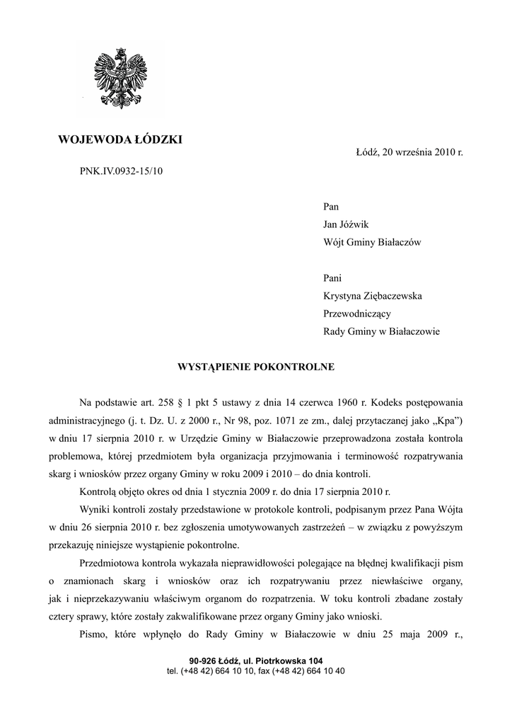 WOJEWODA Wojewoda ŁÓDZKI Łódzki Łódź, 20 września 2010 r. PNK.IV.0932-15/10 Pan Jan Jóźwik Wójt Gminy Białaczów Pani Krystyna Ziębaczewska Przewodniczący Rady Gminy w Białaczowie WYSTĄPIENIE POKONTROLNE Na podstawie art. 258 § 1 pkt 5 ustawy z dnia 14 czerwca 1960 r. Kodeks postępowania administracyjnego (j. t. Dz. U. z 2000 r., Nr 98, poz. 1071 ze zm., dalej przytaczanej jako „Kpa”) w dniu 17 sierpnia 2010 r. w Urzędzie Gminy w Białaczowie przeprowadzona została kontrola problemowa, której przedmiotem była organizacja przyjmowania i terminowość rozpatrywania skarg i wniosków przez organy Gminy w roku 2009 i 2010 – do dnia kontroli. Kontrolą objęto okres od dnia 1 stycznia 2009 r. do dnia 17 sierpnia 2010 r. Wyniki kontroli zostały przedstawione w protokole kontroli, podpisanym przez Pana Wójta w dniu 26 sierpnia 2010 r. bez zgłoszenia umotywowanych zastrzeżeń – w związku z powyższym przekazuję niniejsze wystąpienie pokontrolne. Przedmiotowa kontrola wykazała nieprawidłowości polegające na błędnej kwalifikacji pism o znamionach skarg i wniosków oraz ich rozpatrywaniu przez niewłaściwe organy, jak i nieprzekazywaniu właściwym organom do rozpatrzenia. W toku kontroli zbadane zostały cztery sprawy, które zostały zakwalifikowane przez organy Gminy jako wnioski. Pismo, które wpłynęło do Rady Gminy w Białaczowie w dniu 25 maja 2009 r., 90-926 Łódź, ul. Piotrkowska 104 tel. (+48 42) 664 10 10, fax (+48 42) 664 10 40 (zatytułowane: ,,interpelacja samorządowa’’), dotyczące podjęcia przez Wójta Gminy Białaczów działań w sprawie nielegalnego wysypiska śmieci, jest skargą na działalność wójta. Pismem z dnia 4 czerwca 2009 r. Przewodniczący Rady Gminy poinformował wnoszącego pismo o przekazaniu sprawy do załatwienia Wójtowi Gminy. Zgodnie z art. 7 ust. 1 pkt 3 ustawy z dnia 8 marca 1990 r. o samorządzie gminnym (j. t. Dz. U. z 2001 r., Nr 142, poz. 1591 ze zm.), utrzymanie czystości i porządku jest zadaniem własnym gminy. Zadania własne gminy, na podstawie art. 30 ust. 1 ustawy o samorządzie gminnym, wykonuje wójt. Zgodnie zatem z art. 229 pkt 3 Kpa, w przedmiotowej sprawie organem właściwym do rozpatrzenia skargi jest rada gminy. Pismo, które wpłynęło do Urzędu Gminy w Białaczowie w dniu 13 lipca 2010 r., dotyczące nieudzielenia informacji ustnej mieszkańcowi gminy odnośnie możliwości zatrudnienia w formie prac interwencyjnych, ze względu na charakter zawartych w nim zarzutów, jest skargą na działalność wójta. Zgodnie zatem z art. 231 w związku z art. 229 pkt 3 Kpa powinno nastąpić przekazanie do rozpatrzenia właściwemu organowi, tj. Radzie Gminy w Białaczowie z równoczesnym zawiadomieniem o tym skarżącego lub wskazanie skarżącemu właściwego organu. W dniu 7 czerwca 2010 r. do Rady Gminy w Białaczowie wpłynęło pismo Łódzkiego Urzędu Wojewódzkiego w Łodzi, którym przekazano, na podstawie art. 229 pkt 3 Kpa, do rozpatrzenia skargę na działalność Wójta Gminy Białaczów z zakresu pomocy społecznej. Zgodnie bowiem z art. 7 ust. 1 pkt 6 ustawy o samorządzie gminnym, zadania z zakresu pomocy społecznej należą do zadań własnych gminy, wykonywanych na podstawie art. 30 ust. 1 tej ustawy przez wójta gminy. Na skutek dekretacji Wójta Gminy sprawa została przekazana do Gminnego Ośrodka Pomocy Społecznej, w wyniku czego Dyrektor GOPS przekazał do Łódzkiego Urzędu Wojewódzkiego w Łodzi wyjaśnienia w przedmiotowej sprawie. Wobec nierozpatrzenia sprawy przez właściwy organ Wojewoda Łódzki skierował do Rady Gminy w Białaczowie pismo z dnia 27 lipca 2010 r. informując, że na podstawie art. 237 § 3 Kpa, skarżący winien być zawiadomiony o sposobie załatwienia skargi; ponadto, zgodnie z orzecznictwem sądów administracyjnych, sprawa winna być załatwiona przez Radę Gminy w formie uchwały. W dniu przeprowadzenia kontroli sprawa nie została jeszcze rozpatrzona. Pismo, które wpłynęło do Urzędu Gminy w Białaczowie w dniu 21 lipca 2010 r. dotyczy zwolnienia z podatku od nieruchomości. Pismo nie stanowi skargi ani wniosku w rozumieniu działu VIII Kpa, w związku z czym powinno zostać rozpatrzone w oparciu o przepisy ustawy z dnia 29 sierpnia 1997 r. Ordynacja podatkowa (Dz. U. z 2005 r., Nr 8, poz. 60 ze zm.) w związku z ustawą z dnia 12 stycznia 1991 r. o podatkach i opłatach lokalnych (Dz. U. z 2010 r., Nr 95, poz. 613). 90-926 Łódź, ul. Piotrkowska 104 tel. (+48 42) 664 10 10, fax (+48 42) 664 10 40 Jak wynika z wyjaśnień udzielonych w toku kontroli, błędna kwalifikacja wyżej przedstawionych pism jako wniosków w rozumieniu art. 241 Kpa wynikała z: decyzji radcy prawnego, tytułu pisma, czy też decyzji Wójta, podjętej po wcześniejszych rozmowach z wnoszącym. Przyczyną powstania ww. nieprawidłowości w przedmiocie kwalifikacji pism jest niestosowanie przepisu art. 222 Kpa, wskazującego, że o kwalifikacji pisma jako skargi albo wniosku decyduje treść, nie zaś jego forma zewnętrzna. W przepisach art. 227 i 241 Kpa określony został zakres przedmiotowy spraw, według którego organ decyduje o tym, czy pismo jest skargą, czy też wnioskiem. Należy zaznaczyć, że w przypadku ustalania organów właściwych do rozpatrywania skarg zastosowanie ma przepis art. 229 Kpa. Z kolei regulacja zawarta w art. 242 Kpa implikuje fakt, iż pisma zakwalifikowane jako wnioski powinny być rozpatrywane przez organy właściwe ze względu na przedmiot wniosku oraz zakres kompetencji organu, którego dotyczy pismo. W kontekście wyżej przedstawionych nieprawidłowości należy także wskazać, iż zgodnie z brzmieniem art. 231 (w przypadku skarg) oraz 243 Kpa (w przypadku wniosków), pismo należy przekazać celem rozpatrzenia organowi właściwemu w sytuacji, gdy organ, do którego je skierowano, nie jest właściwy do rozpatrzenia. Kontrola wykazała także nieprawidłowości polegające na nienadawaniu lub stosowaniu niewła