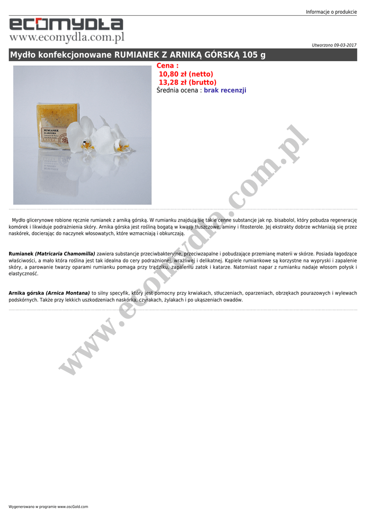 Informacje o produkcie Utworzono 09-03-2017 Mydło konfekcjonowane RUMIANEK Z ARNIKĄ GÓRSKĄ 105 g Cena : 10,80 zł (netto) 13,28 zł (brutto) m yd la . co m .p l Średnia ocena : brak recenzji Mydło glicerynowe robione ręcznie rumianek z arniką górską. W rumianku znajdują się takie cenne substancje jak np. bisabolol, który pobudza regenerację komórek i likwiduje podrażnienia skóry. Arnika górska jest rośliną bogatą w kwasy tłuszczowe, aminy i fitosterole. Jej ekstrakty dobrze wchłaniają się przez naskórek, docierając do naczynek włosowatych, które wzmacniają i obkurczają. co Rumianek (Matricaria Chamomilla) zawiera substancje przeciwbakteryjne, przeciwzapalne i pobudzające przemianę materii w skórze. Posiada łagodzące właściwości, a mało która roślina jest tak idealna do cery podrażnionej, wrażliwej i delikatnej. Kąpiele rumiankowe są korzystne na wypryski i zapalenie skóry, a parowanie twarzy oparami rumianku pomaga przy trądziku, zapaleniu zatok i katarze. Natomiast napar z rumianku nadaje włosom połysk i elastyczność. w w w .e Arnika górska (Arnica Montana) to silny specyfik, który jest pomocny przy krwiakach, stłuczeniach, oparzeniach, obrzękach pourazowych i wylewach podskórnych. Także przy lekkich uszkodzeniach naskórka, czyrakach, żylakach i po ukąszeniach owadów. Wygenerowano w programie www.oscGold.com