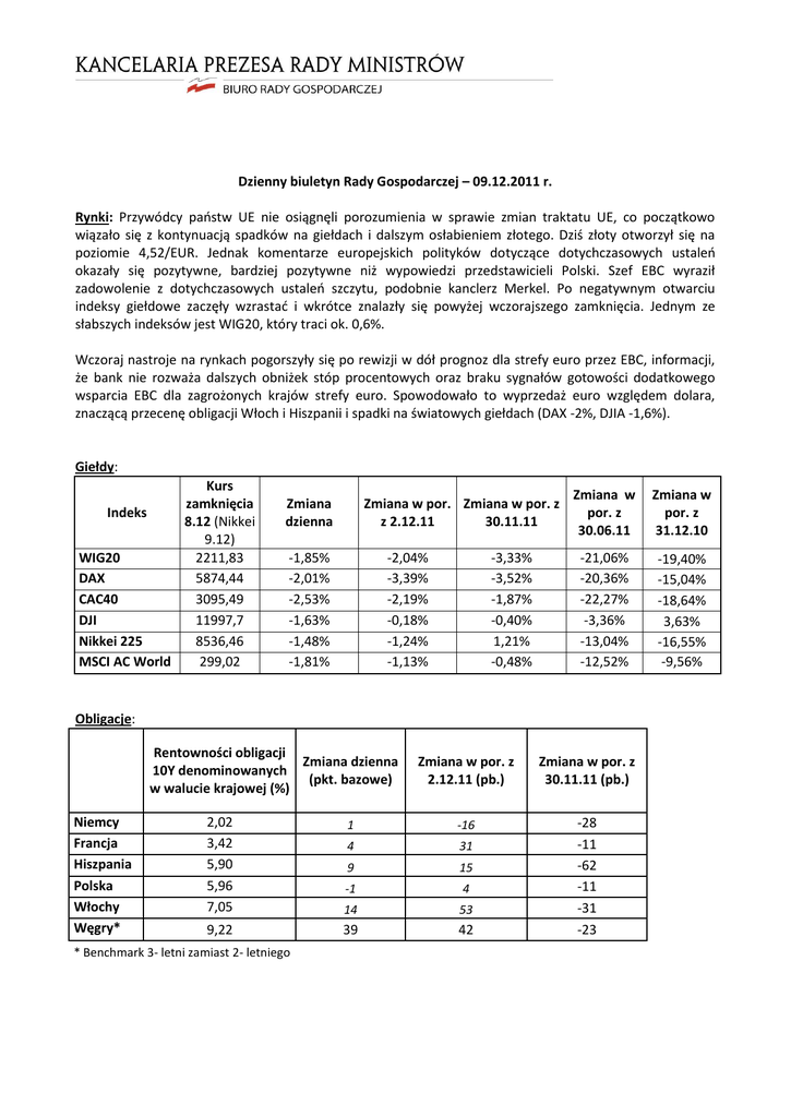 Dzienny biuletyn Rady Gospodarczej – 09.12.2011 r. Rynki: Przywódcy paostw UE nie osiągnęli porozumienia w sprawie zmian traktatu UE, co początkowo wiązało się z kontynuacją spadków na giełdach i dalszym osłabieniem złotego. Dziś złoty otworzył się na poziomie 4,52/EUR. Jednak komentarze europejskich polityków dotyczące dotychczasowych ustaleo okazały się pozytywne, bardziej pozytywne niż wypowiedzi przedstawicieli Polski. Szef EBC wyraził zadowolenie z dotychczasowych ustaleo szczytu, podobnie kanclerz Merkel. Po negatywnym otwarciu indeksy giełdowe zaczęły wzrastad i wkrótce znalazły się powyżej wczorajszego zamknięcia. Jednym ze słabszych indeksów jest WIG20, który traci ok. 0,6%. Wczoraj nastroje na rynkach pogorszyły się po rewizji w dół prognoz dla strefy euro przez EBC, informacji, że bank nie rozważa dalszych obniżek stóp procentowych oraz braku sygnałów gotowości dodatkowego wsparcia EBC dla zagrożonych krajów strefy euro. Spowodowało to wyprzedaż euro względem dolara, znaczącą przecenę obligacji Włoch i Hiszpanii i spadki na światowych giełdach (DAX -2%, DJIA -1,6%). Giełdy: Kurs zamknięcia Indeks 8.12 (Nikkei 9.12) WIG20 2211,83 DAX 5874,44 CAC40 3095,49 DJI 11997,7 Nikkei 225 8536,46 MSCI AC World 299,02 Zmiana dzienna Zmiana w por. Zmiana w por. z z 2.12.11 30.11.11 -1,85% -2,01% -2,53% -1,63% -1,48% -1,81% -2,04% -3,39% -2,19% -0,18% -1,24% -1,13% -3,33% -3,52% -1,87% -0,40% 1,21% -0,48% Zmiana w por. z 30.06.11 Zmiana w por. z 31.12.10 -21,06% -20,36% -22,27% -3,36% -13,04% -12,52% -19,40% -15,04% -18,64% 3,63% -16,55% -9,56% Obligacje: Rentowności obligacji Zmiana dzienna 10Y denominowanych (pkt. bazowe) w walucie krajowej (%) Niemcy Francja Hiszpania Polska Włochy Węgry* Zmiana w por. z 2.12.11 (pb.) Zmiana w por. z 30.11.11 (pb.) 1 -16 4 31 9 15 -28 -11 -62 -11 -31 -23 2,02 3,42 5,90 5,96 7,05 -1 4 14 53 9,22 39 42 * Benchmark 3- letni zamiast 2- letniego Waluty: Waluty EUR-PLN CHF-PLN USD-PLN EUR-USD EUR-CHF EUR-HUF CHF-USD Kurs Zmiana dzienna Zmiana w por. z 2.12.11 Zmiana w por. z 30.11.11 Zmiana w por. z 30.06.11 Zmiana w por. z 31.12.10 4,52 3,67 3,40 1,33 1,23 307,89 1,08 0,21% 0,46% 0,35% -0,25% -0,22% 0,72% -0,03% 0,66% 0,76% 1,26% -0,60% -0,07% 1,40% -0,52% 0,48% -0,10% 1,54% -0,97% 0,36% 1,20% -1,32% 13,59% 12,58% 23,91% -8,15% 1,10% 15,78% -9,14% 14,42% 15,86% 14,87% -0,57% -1,44% 10,86% 0,91% UE: O 5 rano szefowie paostw i rządów przerwali pierwszy dzieo szczytu w Brukseli. Z powodu oporu Wielkiej Brytanii żądającej traktatowych wyjątków dla londyoskiego City oraz Czech, Węgier i Szwecji, nowe zasady dyscypliny finansów publicznych zostaną wprowadzone umową międzyrządową 17 paostw strefy euro oraz 6 innych, w tym Polski. Dziś o 11.00 zostanie wznowiona dyskusja o szczegółach porozumienia w gronie zainteresowanych paostw, Czechy i Szwecja mogą dołączyd po konsultacji parlamentów narodowych. Przewodniczący Rady Europejskiej H. v. Rompuy poinformował, że paostwa strefy euro i inne kraje UE wzmocnią MFW kwotą do 200 mld EUR, by wspierał zadłużone gospodarki strefy euro. Środki mają zostad uwolnione w lipcu 2012 r. Z najnowszej rundy stress-testów opublikowanych wczoraj przez Europejski Urząd Nadzoru Bankowego (EBA) wynika, że europejskie banki potrzebują prawie 115 mld EUR nowego kapitału. Dane: ECB obniżył wczoraj zgodnie z oczekiwaniami główną stopę procentową o 0,25 pb. do 1%. Na konferencji prasowej szef EBC M. Draghi nie zasygnalizował zwiększenia programu skupu obligacji zadłużonych krajów strefy euro i sprostował wcześniejszą wypowiedź na ten temat. Powiedział, że nie są rozważane kolejne obniżki stóp. EBC prognozuje tempo wzrostu PKB w 2012 r. między -0,4% a 1%, w 2013 r. w przedziale 0,3-2,3%. M. Draghi zapowiedział jednak szereg dodatkowych działao, by wesprzed rynek pieniężny i rynek kredytowy EBC przeprowadzi dwie 3-letnie operacje zasilające, z możliwością wcześniejszej spłaty po roku. Stopa rezerw obowiązkowych została obniżona z 2% do 1%, ponadto złagodzeniu ulegną kryteria dla instrumentów finansowych przyjmowanych jako zabezpieczenie w transakcjach z EBC. Współpraca: Departament Analiz Strategicznych KPRM