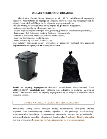 ZASADY SEGREGACJI ODPADÓW Mieszkańcy Gminy Nowy Korczyn w ok. 95 % zadeklarowali segregację odpadów. Pozostałości po segregacji (odpady, które nie dają się posegregować), tj. odpady, które nie kwalifikują się do odpadów segregowanych, np. -mokry, brudny, w szczególności tłusty papier, np. po maśle, margarynie, - zatłuszczona butelka po oleju spożywczym, - zużyte artykuły higieniczne (jak wata, pieluchy, podpaski, chusteczki higieniczne,) - lakierowany lub foliowany papier z folderów reklamowych, - ceramika, porcelana, szkło kryształowe, szkło z luster, - naczynia żaroodporne, miski, talerze, - szkło stołowe, np. szklanki, kieliszki, itp. oraz odpady zmieszane należy gromadzić w czarnych workach lub czarnych pojemnikach zakupionych we własnym zakresie. Worki na odpady segregowane dostarcza właścicielom nieruchomości Firma ,,TRANS-BUD” bezpłatnie przy odbiorze ww. odpadów w systemie ,,worek za worek”. Dodatkowe worki na odpady segregowane są do nabycia u sołtysów lub w Urzędzie Gminy. WOREK NA ODPADY ULEGAJĄCE BIODEGRADACJI Mieszkańcy Gminy Nowy Korczyn, którzy zadeklarowali selektywna zbiórkę odpadów oraz nieselektywną zbiórkę odpadów a nie posiadają przydomowego kompostownika (specjalnie przystosowane urządzenie służące do gromadzenia i unieszkodliwiania odpadów ulegających biodegradacji) odpady biodegradowalne powinni wrzucać do brązowego worka zakupionego we własnym zakresie. NALEŻY WRZUCAĆ: - resztki żywności - obierki z owoców i warzyw, -skorupki jaj, - fusy po kawie, herbacie, - skoszoną trawę, liście, kwiaty, łodygi, - drobne gałęzie, trociny, NIE NALEŻY WRZUCAĆ: - odpadów z tworzyw sztucznych - popiołu z kominka lub pieca - gruzu -kości zwierząt, - oleju jadalnego, - mięsa i padliny zwierząt, - drewna, - leków, -piasku, kamieni, -odchodów zwierząt, - papieru i kartonu. NIEBIESKI WOREK NA PAPIER WRZUCAMY: -gazety, czasopisma - papier szkolny, biurowy, listy -książki w miękkich okładkach lub z usuniętymi twardymi brzegami - zeszyty, - pudełka kartonowe i tekturowe - worki i torebki papierowe, papier opakowaniowy, NIE WRZUCAMY: - zabrudzonego lub tłustego papieru, np. po maśle, twarogu. -papieru woskowego (pergaminowego), - lakierowanego lub foliowanego papieru, np. z folderów reklamowych, - opakowań z zawartością, np. żywnością, wapnem, cementem, - ścinki drukarskie, - papieru termicznego i faksowego, kalki technicznej i papierów przebitkowych (rachunki, faktury), - kartonów po mleku, sokach i innych napojach (tzw. tetra paków), -papierowych wkładów wodoodpornych, tapet, worków po cemencie, - opakowań po jajkach - odbitek fotograficznych, - pieluch jednorazowych, podpasek i artykułów higienicznych. Pamiętaj! Zanim wrzucisz – postaraj się usunąć wszystkie części, które nie są z papieru, np. spinacze, zszywki, klamerki, taśmy samoprzylepne, sznurki. Oczyść papier z resztek produktów. Złóż kartony tak, aby zajmowały jak najmniej miejsca. ZIELONY WOREK NA SZKŁO WRZUCAMY: - bezbarwne i kolorowe butelki i słoiki szklane po napojach i żywności - butelki po napojach alkoholowych - słoiki (bez nakrętek, zacisków, gumowych uszczelek) - szklane opakowania po kosmetykach Pamiętaj! NIE WRZUCAMY: - opakowań po lekarstwach, - termometrów, rtęciówek, strzykawek, - szkła okularowego, zbrojonego, szkła okiennego i szyb samochodowych, -szkła żaroodpornego i kryształowego, - żarówek, świetlówek, reflektorów, lamp neonowych, fluorescencyjnych i rtęciowych, - ekranów i lamp telewizyjnych, - luster, - ceramiki, fajansu, porcelany, - szkła gospodarczego, jak szklane miski, talerze, doniczki, itp. - zniczy, kapsli, korków, kokard z ołowiu np. z butelek po szampanie, zatyczek i zakrętek, - szkła gospodarczego (misek szklanych, talerzy, figurek, doniczek, itp.) - szkła laboratoryjnego. Nie tłucz szkła przed wrzuceniem. Wyrzucaj puste opakowania. Zdejmij pokrywkę lub zakrętkę, krążek z szyjki butelki. ŻÓŁTY WOREK NA ODPADY Z TWORZYW SZTUCZNYCH WRZUCAMY: - puste butelki plastikowe po różnych napojach, -puste plastikowe opakowania po kosmetykach, chemii gospodarczej i środkach czystości, -plastikowe opakowania po żywności (kubki po jogurtach, serach, kefirach, margarynach, koszyczki po owocach), -opakowania wielomateriałowe typu tetra pak (kartony po płynnej żywności, np. mleku, sokach) NIE WRZUCAMY: - opakowań po lekach, - tworzyw sztucznych zastosowania medycznego, np. sprzętu infuzyjnego, zużytych strzykawek, - mokrych folii, butelek i pojemników z jakąkolwiek zawartością, - opakowań i butelek po olejach samochodowych i silnikowych, smarach, płynach chłodniczych, - opakowań po nawozach, środkach owado- i chwastobójczych, - folia i torebki z tworzyw sztucznych, również po kawie i po chipsach, - reklamówki, zakrętki, - czyste kanistry plastikowe, - opakowania stalowe i aluminiowe, tj. puszki po napojach, puszki po konserwach, kapsle, - drobny złom żelazny oraz drobny złom metali kolorowych, np. druty, nakrętki do słoików, - plastikowe i metalowe zabawki, miski, itp. -tworzyw sztucznych nieprzeznaczonych na opakowania, np. taśm klejących, klocków lego, węży ogrodowych, - gumy, styropianu, - tworzyw piankowych i styropianu, - sprzętu AGD, baterii, - opakowań po aerozolach, - butelek z jakąkolwiek zawartością, - puszek i pojemników po farbach. Pamiętaj! Opróżnij opakowania z resztek produktów. Zdejmij nakrętki i krążki z szyjek butelek. Butelki i kartony zgnieć przed wrzuceniem. Zgnieć puszkę i butelkę. Pamiętaj ! Do recyklingu nadają się tylko czyste, suche i niezatłuszczone odpady opakowaniowe. Im więcej odpadów uda się wyselekcjonować i przekazać do powtórnego przetworzenia, tym mniej miejsca będą zajmowały tak uciążliwe wysypiska śmieci i w tym lepszym stanie będzie środowisko naturalne. Segreguj odpady opakowaniowe i zachęcaj do tego członków Twojej rodziny, znajomych