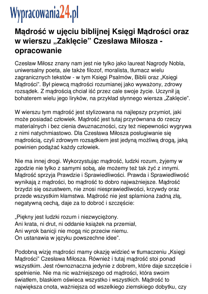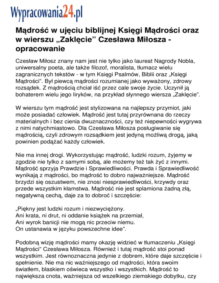 Mądrość w ujęciu biblijnej Księgi Mądrości oraz w wierszu „Zaklęcie” Czesława Miłosza opracowanie Czesław Miłosz znany nam jest nie tylko jako laureat Nagrody Nobla, uniwersalny poeta, ale także filozof, moralista, tłumacz wielu zagranicznych tekstów - w tym Księgi Psalmów, Biblii oraz „Księgi Mądrości”. Był piewcą mądrości rozumianej jako wyważony, zdrowy rozsądek. Z mądrością chciał iść przez cale swoje życie. Uczynił ją bohaterem wielu jego liryków, na przykład słynnego wiersza „Zaklęcie”. W wierszu tym mądrość jest stylizowana na najlepszy przymiot, jaki może posiadać człowiek. Mądrość jest tutaj przyrównana do rzeczy materialnych i bez cienia dwuznaczności, czy też niepewności wygrywa z nimi natychmiastowo. Dla Czesława Miłosza posługiwanie się mądrością, czyli zdrowym rozsądkiem jest jedyną możliwą drogą, jaką powinien podążać każdy człowiek. Nie ma innej drogi. Wykorzystując mądrość, ludzki rozum, żyjemy w zgodzie nie tylko z samymi sobą, ale możemy też tak żyć z innymi. Mądrość sprzyja Prawdzie i Sprawiedliwości. Prawda i Sprawiedliwość wynikają z mądrości, bo mądrość to dobro najważniejsze. Mądrość brzydzi się oszustwem, nie znosi niesprawiedliwości, krzywdy oraz przede wszystkim kłamstwa. Mądrość nie jest splamiona żadną złą, negatywną cechą, daje za to dobroć i szczęście: „Piękny jest ludzki rozum i niezwyciężony. Ani krata, ni drut, ni oddanie książek na przemiał, Ani wyrok banicji nie mogą nic przeciw niemu. On ustanawia w języku powszechne idee”. Podobną wizję mądrości mamy okazję widzieć w tłumaczeniu „Księgi Mądrości” Czesława Miłosza. Również i tutaj mądrość stoi ponad wszystkim. Jest równoznaczna jedynie z dobrem, które daje szczęście i spełnienie. Nie ma nic ważniejszego od mądrości, która swoim światłem, blaskiem oświeca wszystko i wszystkich. Mądrość to największa cnota, ważniejsza od wszelkiego ziemskiego dobytku, czy też dóbr materialnych, do których człowiek przywiązuje się zupełnie bezmyślnie. Mądrość jest czymś trwałym. Wszelkie natomiast bogactwa, dobra materialne utracimy, gdy umrzemy. Mądrość jest nie tylko dobra, ale i użyteczna. Rozsądny człowiek powinien mądrość cenić, pielęgnować, dbać o nią. „Wszelkie dobra przyszły z nią razem do mnie i niepoliczone bogactwa wziąłem z jej rąk” - mądrość jest źródłem prawdziwego bogactwa, nie tego materialnego, ale duchowego, niewidzialnego, ale wyczuwalnego. Mądrość każdego człowieka rozwija duchowo, mnożąc dobro. Mądrość w „Księdze Mądrości” w tłumaczeniu Czesława Miłosza to ostoja człowieka, bez niej trudno jest żyć. To ona kształtuje człowieka, tworzy go i wypełnia. Nie ma nic bardziej wartościowego od mądrości, która mnoży się, rozdziela, oddając jedynie dobro, sprawiedliwość. To źródło wszystkiego, co najlepsze. Mądrość należy mieć w sobie, aby móc być dobrym człowiekiem. Zarówno wiersz Czesława Miłosza pod tytułem „Zaklęcie”, jak i tłumaczenie „Księgi Mądrości” tego samego autora to dwa, nieco odmienne spojrzenia na temat mądrości. W obu przypadkach widzimy wyraźne gloryfikowanie tego przymiotu. Jednoznacznie możemy twierdzić, że Miłosz w każdym przypadku jest gorliwym piewcą mądrości i ludzkiego rozumu. Mądrość pomaga człowiekowi we wszystkim, jeżeli ten pragnie odbudować się duchowo. Jest źródłem i przyczyną wszystkiego, co dobre, sprawiedliwe, odpowiednie. Mądrość to jedyna poprawna droga życia każdego człowieka, zdaje się mówić polski poeta. Zachęca nas do podążania za nią, do samodoskonalenia się.