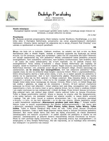 Biuletyn Parafialny Żory – Warszowice Listopad 2010 (nr 17) Hasło miesiąca: Rozsądzać będzie narody i rozstrzygać sprawy wielu ludów. I przekują swoje miecze na lemiesze, a swoje włócznie na sierpy. /Iz 2,4a/ Powitanie Po dłuższej przerwie proponujemy Wam kolejny numer Biuletynu Parafialnego, a w nim kilka słów o Pamiątce Reformacji, przyjrzymy się coraz popularniejszym obchodom Halloween. Chcemy także zachęcić do włączenia się w akcję „Prezent Pod Choinkę” oraz udziału w spotkaniach w naszych parafiach. SS Długo nie było ich w kościele. Całkiem możliwe, że ostatni raz byli w nim na Boże Narodzenie albo w Wielki Piątek. Jednak w telewizji pojawiła się dyskusja na temat Krzyża. Co On oznacza, czego jest symbolem i jakie ma On znaczenie dla ludzi? Również oni zaczęli zastanawiać się, kim jesteśmy? Wtedy uświadomili sobie jesteśmy przecież ewangelikami. Tam zostaliśmy ochrzczeni, tam byliśmy konfirmowani, tam braliśmy ślub i od czasu do czasu pokazujemy się w tym kościele. Co to jednak znaczy być ewangelikiem? Teraz siedzą w kościele z okazji Święta Reformacji jak najdalej od księdza. Jeżeli to możliwe to w ostatnim rzędzie. Nagle wszyscy zaczynają śpiewać hymn Reformacji również i oni, przecież uczyli się go na lekcjach religii. Znowu zaczynają się zastanawiać, co to znaczy być ewangelikiem, kim tak właściwie jesteśmy? Nagle zapada cisza, bo oto na ambonie staje ksiądz i zaczyna mówić. Mówi o usprawiedliwieniu, które otrzymujemy darmo z łaski przez wiarę, o tym, że w żaden sposób nie jesteśmy w stanie na to zapracować. Jest w tym niesamowita głębia. Mianowicie Bóg nas kocha i wystarczy tylko się na Nim opierać i w Niego uwierzyć. Bóg mieszka także w Jezusie wiszącym z przodu na Krzyżu i choć na to nie wygląda jest umiłowanym Synem Boga. Ksiądz mówi dalej teraz nawiązując do Jezusa i Krzyża. Mówi o tym, iż miłość Boga jest tak wielka i głęboka, że sięga aż do cierpienia i śmierci. W tym samym momencie pokazuje na Krzyż nad ołtarzem i mówi właśnie tam jest Bóg, szczególnie tam. Często zapominamy o tym, że mamy mieć w sercu właśnie Krzyż, bo on mówi o wielkiej miłości i po części wymusza na nas wdzięczność i miłość do Boga. Przez śmierć Jezusa na krzyżu, Bóg pokazał nam, jak zdobyć jego miłość: mamy patrzeć tylko na Jezusa Chrystusa. Tylko w Niego powinniśmy wierzyć. Wiara w Jezusa, to znaczy ufać Mu bezgranicznie, a nie sobie samym, nie pokładać nadziei we własne wysiłki, w nasze dobre uczynki i zasługi. Tak jak Luter rzucał w szatana atramentem tak i my winniśmy pamiętać o Krzyżu i o tym, co się tam dokonało i co to dla nas znaczy. Wtedy będziemy mogli w pełni świadomie zaśpiewać „Warownym grodem jest nam Bóg…”. Ksiądz doktor Marcin Luter w swych wypowiedziach był bardzo bezkompromisowy i tak samo jest z głównymi zasadami luteranizmu. Tylko Pismo, tylko Jezus, tylko Wiara, Tylko Łaska. Tylko w Piśmie Świętym Bóg mówi do nas. Tylko przez Jezusa Chrystusa jesteśmy zbawieni. Tylko z łaski Boga poprzez naszą wiarę w Jezusa Chrystusa jesteśmy zbawieni. Być może dzięki temu uda nam się lepiej zrozumieć, że nasze zbawienie zawdzięczamy nie naszym uczynkom i w żaden sposób nie jesteśmy w stanie na nie zasłużyć. Zawdzięczamy je jedynie śmierci męczeńskiej Jezusa Chrystusa na Krzyżu. Może to nam pomoże lepiej zrozumieć, co tak naprawdę znaczy być ewangelikiem i co świętujemy w dniu Święta Reformacji. Ale tak naprawdę, za co każdego dnia winniśmy być wdzięczni i co powinno nas cieszyć ML Co z tym Halloween? Ostatni już październikowy wieczór. Grupy poprzebieranych dzieci chodzą od drzwi do drzwi i proszą o słodycze. Taki obraz zapewne niejednokrotnie widzieliśmy w jakimś amerykańskim filmie. Ale od kilku lat Halloween staje się coraz popularniejsze także w naszym kraju. Jedno święto więcej czy mniej – myślą niektórzy – przecież dzieci i u nas świetnie się bawią w ten dzień. Pamiętajmy jednak, że pierwotnie dzień ten miał służyć do składania krwawych ofiar z dzieci, by w ten sposób ochronić się przed zagubionymi i błąkającymi się po świecie duszami zmarłych. Bałwochwalstwo w czystej formie! A nasze dzieci zachęca się, by brały udział w zabawach z okazji Halloween i traktuje to jako coś wesołego i niegroźnego. Zapytasz może: No dobra, ale do czego właściwie zmierzasz? A moim pytaniem będzie: Co ty sądzisz o Halloween? Biblia mówi, że wszystko, „cokolwiek czynimy, mamy czynić jak dla Pana a nie dla ludzi” (Kol. 3,23). Kolejne więc pytanie brzmi: czy to, co ty robisz, uwielbia Boga i oddaje Mu chwałę? Bóg istnieje i jest wszechobecny. Wie co robisz, mówisz i myślisz w każdym momencie swojego życia. On powiedział w Swoim Słowie, że jest Bogiem zazdrosnym i dlatego jedno z przykazań sformułował: „Nie będziesz miał innych bogów obok mnie” (2.Mojż. 20,3). Jednak każdy z nas zgrzeszył w tym punkcie. Wiele rzeczy staje się w naszym życiu ważniejszymi od Boga – niektórymi tylko z naszych bożków są np.: telewizja, internet, imprezy czy praca. A im mniej Boga w naszej codzienności, tym większa obojętność i bezkrytyczny stosunek do „nowinek” ze świata. Bez społeczności z Bogiem w modlitwie i czytaniu Biblii tracimy duchową wrażliwość i bardzo łatwo dajemy się manipulować szatanowi, który „chodzi wokoło jak lew ryczący, szukając kogo by pochłonąć” (1.Piotra 5,8). Nie dajmy się zwieść serwowanym przez media modnym trendom. Halloween jest jednym z nich! Pamiętajmy, że ostatni dzień października to także Święto Reformacji – święto, które przypomina nam między innymi o prawdziwości, aktualności i zwycięskim działaniu Słowa Bożego – Biblii. „Bo Słowo Boże jest żywe i skuteczne, ostrzejsze niż wszelki miecz obosieczny, przenikające aż do ro