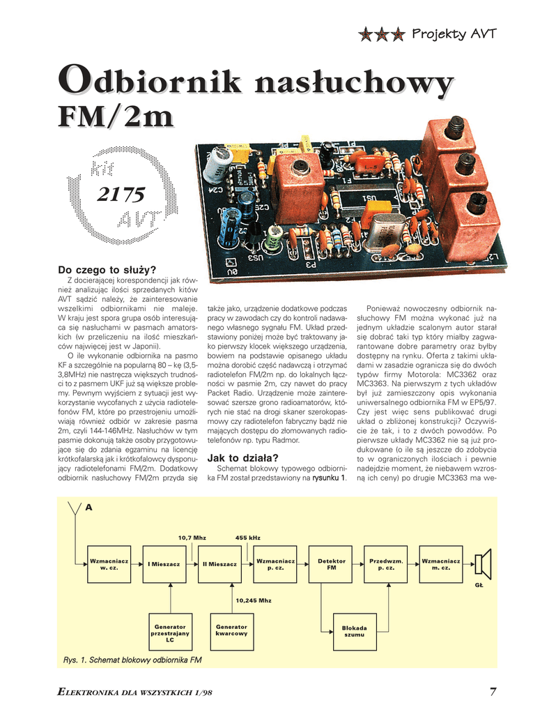 Projekty AVT O dbior nik nasłuchowy FM/2m 2175 Do czego to służy? Z docierającej korespondencji jak rów− nież analizując ilości sprzedanych kitów AVT sądzić należy, że zainteresowanie wszelkimi odbiornikami nie maleje. W kraju jest spora grupa osób interesują− ca się nasłuchami w pasmach amators− kich (w przeliczeniu na ilość mieszkań− ców najwięcej jest w Japonii). O ile wykonanie odbiornika na pasmo KF a szczególnie na popularną 80 – kę (3,5− 3,8MHz) nie nastręcza większych trudnoś− ci to z pasmem UKF już są większe proble− my. Pewnym wyjściem z sytuacji jest wy− korzystanie wycofanych z użycia radiotele− fonów FM, które po przestrojeniu umożli− wiają również odbiór w zakresie pasma 2m, czyli 144−146MHz. Nasłuchów w tym pasmie dokonują także osoby przygotowu− jące się do zdania egzaminu na licencję krótkofalarską jak i krótkofalowcy dysponu− jący radiotelefonami FM/2m. Dodatkowy odbiornik nasłuchowy FM/2m przyda się także jako, urządzenie dodatkowe podczas pracy w zawodach czy do kontroli nadawa− nego własnego sygnału FM. Układ przed− stawiony poniżej może być traktowany ja− ko pierwszy klocek większego urządzenia, bowiem na podstawie opisanego układu można dorobić część nadawczą i otrzymać radiotelefon FM/2m np. do lokalnych łącz− ności w pasmie 2m, czy nawet do pracy Packet Radio. Urządzenie może zaintere− sować szersze grono radioamatorów, któ− rych nie stać na drogi skaner szerokopas− mowy czy radiotelefon fabryczny bądź nie mających dostępu do złomowanych radio− telefonów np. typu Radmor. Jak to działa? Schemat blokowy typowego odbiorni− ka FM został przedstawiony na rysunku 1. Ponieważ nowoczesny odbiornik na− słuchowy FM można wykonać już na jednym układzie scalonym autor starał się dobrać taki typ który miałby zagwa− rantowane dobre parametry oraz byłby dostępny na rynku. Oferta z takimi ukła− dami w zasadzie ogranicza się do dwóch typów firmy Motorola: MC3362 oraz MC3363. Na pierwszym z tych układów był już zamieszczony opis wykonania uniwersalnego odbiornika FM w EP5/97. Czy jest więc sens publikować drugi układ o zbliżonej konstrukcji? Oczywiś− cie że tak, i to z dwóch powodów. Po pierwsze układy MC3362 nie są już pro− dukowane (o ile są jeszcze do zdobycia to w ograniczonych ilościach i pewnie nadejdzie moment, że niebawem wzros− ną ich ceny) po drugie MC3363 ma we− Rys. 1. Schemat blokowy odbiornika FM ELEKTRONIKA DLA WSZYSTKICH 1/98 7 Projekty AVT wnątrz swojej struk− tury także wzmac− niacz w.cz. co znacz− nie upraszcza kon− strukcję (większa jest od razu czułość urzą− dzenia) MC3363 jest jednoukładowym wąskopasmowym odbiornikiem VHF− FM małej mocy. W jego skład wcho− dzi odbiornik z po− dwójną przemianą (rrysunek 2) zawiera− jący: Rys. 2. Schemat blokowy struktury wewnętrznej MC3363 (dostępny tylko w wersji SMD) – tranzystor wzmac− niacza w.cz. Układ MC 3363 ma także bufor wy− – szerokie pasmo częstotliwości we− – 2 oscylatory jściowych: do 200MHz z oscylatorem – 2 mieszacze (mieszacze dla zmniejsze− jściowy pierwszego oscylatora lokalnego lokalnym (450MHz z oscylatorem ze− nia częstotliwości pasożytniczych są do ewentualnej współpracy z układem wnętrznym) syntezera częstotliwości, a także kompa− podwójnie zrównoważone) rator selekcji danych dla detektora FSK. – małe napięcie zasilania: 2,0...6,0V – wzmacniacz p.cz. Ten ostatni układ może być przydatny – mały pobór prądu zasilania – dyskryminator kwadraturowy – układ wysterowania miernika/detekto− właśnie do pracy emisjami cyfrowymi jak – dobra czułość: ok. 0,3µV przy (SINAD 12dB) z wewnętrznym tranzystorem Packet Radio, SSTV, RTTY, AMTOR. ra poziomu nośnej wzmacniacza w.cz. A oto właściwości układu MC3363: – układ blokady szumu. Rys. 3. Schemat elektryczny odbiornika nasłuchowego FM/2m 8 ELEKTRONIKA DLA WSZYSTKICH 1/98 Projekty AVT – zakres dynamiki poziomu sygnału wej− ściowego: 60dB – mała liczba wymaganych podzespołów zewnętrznych Schemat ideowy układu odbiornika (rrysunek 3) został oparty o fabryczną apli− kację układu scalonego po dostosowaniu do dostępnych w kraju elementów. Sygnał wejściowy w.cz. z anteny po przejściu przez filtr górnoprzepustowy C1 L1 C2 jest wzmacniany przez wewnętrzny tranzystor w.cz. z obciążeniem L2 C4/145MHz. Po wzmocnieniu o około 20dB sygnał następnie z obwodu rezo− nansowego jest podany na pierwszy mie− szacz który dokonuje przemiany sygnału wejściowego na I p.cz. 10,7MHz. Pierw− szy oscylator lokalny jest zaprojektowany do pracy jako generator sterowany napię− ciem (VCO) w pętli fazowej syntezera częstotliwości. W naszym przypadku częstotliwość obwodu L3C7 jest zmie− niana napięciowo poprzez wewnętrzną diodę pojemnościową za pośrednictwem napięcia podawanego z suwaka poten− cjometru P1. Potencjometr P2 służy do ograniczenia zakresu częstotliwości od− bieranych stacji (przy odbiorze UKF−FM P2 jest zbędny). Przy wyższych częstotli− wościach, np. przy pracy w zakresie Wykaz elementów Rezystory R1: 2,2kΩ R2, R3, R4, R5, R6: 10kΩ R7: 3,3kΩ R8, R9: 68kΩ R10: 10MΩ R11: 100Ω R12: 8,2kΩ R13: 100kΩ R14: 47kΩ R15: 10Ω P1: 10k/A helipod 10 obrotowy P2: 100k PR P3: 100k – obrotowy P4: 47k/B – obrotowy Kondensatory C1: 18pF C2, C3: 39pF C4: 4,7pF C5: 56pF C6: 120pF C7: 8,2pF C8, C9, C10: 10nF C11 − C19, C23: 100nF C20: 10µF/12V C21: 1µF/12V C22: 47µF/12V C24: 100µF/12V C25: 4,7µF/12V 70cm, należy podać sygnał zewnętrzne− go oscylatora na wyprowadzenie 25 lub 26 (ok. 100mVrms). W tym układzie cha− rakterystyka przenoszenia pierwszego mieszacza jest zasadniczo płaska do 450MHz (przy utrzymaniu stałej częstotli− wości pośredniej 10,7MHz). Sygnał pierwszej pośredniej częstotli− wości jest filt