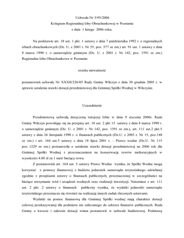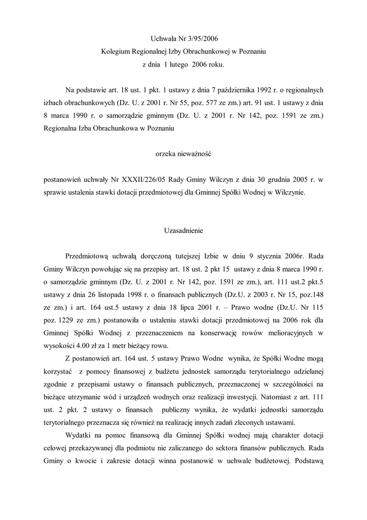 Uchwała Nr 3/95/2006 Kolegium Regionalnej Izby Obrachunkowej w Poznaniu z dnia 1 lutego 2006 roku. Na podstawie art. 18 ust. 1 pkt. 1 ustawy z dnia 7 października 1992 r. o regionalnych izbach obrachunkowych (Dz. U. z 2001 r. Nr 55, poz. 577 ze zm.) art. 91 ust. 1 ustawy z dnia 8 marca 1990 r. o samorządzie gminnym (Dz. U. z 2001 r. Nr 142, poz. 1591 ze zm.) Regionalna Izba Obrachunkowa w Poznaniu orzeka nieważność postanowień uchwały Nr XXXII/226/05 Rady Gminy Wilczyn z dnia 30 grudnia 2005 r. w sprawie ustalenia stawki dotacji przedmiotowej dla Gminnej Spółki Wodnej w Wilczynie. Uzasadnienie Przedmiotową uchwałą doręczoną tutejszej Izbie w dniu 9 stycznia 2006r. Rada Gminy Wilczyn powołując się na przepisy art. 18 ust. 2 pkt 15 ustawy z dnia 8 marca 1990 r. o samorządzie gminnym (Dz. U. z 2001 r. Nr 142, poz. 1591 ze zm.), art. 111 ust.2 pkt.5 ustawy z dnia 26 listopada 1998 r. o finansach publicznych (Dz.U. z 2003 r. Nr 15, poz.148 ze zm.) i art. 164 ust.5 ustawy z dnia 18 lipca 2001 r. – Prawo wodne (Dz.U. Nr 115 poz. 1229 ze zm.) postanowiła o ustaleniu stawki dotacji przedmiotowej na 2006 rok dla Gminnej Spółki Wodnej z przeznaczeniem na konserwację rowów melioracyjnych w wysokości 4.00 zł za 1 metr bieżący rowu. Z postanowień art. 164 ust. 5 ustawy Prawo Wodne wynika, że Spółki Wodne mogą korzystać z pomocy finansowej z budżetu jednostek samorządu terytorialnego udzielanej zgodnie z przepisami ustawy o finansach publicznych, przeznaczonej w szczególności na bieżące utrzymanie wód i urządzeń wodnych oraz realizacji inwestycji. Natomiast z art. 111 ust. 2 pkt. 2 ustawy o finansach publiczny wynika, że wydatki jednostki samorządu terytorialnego przeznacza się również na realizację innych zadań zleconych ustawami. Wydatki na pomoc finansową dla Gminnej Spółki wodnej mają charakter dotacji celowej przekazywanej dla podmiotu nie zaliczanego do sektora finansów publicznych. Rada Gminy o kwocie i zakresie dotacji winna postanowić w uchwale budżetowej. Podstawą realizacji wydatków winna być umowa ze Spółką Wodną określająca zasady, tryb i sposób rozliczenia pomocy finansowej. Podjęcie uchwały w sprawie stawek dotacji przedmiotowych dla Gminnej Spółki Wodnej jest sprzeczne z art. 164 ust.5 ustawy Prawo wodne, który stanowi o pomocy finansowej dla Gminnej Spółki Wodnej, natomiast Rada w przedmiotowej uchwale postanowiła o dotacji przedmiotowej. Z uwagi na powyższe stwierdzenie nieważności uchwały jest zasadne. Pouczenie: Na niniejsze rozstrzygnięcie nadzorcze przysługuje prawo wniesienia skargi do Wojewódzkiego Sądu Administracyjnego w Poznaniu w terminie 30 dni od daty jego doręczenia, za pośrednictwem Kolegium Regionalnej Izby Obrachunkowej w Poznaniu.