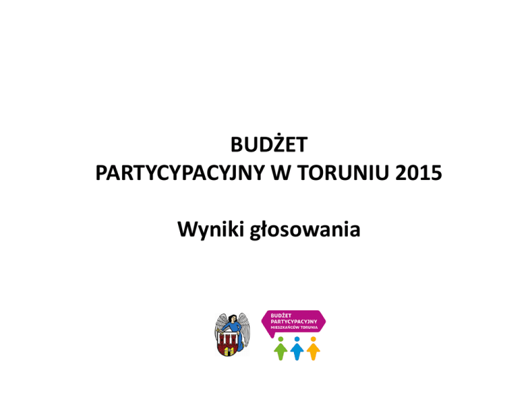 BUDŻET PARTYCYPACYJNY W TORUNIU 2015 Wyniki głosowania Pieniądze PULA BP na 2015 r. 6 580 000 pule lokalne 4 606 000 pula ogólnomiejska 1 974 000 Projekty i listy 185 projektów (184 + 1) 13 list lokalnych 1 lista ogólnomiejska Trochę statystyki, głosowanie LICZBA GŁOSUJĄCYCH OSÓB 27 281 Trochę statystyki, głosowanie LICZBA POPRAWNIE ZŁOŻONYCH KART 42 059 Trochę statystyki, głosowanie Sposób głosowania 14 033 33% 28 026 67% Elektronicznie Na papierze Trochę statystyki, głosowanie 38 022 90% karty ważne karty nieważne 4 037 10% Trochę statystyki, głosowanie LICZBA WSZYSTKICH GŁOSÓW WAŻNYCH 70 484 Trochę statystyki, głosowanie LICZBA WYBRANYCH PROJEKTÓW 53 Trochę statystyki, głosowanie 45 10 Wybrane projekty 40 Niewybrane projekty 35 30 25 3 20 3 15 10 3 5 0 4 2 6 5 6 19 31 3 13 12 3 16 2 1 5 4 2 4 11 3 2 5 1 5 Trochę statystyki, rodzaje wybranych projektów / ilość 1 13 Drogowe 9 Sport i rekreacja Szkoły i przedszkola: wyposażenie i remonty 13 Wybiegi dla psów 17 Inne Trochę statystyki, rodzaje wybranych projektów / kwoty 100% 90% 1 144 038 42 379 80% 888 686 70% 60% 50% 2 365 182 40% 10% 0% Wybiegi dla psów 0,6% Szkoły i przedszkola: wyposażenie i remonty 13,5% Sport i rekreacja 35,9% 30% 20% Inne 17,4% 2 139 715 Drogowe 32,5% Projekty wybrane przez mieszkańców BIELAWY-GRĘBOCIN / 3 projekty GB0018 - Prosta sprawa: 40 lat oczekiwania na 100 metrów drogi. lokalizacja: Ul. Uśmiechu (od ul. Olsztyńskiej do ul. Uśmiechu 14), osiedle Bielawy. GB0019 - Droga do domu. lokalizacja: Ul. Uśmiechu, od numeru 14 do numeru 26 - osiedle Bielawy. GB0025 - Trochę drogowego optymizmu na osiedlu bloków socjalno-komunalnych przy ul. Olsztyńskiej-Guliwera. lokalizacja: Grunt gminny położony od strony północno-wschodniej, zaczynający się od bloku socjalnego 116D do odcinka ul. Guliwera, tj. między blokami komunalnymi ul. Olsztyńska 126-128. Projekty wybrane przez mieszkańców BYDGOSKIE / 3 projekty B0131 - Projekt integracji terenu Gimnazjum nr 21 z otaczającymi terenami w zakresie poprawy możliwości dojazdu, parkowania oraz lepszego wykorzystania terenów rekreacyjnych i sportowych szkoły. lokalizacja: Teren Gimnazjum nr 21, ul. Morcinka 13. B0120 - Utworzenie terenu rekreacyjno-wypoczynkowego dla młodszych i starszych wokół domów studenckich przy ul. Gagarina. lokalizacja: Teren wokół domów studenckich pomiędzy ul. Gagarina i Olszewskiego. B0094 - Parking samochodowy wewnątrzosiedlowy przy ul. Szosa Okrężna 28-42. lokalizacja: Ul. Szosa Okrężna 28-42. Teren między blokiem mieszkalnym, a uliczką dojazdową do sklepu POLO Market (pas nieużytków między chodnikiem, a drogą dojazdową do sklepu). Projekty wybrane przez mieszkańców CHEŁMIŃSKIE / 3 projekty CH0046 - Street Park "A2B" - centrum rozwoju fizycznego. lokalizacja: Okolice orlika przy ul. Polnej 14a. CH0051 - Zagospodarowanie terenów Przedszkola Miejskiego nr 6 oraz wymiana ogrodzenia. lokalizacja: Teren Przedszkola Miejskiego nr 6, ul. Szosa Chełmińska 130. Działka 440, 425, Obręb 36, 37 w trwałym zarządzie Przedszkola Miejskiego nr 6 im. Wandy Chotomskiej. CH0049 - Wybieg dla psów. lokalizacja: Teren pomiędzy ul. Wiązową a ul. Wybickiego, od południowej strony ekranów Trasy Średnicowej Północnej. Projekty wybrane przez mieszkańców CZERNIEWICE / 6 projektów CZ0010 - Wyposażenie - Marzenie... Stworzenie pracowni językowej z prawdziwego zdarzenia. lokalizacja: Zespół Szkół nr 34, ul. Włocławska 237/239. CZ0017 - Boisko wielofunkcyjne w Czerniewicach. lokalizacja: U zbiegu ul. Zdrojowej/Włocławskiej w południowo-wschodniej części OM Czerniewice na placu rekreacyjno-sportowym. CZ0011 - Dobre krzesło. lokalizacja: Zespół Szkół nr 34, ul. Włocławska 237/239. CZ0013 - Biblioteka jako szkolne centrum kulturalne. lokalizacja: Zespół Szkół nr 34, ul. Włocławska 237/239. CZ0015 - Rozbudowa monitoringu osiedla Czerniewice. lokalizacja: Wjazd od zachodniej strony osiedla, w pobliżu skrzyżowania ul. Zdrojowej z ul. Matysiaków. CZ0016 - Charytatywny festyn parafialny w Czerniewicach. lokalizacja: Plac festynowy przy kościele parafialnym pw. Matki Bożej Łaskawej i św. Josemarii Escrivy przy ul. Włocławskiej 256. Projekty wybrane przez mieszkańców JAKUBSKIE-MOKRE / 6 projektów JM0046 - Odpowiednie warunki do nauki w szkole XXI wieku. lokalizacja: Zespół Szkół nr 7. JM0047 - Nowoczesne sale gimnastyczne drogą do sukcesu uczniów. lokalizacja: Zespół Szkół nr 7. JM0048 - Wznowienie publikacji pt. "Terenowa ścieżka edukacyjna. Dzielnica Mokre w Toruniu" przy współudziale nauczycieli z Zespołu Szkół nr 7. lokalizacja: Zespół Szkół nr 7. JM0039 - Modernizacja stadionu przy Zespole Szkół Inżynierii Środowiska przy ul. Batorego 43/49. lokalizacja: Zespół Szkół Inżynierii Środowiska, ul. Batorego 43/49. JM0041 - Montaż zewnętrznej siłowni osiedlowej i ustawienie ławek z oparciem. lokalizacja: W miniparku osiedlowym z fontanną przy sklepie POLO, naprzeciwko wieżowca ul. Świętopełka 20-20c. JM0033 - Organizacja bezpiecznego, kolorowego placu zabaw dla dzieci na nawierzchni Flexi Step. lokalizacja: Przedszkole Miejskie nr 16, ul. Sucharskiego 2. Projekty wybrane przez mieszkańców KASZCZOREK / 2 projekty K0032 - Schody do wiedzy - bezpieczna droga do szkoły. lokalizacja: Schody stanowiące dojście od ul. Wieżowej do Szkoły Podstawowej nr 27 zlokalizowane na działkach 117/1, 112/1, 109/2, 105/6 oraz częściowo przebiegające przez działki 109/1 i 105/8 oraz schody stanowiące dojście od ul. Wieżowej (przy kościele) na Skarpę, zlokalizowane na działkach 105/3, 97/11 i 105/4. K0037 - Rozbudowa placu zabaw i siłowni dla dorosłych-budowa części placu zabaw dla najmłodszych dzieci, wyposażenie terenu rekreacji w urządzenia fitness. lokalizacja: Teren przy ul. Gościnnej (za przedszkolem) w Kaszczorku. Projekty wybrane przez mieszkańców PODGÓRZ / 5 projektów P0039 - Mini sportowo-