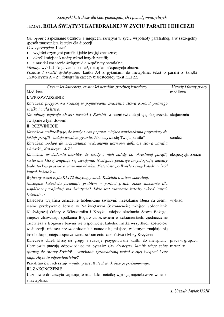 Konspekt katechezy dla klas gimnazjalnych i ponadgimnazjalnych TEMAT: ROLA ŚWIĄTYNI KATEDRALNEJ W ŻYCIU PARAFII I DIECEZJI Cel ogólny: zapoznanie uczniów z miejscem świątyni w życiu wspólnoty parafialnej, a w szczególny sposób znaczeniem katedry dla diecezji. Cele operacyjne: Uczeń: • wyjaśni czym jest parafia i jakie jest jej znaczenie; • określi miejsce katedry wśród innych parafii; • uzasadni znaczenie świątyni dla wspólnoty parafialnej. Metody: wykład, skojarzenia, sondaż, metaplan, ekspozycja obrazu. Pomoce i środki dydaktyczne: kartki A4 z pytaniami do metaplanu, tekst o parafii z książki „Katolicyzm A – Z”, fotografia katedry białostockiej, tekst KL122. Czynności katechety, czynności uczniów, przebieg katechezy Modlitwa I. WPROWADZENIE Katecheta przypomina różnicę w pojmowaniu znaczenia słowa Kościół pisanego wielką i małą literą. Na tablicy zapisuje słowa: kościół i Kościół, a uczniowie dopisują skojarzenia związane z tym słowem. II. ROZWINIĘCIE Katecheta podkreślając, że każdy z nas poprzez miejsce zamieszkania przynależy do jakiejś parafii, zadaje uczniom pytanie: Jak nazywa się Twoja parafia? Katecheta podaje do przeczytania wybranemu uczniowi definicję słowa parafia z książki „Katolicyzm A-Z”. Katecheta uświadamia uczniów, że każdy z nich należy do określonej parafii, na terenie której znajduje się świątynia. Następnie pokazuje im fotografię katedry białostockiej prosząc o nazwanie obiektu. Katecheta podkreśla rangę katedry wśród innych kościołów. Wybrany uczeń czyta KL122 dotyczący nauki Kościoła o sztuce sakralnej. Następnie katecheta formułuje problem w postaci pytań: Jakie znaczenie dla wspólnoty parafialnej ma świątynia? Jakie jest znaczenie katedry wśród innych kościołów? Katecheta wyjaśnia znaczenie teologiczne świątyni: mieszkanie Boga na ziemi; realne przebywanie Jezusa w Najświętszym Sakramencie; miejsce uobecnienia Najświętszej Ofiary z Wieczernika i Krzyża; miejsce słuchania Słowa Bożego; miejsce zbawczego spotkania Boga z człowiekiem w sakramentach; zjednoczenie człowieka z Bogiem i braćmi we wspólnocie; katedra, matka wszystkich kościołów w diecezji; miejsce przewodniczenia i nauczania; miejsce, w którym znajduje się tron biskupi; miejsce sprawowania sakramentu kapłaństwa i Mszy Krzyżma. Katecheta dzieli klasę na grupy i rozdaje przygotowane kartki do metaplanu. Uczniowie pracują odpowiadając na pytanie: Czy dzisiejszy katolik zdaje sobie sprawę, że tworzy Kościół – wspólnotę zgromadzoną wokół swojej świątyni i czy czuje się za to odpowiedzialny? Przedstawiciel odczytuje wyniki pracy. Katecheta krótko je podsumowuje. III. ZAKOŃCZENIE Uczniowie do zeszytu zapisują temat. Jako notatkę wpisują najciekawsze wnioski z metaplanu. Metody i formy pracy modlitwa skojarzenia sondaż ekspozycja obrazu wykład praca w grupach metaplan s. Urszula Myjak USJK