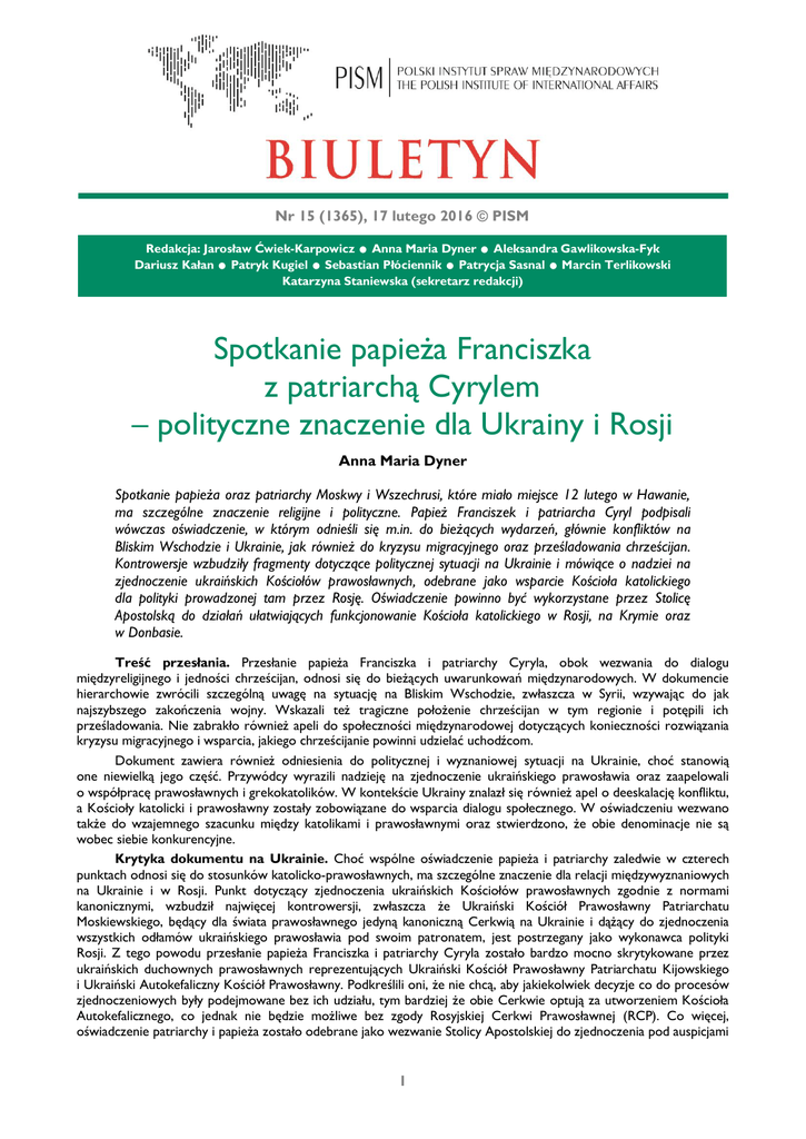Nr 15 (1365), 17 lutego 2016 © PISM . . . . . . Redakcja: Jarosław Ćwiek-Karpowicz Anna Maria Dyner Aleksandra Gawlikowska-Fyk Dariusz Kałan Patryk Kugiel Sebastian Płóciennik Patrycja Sasnal Marcin Terlikowski Katarzyna Staniewska (sekretarz redakcji) Spotkanie papieża Franciszka z patriarchą Cyrylem – polityczne znaczenie dla Ukrainy i Rosji Anna Maria Dyner Spotkanie papieża oraz patriarchy Moskwy i Wszechrusi, które miało miejsce 12 lutego w Hawanie, ma szczególne znaczenie religijne i polityczne. Papież Franciszek i patriarcha Cyryl podpisali wówczas oświadczenie, w którym odnieśli się m.in. do bieżących wydarzeń, głównie konfliktów na Bliskim Wschodzie i Ukrainie, jak również do kryzysu migracyjnego oraz prześladowania chrześcijan. Kontrowersje wzbudziły fragmenty dotyczące politycznej sytuacji na Ukrainie i mówiące o nadziei na zjednoczenie ukraińskich Kościołów prawosławnych, odebrane jako wsparcie Kościoła katolickiego dla polityki prowadzonej tam przez Rosję. Oświadczenie powinno być wykorzystane przez Stolicę Apostolską do działań ułatwiających funkcjonowanie Kościoła katolickiego w Rosji, na Krymie oraz w Donbasie. Treść przesłania. Przesłanie papieża Franciszka i patriarchy Cyryla, obok wezwania do dialogu międzyreligijnego i jedności chrześcijan, odnosi się do bieżących uwarunkowań międzynarodowych. W dokumencie hierarchowie zwrócili szczególną uwagę na sytuację na Bliskim Wschodzie, zwłaszcza w Syrii, wzywając do jak najszybszego zakończenia wojny. Wskazali też tragiczne położenie chrześcijan w tym regionie i potępili ich prześladowania. Nie zabrakło również apeli do społeczności międzynarodowej dotyczących konieczności rozwiązania kryzysu migracyjnego i wsparcia, jakiego chrześcijanie powinni udzielać uchodźcom. Dokument zawiera również odniesienia do politycznej i wyznaniowej sytuacji na Ukrainie, choć stanowią one niewielką jego część. Przywódcy wyrazili nadzieję na zjednoczenie ukraińskiego prawosławia oraz zaapelowali o współpracę prawosławnych i grekokatolików. W kontekście Ukrainy znalazł się również apel o deeskalację konfliktu, a Kościoły katolicki i prawosławny zostały zobowiązane do wsparcia dialogu społecznego. W oświadczeniu wezwano także do wzajemnego szacunku między katolikami i prawosławnymi oraz stwierdzono, że obie denominacje nie są wobec siebie konkurencyjne. Krytyka dokumentu na Ukrainie. Choć wspólne oświadczenie papieża i patriarchy zaledwie w czterech punktach odnosi się do stosunków katolicko-prawosławnych, ma szczególne znaczenie dla relacji międzywyznaniowych na Ukrainie i w Rosji. Punkt dotyczący zjednoczenia ukraińskich Kościołów prawosławnych zgodnie z normami kanonicznymi, wzbudził najwięcej kontrowersji, zwłaszcza że Ukraiński Kościół Prawosławny Patriarchatu Moskiewskiego, będący dla świata prawosławnego jedyną kanoniczną Cerkwią na Ukrainie i dążący do zjednoczenia wszystkich odłamów ukraińskiego prawosławia pod swoim patronatem, jest postrzegany jako wykonawca polityki Rosji. Z tego powodu przesłanie papieża Franciszka i patriarchy Cyryla zostało bardzo mocno skrytykowane przez ukraińskich duchownych prawosławnych reprezentujących Ukraiński Kościół Prawosławny Patriarchatu Kijowskiego i Ukraiński Autokefaliczny Kościół Prawosławny. Podkreślili oni, że nie chcą, aby jakiekolwiek decyzje co do procesów zjednoczeniowych były podejmowane bez ich udziału, tym bardziej że obie Cerkwie optują za utworzeniem Kościoła Autokefalicznego, co jednak nie będzie możliwe bez zgody Rosyjskiej Cerkwi Prawosławnej (RCP). Co więcej, oświadczenie patriarchy i papieża zostało odebrane jako wezwanie Stolicy Apostolskiej do zjednoczenia pod auspicjami 1 RCP i ingerencja katolików w sytuację ukraińskiego prawosławia. Skrytykowano również to, że papież o sytuacji na Ukrainie rozmawiał jedynie z przedstawicielem RCP, a nie z pozostałymi Kościołami prawosławnymi. Z dużym dystansem do dokumentu odnieśli się również przedstawiciele Kościoła greckokatolickiego, podkreślając, że jego treść, a zwłaszcza ocena sytuacji politycznej na Ukrainie, nie została z nimi skonsultowana. Równocześnie wskazano jednak na punkt mówiący o prawie Kościoła greckokatolickiego do funkcjonowania, co wśród prawosławnych nadal jest tematem problematycznym: przez lata grekokatolicy byli uznawani za odszczepieńców od wiary prawosławnej, a do tej pory są często określani mianem sekty. W tym kontekście warto podkreślić, że przesłanie papieża Franciszka i patriarchy Cyryla idzie dalej niż deklaracja kościołów katolickiego i prawosławnego z Balamand z 1993 r. Jest to tym samym kontynuacja dialogu rozpoczętego w 1979 r., kiedy papież Jan Paweł II i patriarcha Konstantynopola Dymitr I powołali wspólną komisję teologiczną. Znaczenie dla Rosji. Oceniając znaczenie dokumentu, trzeba zwrócić uwagę, że był on pisany z uwzględnieniem interesu obu Kościołów, co w przypadku RCP w dużym stopniu jest tożsame z interesami państwa rosyjskiego. Działania RCP bardzo często są elementem rosyjskich działań dyplomatycznych, czego przykładem są nie tylko zagraniczne wizyty patriarchy Moskwy i Wszechrusi, ale również podpisywane przez niego dokumenty. Wspólne oświadczenie Cyryla i Franciszka może być zatem potraktowane jako wsparcie Kościoła katolickiego dla polityki Władimira Putina, który na arenie międzynarodowej stara się pozyskiwać stronników tradycyjnych wartości. Z kolei samej Rosyjskiej Cerkwi Prawosławnej spotkanie to może pomóc w zintegrowaniu terytorium uważanego przez siebie za kanoniczne. Jest to szczególnie ważne ze względu na spór trwający między patriarchami Moskwy Cyrylem i Konstantynopola Bartłomiejem od czasu, gdy ten drugi ogłosił powrót do idei pentarchii (pięć najważniejszych ośrodków Kościo
