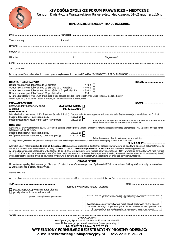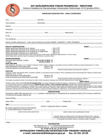 XIV OGÓLNOPOLSKIE FORUM PRAWNICZO - MEDYCZNE Centrum Dydaktyczne Warszawskiego Uniwersytetu Medycznego, 01-02 grudnia 2016 r. FORMULARZ REJESTRACYJNY - DANE O UCZESTNIKU Imię: ............................................................... Nazwisko: ................................................................................................................................... Tytuł naukowy: ................................................ Stanowisko: ................................................................................................................................ Oddział: ............................................................................................................................................................................................................... Instytucja: ........................................................................................................................................................................................................... Ulica, Nr: .......................................................................... Kod: ..................................... Miejscowość: ................................................................ E-mail: ................................................................................................................................................................................................................ Tel. kontaktowy: .................................................................................................................................................................................................. Dotyczy punktów edukacyjnych - numer prawa wykonywania zawodu LEKARZA / DIAGNOSTY / RADCY PRAWNEGO .................................................. OPŁATA REJESTRACYJNA Opłata rejestracyjna dokonana Opłata rejestracyjna dokonana Opłata rejestracyjna dokonana Opłata rejestracyjna dokonana KOSZT............................. do od od po 01 01 16 31 sierpnia sierpnia do 15 września września do 31 października października - 410 490 590 690 zł zł zł zł W przypadku udziału w sympozjum dwóch osób z tego samego ośrodka opłata rejestracyjna ulega obniżeniu o 50 zł od osoby. Opłata rejestracyjna zapewnia: udział w sympozjum, bufet kawowy w przerwie, obiad. ZAKWATEROWANIE Rezerwuję doby hotelowe w dniach: w hotelu: Hotel PAN IBIB KOSZT............................. 30.11/01.12.2016 01/02.12.2016 hotel akademicki , Warszawa, ul. Ks. Trojdena 4 (standard średni). Pokoje z łazienką, w cenę pokoju wliczone śniadanie. Dojście do miejsca obrad pieszo ok. 5 minut. Pokój jednoosobowy koszt jednej doby Pokój dwuosobowy koszt jednej doby (cały pokój) - 185.00 zł - 230.00 zł ..................................................................................................... Pokój dwuosobowy będzie wykorzystywany wspólnie z Hotel Ibis Warszawa ul. Bitwy Warszawskiej 1920r. 16 Pokoje z łazienką, w cenę pokoju wliczone śniadanie. Hotel w sąsiedztwie Dworca Zachodniego PKP. Dojazd do miejsca obrad autobusem 154 ok. 15 minut. Pokój jednoosobowy koszt jednej doby Pokój dwuosobowy koszt jednej doby (cały pokój) - 250.00 zł - 270.00 zł ..................................................................................................... Pokój dwuosobowy będzie wykorzystywany wspólnie z W przypadku wyczerpania miejsc rezerwowanych w danym hotelu organizator zastrzega sobie możliwość zaproponowania innego hotelu. SUMA OPŁAT............................. Wszystkie opłaty należy przesłać do dnia 28 listopada 2016 r. na konto organizatora konferencji zgodnie z wystawionym na podstawie zgłoszenia dokumentem proforma. W polu tytułem prosimy o wpisanie informacji: FORUM 01/02.12.2016 + imię i nazwisko uczestnika. Wszystkie ceny zawierają podatek VAT. W przypadku rezygnacji z uczestnictwa w konferencji do 31.10.2016 roku zwracamy 50% wartości opłaty rejestracyjnej i 100% wartości opłaty hotelowej. W razie rezygnacji po 31.10.2016 roku nie przewidujemy zwrotów. Ilość miejsc ograniczona, Uczestnicy będą rejestrowani według kolejności zgłoszeń (dotyczy także rezerwacji hoteli). Organizator zastrzega sobie prawo do odwołania sympozjum, z przyczyn od siebie niezależnych, najpóźniej na 14 dni przed terminem sympozjum. OŚWIADCZENIE Upoważniam spółkę ”Blok operacyjny Sp. z o. o.” z siedzibą w Warszawie przy ul. Bysławskiej 82 do wystawienia faktury VAT za koszty uczestnictwa w Konferencji bez podpisu odbiorcy dla: Nazwa Płatnika: ................................................................................................................................................................................................... Adres: Ulica: ..........................................................................Kod: ............................ Miejscowość: ..................................................................... NIP........................................................ data: .............................................. Prosimy o wystawienie faktury i wysłanie pocztą, papierowej wersji na adres płatnika pocztą elektroniczną na adres email:................................................................................................................................................................ podpis i pieczęć osoby upoważnionej podpis i pieczęć osoby wypełniającej formularz Wyrażam zgodę na wykorzystywanie moich danych osobowych tylko w zakresie przesyłania informacji o organizowanych konferencjach i wydawanych publikacjach (w przypadku braku zgody, prosimy o zaznaczenie tego w uwagach). Uwagi: ................................................................................................................................................................................................................ ORGANIZATOR: Blok Operacyjny Sp. z o. o. ul. Bysławska 82 Warszawa 04-993 www