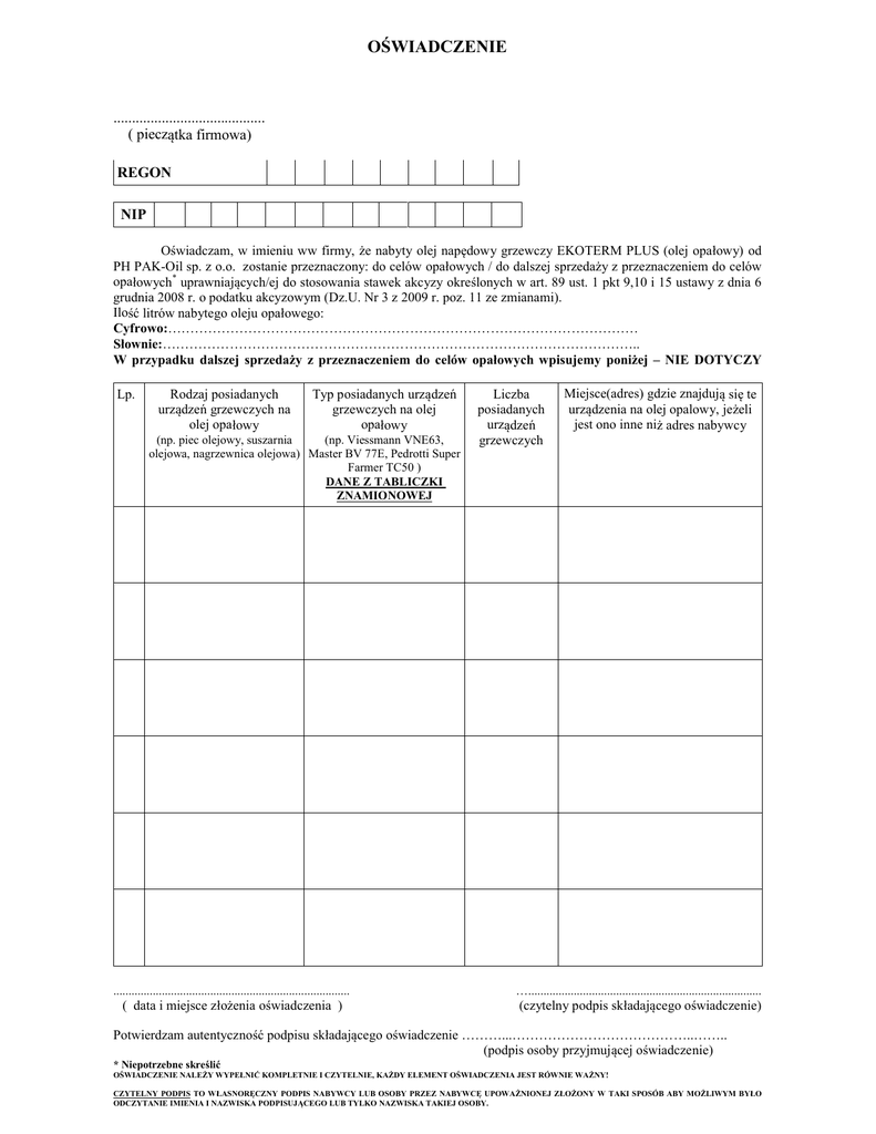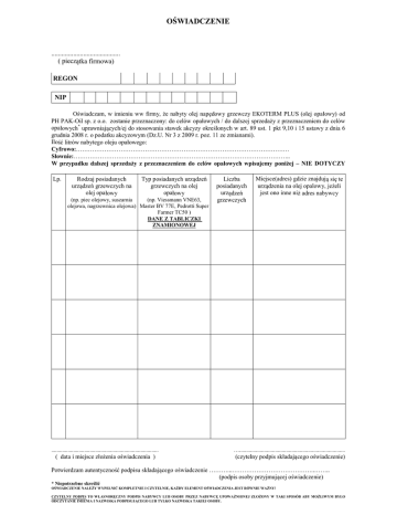 OŚWIADCZENIE ......................................... ( pieczątka firmowa) REGON NIP Oświadczam, w imieniu ww firmy, że nabyty olej napędowy grzewczy EKOTERM PLUS (olej opałowy) od PH PAK-Oil sp. z o.o. zostanie przeznaczony: do celów opałowych / do dalszej sprzedaży z przeznaczeniem do celów opałowych* uprawniających/ej do stosowania stawek akcyzy określonych w art. 89 ust. 1 pkt 9,10 i 15 ustawy z dnia 6 grudnia 2008 r. o podatku akcyzowym (Dz.U. Nr 3 z 2009 r. poz. 11 ze zmianami). Ilość litrów nabytego oleju opałowego: Cyfrowo:…………………………………………………………………………………………… Słownie:…………………………………………………………………………………………….. W przypadku dalszej sprzedaży z przeznaczeniem do celów opałowych wpisujemy poniżej – NIE DOTYCZY Lp. Rodzaj posiadanych urządzeń grzewczych na olej opałowy Typ posiadanych urządzeń grzewczych na olej opałowy (np. piec olejowy, suszarnia (np. Viessmann VNE63, olejowa, nagrzewnica olejowa) Master BV 77E, Pedrotti Super Farmer TC50 ) DANE Z TABLICZKI ZNAMIONOWEJ Liczba posiadanych urządzeń grzewczych Miejsce(adres) gdzie znajdują się te urządzenia na olej opalowy, jeżeli jest ono inne niż adres nabywcy .............................................................................. …............................................................................. ( data i miejsce złożenia oświadczenia ) (czytelny podpis składającego oświadczenie) Potwierdzam autentyczność podpisu składającego oświadczenie ………...…………………………………..…….. (podpis osoby przyjmującej oświadczenie) * Niepotrzebne skreślić OŚWIADCZENIE NALEŻY WYPEŁNIĆ KOMPLETNIE I CZYTELNIE, KAŻDY ELEMENT OŚWIADCZENIA JEST RÓWNIE WAŻNY! CZYTELNY PODPIS TO WŁASNORĘCZNY PODPIS NABYWCY LUB OSOBY PRZEZ NABYWCĘ UPOWAŻNIONEJ ZŁOŻONY W TAKI SPOSÓB ABY MOŻLIWYM BYŁO ODCZYTANIE IMIENIA I NAZWISKA PODPISUJĄCEGO LUB TYLKO NAZWISKA TAKIEJ OSOBY.