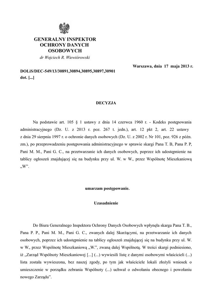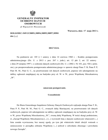 GENERALNY INSPEKTOR OCHRONY DANYCH OSOBOWYCH dr Wojciech R. Wiewiórowski Warszawa, dnia 17 maja 2013 r. DOLiS/DEC-549/13/30891,30894,30895,30897,30901 dot. [...] DECYZJA Na podstawie art. 105 § 1 ustawy z dnia 14 czerwca 1960 r. - Kodeks postępowania administracyjnego (Dz. U. z 2013 r. poz. 267 t. jedn.), art. 12 pkt 2, art. 22 ustawy z dnia 29 sierpnia 1997 r. o ochronie danych osobowych (Dz. U. z 2002 r. Nr 101, poz. 926 z późn. zm.), po przeprowadzeniu postępowania administracyjnego w sprawie skargi Pana T. B, Pana P. P, Pani M. M., Pani G. C., na przetwarzanie ich danych osobowych, poprzez ich udostępnienie na tablicy ogłoszeń znajdującej się na budynku przy ul. W. w W., przez Wspólnotę Mieszkaniową „W”. umarzam postępowanie. Uzasadnienie Do Biura Generalnego Inspektora Ochrony Danych Osobowych wpłynęła skarga Pana T. B., Pana P. P., Pani M. M., Pani G. C., zwanych dalej Skarżącymi, na przetwarzanie ich danych osobowych, poprzez ich udostępnienie na tablicy ogłoszeń znajdującej się na budynku przy ul. W. w W., przez Wspólnotę Mieszkaniową „W.”, zwaną dalej Wspólnotą. W treści skargi podniesiono, iż „Zarząd Wspólnoty Mieszkaniowej [...] (...) wywiesili listę z danymi osobowymi właścicieli (...) lista została wywieszona, bez naszej zgody, po tym jak właściciele lokali złożyli wniosek o umieszczenie w porządku zebrania Wspólnoty (...) uchwał o odwołaniu obecnego i powołaniu nowego Zarządu”. W związku z zainicjowanym ww. skargą postępowaniem, Generalny Inspektor Ochrony Danych Osobowych, zwrócił się do Zarządu Wspólnoty w celu złożenia stosownych wyjaśnień w sprawie. W odpowiedzi w piśmie z dnia [...] czerwca 2012 r. Pani G. C., Pani M. M.i Pan P. P., jako aktualni członkowie Zarządu Wspólnoty, wskazali, iż w dniu [...] kwietnia 2012 r. Wspólnota dokonała zmiany Zarządu, natomiast kwestionowanego udostępnienia dokonali członkowie poprzedniego Zarządu. W związku z powyższym, Generalny Inspektor Ochrony Danych Osobowych w piśmie z dnia [...] sierpnia 2012 r. (znak: [...]), wyjaśnił Skarżącym, że niniejsze postępowanie prowadzone jest wobec Wspólnoty reprezentowanej przez Zarząd, nie zaś wobec osób fizycznych, które są członkami tego organu. Ponadto Generalny Inspektor Ochrony Danych Osobowych wezwał Skarżących, do sprecyzowania czy ich wolą jest, aby organ nadal prowadził czynności wyjaśniające w przedmiotowej sprawie, pod rygorem pozostawienia pisma Zarządu Wspólnoty z dnia [...] czerwca 2012 r. bez rozpoznania i prowadzenia czynności wyjaśniających tylko w zakresie przetwarzania danych osobowych Skarżących przez Wspólnotę. Skarżący nie odnieśli się do ww. pisma organu w zakreślonym terminie, w związku z powyższym przedmiot niniejszego postępowania dotyczy przetwarzania ich danych osobowych, poprzez ich udostępnienie przez Wspólnotę na tablicy ogłoszeń znajdującej się na budynku przy ul. W. w W. W związku z faktem, iż Zarząd Wspólnoty nie udzielał odpowiedzi na pytania organu, mające na celu ustalenie okoliczności niezbędnych dla podjęcia prawidłowego rozstrzygnięcia, została podjęta decyzja o przeprowadzeniu inspekcji w siedzibie Wspólnoty w celu zebrania materiału dowodowego. W toku postępowania administracyjnego Generalny Inspektor Ochrony Danych Osobowych ustalił następujący stan faktyczny. 1. W dniu [...] marca 2013 r. Pani M. B., ówczesny członek Zarządu Wspólnoty, wywiesiła na tablicy ogłoszeń znajdującej się przy wejściu do budynku położonego w W., informację o przekazaniu Zarządowi Wspólnoty projektów uchwał, będących załącznikami do pisma mieszkańców Wspólnoty oraz przekazane projekty uchwał wraz z listą właścicieli lokali wnioskujących o umieszczenie w porządku zebrania Wspólnoty ww. uchwał. 2. Po odwołaniu poprzedniego Zarządu, obecny Zarząd Wspólnoty w maju 2012 r. usunął ww. listę z gabloty przy budynku położonego przy ul. W. 3. Obecny Zarząd Wspólnoty nie wywiesza jakichkolwiek dokumentów zawierających dane osobowe jej członków, w gablotach znajdujących się przy budynku przy ul. W. Po zapoznaniu się z całością zgromadzonego w sprawie materiału dowodowego Generalny Inspektor Ochrony Danych Osobowych zważył, co następuje. 2 Na wstępie należy podkreślić, że zgodnie z art. 22 ustawy z dnia 29 sierpnia 1997 r. o ochronie danych osobowych (Dz. U. z 2002 r. Nr 101, poz. 926 z późn. zm.) postępowanie w sprawach uregulowanych w niniejszej ustawie prowadzi się według przepisów Kodeksu postępowania administracyjnego, o ile przepisy ustawy nie stanowią inaczej. Natomiast zgodnie z dyspozycją art. 28 ustawy z dnia 14 czerwca 1960 r. Kodeks postępowania administracyjnego (Dz. U. z 2013 r. poz. 267 t. jedn.), zwanej dalej Kpa, stroną jest każdy, czyjego interesu prawnego lub obowiązku dotyczy postępowanie albo kto żąda czynności organu ze względu na swój interes prawny lub obowiązek. Stronami mogą być osoby fizyczne i osoby prawne, a gdy chodzi o państwowe i samorządowe jednostki organizacyjne i organizacje społeczne - również jednostki nie posiadające osobowości prawnej (art. 29 Kpa). Zatem stroną postępowania z racji posiadania przymiotu administratora danych będzie w niniejszej sprawie Wspólnota, a nie Zarząd który działa jedynie jako organ. To Wspólnota decyduje o celach i środkach przetwarzania danych osobowych, co zgodnie z art. 7 pkt 4 ustawy o ochronie danych osobowych, określa administratora danych osobowych. Powyższe należy zestawić z określonym w art. 6 ustawy z dnia 24 czerwca 1994 r. o własności lokali (t.j. Dz. U. z 2000 r. Nr 80, poz. 903 z późn. zm.) charakterem prawnym wspólnot mieszkaniowych. Zgodnie z ww. przepisem ogół właścicieli, których lokale wchodzą w skład określonej nieruchomości, tworzy wspólnotę mieszkaniową. Wspólnota mieszkaniowa (a nie jej zarząd) może nabywać prawa i zaciągać zobowi