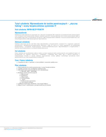 Tytuł szkolenia: Wprowadzenie do testów penetracyjnych – „etyczny haking” i oceny bezpieczeństwa systemów IT Kod szkolenia: INFRA-BEZP-PENETR Wprowadzenie Sz ko lenia jes t ukier unko wane na z apo z nanie s ię z o b ecny m i wy m aganiam i dla o r ganiz acji i pr o wadz enia tes tó w penetr acy jny ch o r az r o z wiąz ań o ceny b ez piecz eńs twa. Po dcz as s z ko lenia z apo z nas z s ię jak pr z y go to wać s ię do tes tó w penetr acy jny ch, jakie s ą po s z cz egó lne etapy tes tu w ś r o do wis ku IT. W o par ciu o jakie o pr o gr am o wanie, s tandar dy i wy ty cz ne pr z epr o wadz ić tes ty o r az o cenę b ez piecz eńs twa a także jak pr z y go to wać r apo r t ko ńco wy . Adresaci szkolenia Sz ko lenie adr es o wane jes t do o s ó b któ r e b ędą o dpo wiedz ialne z a b ez piecz eńs two s y s tem ó w IT w o r ganiz acji, audy to r ó w wewnętr z ny ch, adm inis tr ato r ó w b ez piecz eńs twa info r m acji a także do o s ó b na co dz ień z ajm ujący ch s ię pr o b lem aty ką b ez piecz eńs twa i z ar z ądz ania b ez piecz eńs twem s y s tem ó w teleinfo r m aty cz ny ch, o dpo wiedz ialny ch z a b ez piecz eńs two i ko ntr o lę s tanu b ez piecz eńs twa w s y s tem ach teleinfo r m aty cz ny ch. Cel szkolenia C elem s z ko lenia jes t pr z eds tawienie z akr es u wiedz y na tem at o r ganiz acji tes tó w penetr acy jny ch, po s z cz egó lny ch etapó w o d pr z y go to wania r eko m endacjam i. po r ealiz ację Po nadto w tes tó w wr az r am ach z dz iałaniam i i us taleniam i, s z ko lenia z apr ez ento wane z o s taną któ r e penetr acy jny ch o r az o ceny b ez piecz eńs twa s y s tem ó w IT . Czas i forma szkolenia 14 godz in (2 dni x 7 godz in), w tym wykłady i warsz taty praktycz ne. Plan szkolenia 1. Wprowadz enie do testów penetracyjny i oceny bez piecz eństwa 2. Aspekty prawne oraz wymagania organiz acyjne 3. Metodyki testów penetracyjnych oraz rekomendacje a. OWASP, NIST , OSSTMM, 4. Elementy testów penetracyjnych a. Rekonesans, b. Enumeracj c. Mapowanie, d. Socjotechnika, e. „Atak”, f. Podnosz enie uprawnień, g. Utrz ymanie dostępu. 5. Aplikacje wspierające dz iałania „etycz nego hakera” 6. Raport wraz z ustaleniami z prz eprowadz onych dz iałań Vavatech Sp. z o.o., ul. Olesińska 21, 02-548 Warszawa, tel. (+48 22) 845 09 70, fax (+48 22) 213 81 27 e-mail: [email protected], www.vavatech.pl należy aplikacje ująć w r apo r cie i m eto do lo gie ko ńco wy m pr o wadz enia z tes tó w