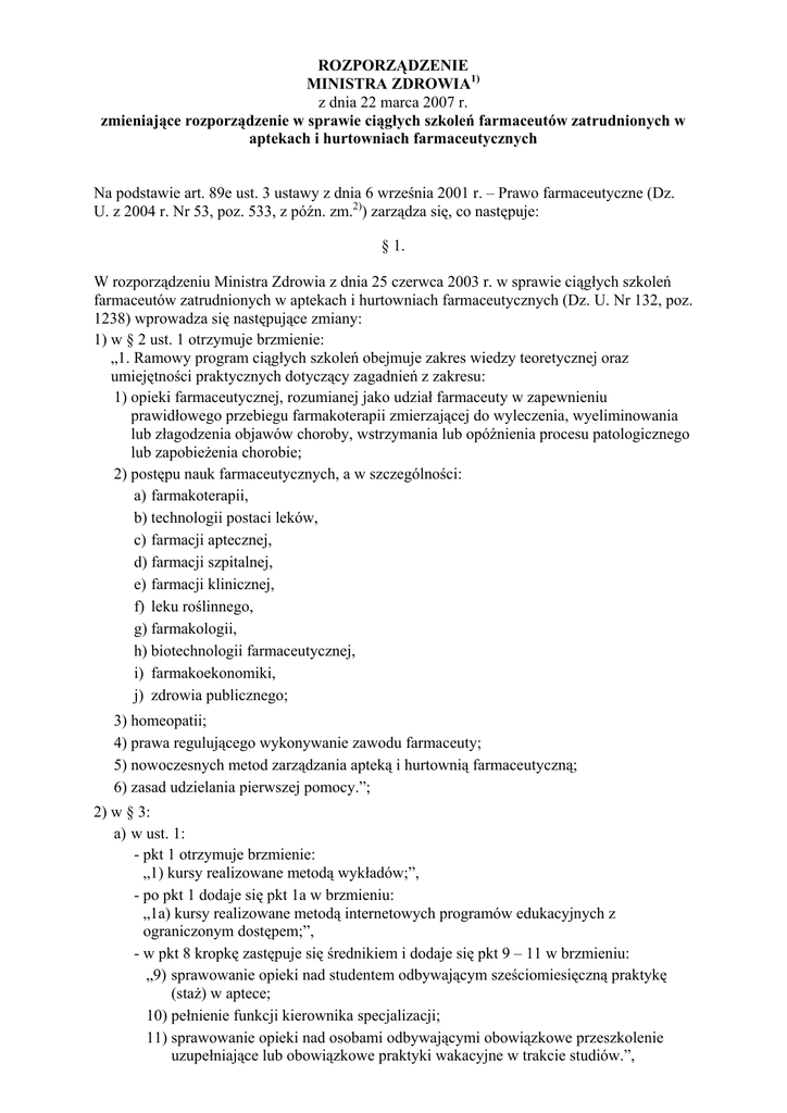 ROZPORZĄDZENIE MINISTRA ZDROWIA1) z dnia 22 marca 2007 r. zmieniające rozporządzenie w sprawie ciągłych szkoleń farmaceutów zatrudnionych w aptekach i hurtowniach farmaceutycznych Na podstawie art. 89e ust. 3 ustawy z dnia 6 września 2001 r. – Prawo farmaceutyczne (Dz. U. z 2004 r. Nr 53, poz. 533, z późn. zm.2)) zarządza się, co następuje: § 1. W rozporządzeniu Ministra Zdrowia z dnia 25 czerwca 2003 r. w sprawie ciągłych szkoleń farmaceutów zatrudnionych w aptekach i hurtowniach farmaceutycznych (Dz. U. Nr 132, poz. 1238) wprowadza się następujące zmiany: 1) w § 2 ust. 1 otrzymuje brzmienie: „1. Ramowy program ciągłych szkoleń obejmuje zakres wiedzy teoretycznej oraz umiejętności praktycznych dotyczący zagadnień z zakresu: 1) opieki farmaceutycznej, rozumianej jako udział farmaceuty w zapewnieniu prawidłowego przebiegu farmakoterapii zmierzającej do wyleczenia, wyeliminowania lub złagodzenia objawów choroby, wstrzymania lub opóźnienia procesu patologicznego lub zapobieżenia chorobie; 2) postępu nauk farmaceutycznych, a w szczególności: a) farmakoterapii, b) technologii postaci leków, c) farmacji aptecznej, d) farmacji szpitalnej, e) farmacji klinicznej, f) leku roślinnego, g) farmakologii, h) biotechnologii farmaceutycznej, i) farmakoekonomiki, j) zdrowia publicznego; 3) homeopatii; 4) prawa regulującego wykonywanie zawodu farmaceuty; 5) nowoczesnych metod zarządzania apteką i hurtownią farmaceutyczną; 6) zasad udzielania pierwszej pomocy.”; 2) w § 3: a) w ust. 1: - pkt 1 otrzymuje brzmienie: „1) kursy realizowane metodą wykładów;”, - po pkt 1 dodaje się pkt 1a w brzmieniu: „1a) kursy realizowane metodą internetowych programów edukacyjnych z ograniczonym dostępem;”, - w pkt 8 kropkę zastępuje się średnikiem i dodaje się pkt 9 – 11 w brzmieniu: „9) sprawowanie opieki nad studentem odbywającym sześciomiesięczną praktykę (staż) w aptece; 10) pełnienie funkcji kierownika specjalizacji; 11) sprawowanie opieki nad osobami odbywającymi obowiązkowe przeszkolenie uzupełniające lub obowiązkowe praktyki wakacyjne w trakcie studiów.”, b) w ust. 2: - po pkt 1 dodaje się pkt 1a w brzmieniu: „1a) za udział w kursie realizowanym metodą internetowych programów edukacyjnych z ograniczonym dostępem, przysługuje 1 punkt edukacyjny za każdą godzinę trwania kursu odpowiadający pięciu pytaniom w obowiązkowych zadaniach testowych, nie więcej jednak niż 25 punktów edukacyjnych za cały kurs;”, - w pkt 8 kropkę zastępuje się średnikiem i dodaje się pkt 9 – 11 w brzmieniu: „9) za sprawowanie opieki nad studentem odbywającym sześciomiesięczny staż w aptece przysługuje 1 punkt edukacyjny za każdy miesiąc sprawowania opieki nad jednym studentem, nie więcej jednak niż 18 punktów edukacyjnych w okresie edukacyjnym; 10) za pełnienie funkcji kierownika specjalizacji przysługuje 5 punktów edukacyjnych za każdy rok trwania specjalizacji, nie więcej jednak niż 15 punktów edukacyjnych za jedną osobę; 11) za sprawowanie opieki nad osobami odbywającymi obowiązkowe przeszkolenie uzupełniające lub obowiązkowe praktyki wakacyjne w trakcie studiów przysługuje 1 punkt edukacyjny za każdy miesiąc trwania obowiązkowego przeszkolenia lub obowiązkowej praktyki, nie więcej jednak, niż 6 punktów edukacyjnych za wszystkie osoby w danym roku.”; 3) w § 5 ust. 1 otrzymuje brzmienie: „1. Farmaceuta odbywa kursy, o których mowa w § 3 ust. 1 pkt 1 i 1a, zgodnie z programami kursów, opracowanymi przez zespół ekspertów powołanych przez Dyrektora Centrum Medycznego Kształcenia Podyplomowego, zwanego dalej „Centrum”.”; 4) w § 6 w ust. 1: a) pkt 10 otrzymuje brzmienie: „10) udział farmaceuty w formach ciągłego szkolenia, o których mowa w § 3 ust. 1 pkt 1, 1a, 3 i 4, musi być potwierdzony wydanym przez jednostkę szkolącą zaświadczeniem, zwanym dalej „certyfikatem”, określającym temat, liczbę godzin szkolenia i liczbę punktów edukacyjnych;”, b) po pkt 10 dodaje się pkt 10a w brzmieniu: „10a) udział farmaceuty w formach ciągłego szkolenia, o których mowa w § 3 ust. 1 pkt 5 – 6, musi być potwierdzony zaświadczeniem (certyfikatem) wydanym przez organizatora kongresu, zjazdu, konferencji lub sympozjum naukowego;”, 5) w § 7: a) ust. 4 otrzymuje brzmienie: „4. Dla farmaceutów, którzy ukończyli studia na kierunku farmacja i uzyskali prawo wykonywania zawodu farmaceuty w danym roku, okres edukacyjny rozpoczyna się z dniem 1 stycznia roku następnego po uzyskaniu tego prawa.”, b) po ust. 4 dodaje się ust 4a w brzmieniu: „4a. Dla farmaceutów, którzy zobowiązani są do odbycia przeszkolenia uzupełniającego, okres edukacyjny rozpoczyna się pierwszego dnia miesiąca następującego po miesiącu, w którym przeszkolenie zostało zakończone.” 6) w § 8 dodaje się ust. 5 w brzmieniu: „5. Informacja o dopełnieniu obowiązku odbycia ciągłego szkolenia umieszczana jest w rejestrze farmaceutów, do którego farmaceuta został wpisany.”; 7) uchyla się § 11. § 2. Rozporządzenie wchodzi w życie po upływie 14 dni od dnia ogłoszenia. MINISTER ZDROWIA 1) Minister Zdrowia kieruje działem administracji rządowej - zdrowie, na podstawie § 1 ust. 2 rozporządzenia Prezesa Rady Ministrów z dnia 18 lipca 2006 r. w sprawie szczegółowego zakresu działania Ministra Zdrowia (Dz. U. Nr 131, poz. 924). 2) Zmiany tekstu jednolitego wymienionej ustawy zostały ogłoszone w Dz. U. z 2004 r. Nr 69, poz. 625, Nr 91, poz. 877, Nr 92, poz. 882, Nr 93, poz. 896, Nr 173, poz. 1808, Nr 210, poz. 2135 i Nr 273, poz. 2703, z 2005 r. Nr 94, poz. 787, Nr 163, poz. 1362, Nr 179, poz. 1485 i Nr 184, poz.1539 oraz z 2006 r. Nr 170, poz. 1217, Nr 171, poz. 1225 i Nr 217, poz. 1588.