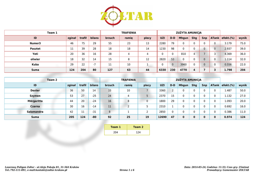 Team 1 TRAFIENIA ZUŻYTA AMUNICJA ID zginał trafił bilans brzuch ramię plecy UZI D-D Mhgun Shg Snp Numer3 46 75 29 55 23 13 2280 79 0 0 0 0 3.179 75.0 Pasztet 11 39 28 18 18 14 1230 98 0 0 0 0 2.937 39.0 Yeti 20 36 16 28 4 4 0 0 810 4 7 3 4.369 36.0 oliwier 18 32 14 15 8 12 2820 53 0 0 0 0 1.114 32.0 Kuba 29 22 -7 11 10 1 0 0 3960 0 0 0 0.556 22.0 Suma 124 204 80 127 63 44 6330 230 4770 4 7 3 1.798 204 Team 2 TRAFIENIA ATank efekt.(%) wynik ZUŻYTA AMUNICJA ID zginał trafił bilans brzuch ramię plecy UZI D-D Mhgun Shg Snp Dexter 36 50 14 33 10 7 3360 2 0 0 0 0 1.487 50.0 Szymen 53 27 -25 24 4 5 2370 15 0 0 0 0 1.132 27.0 MArgaritta 44 20 -24 16 8 0 1800 29 0 0 0 0 1.093 20.0 Czarna 30 16 -14 11 2 5 2310 1 0 0 0 0 0.692 16.0 Salamandra 42 11 -31 8 1 2 2850 0 0 0 0 0 0.386 11.0 Suma 205 124 -80 92 25 19 12690 47 0 0 0 0 0.974 124 Laserowy Poligon Zoltar - ul.Aleja Pokoju 81, 31-564 Kraków Tel.:792-111-091, e-mail:[email protected] Team 1 Team 2 204 124 Strona 1 z 6 ATank efekt.(%) wynik Data: 2014-05-24; Godzina: 11:33; Czas gry: 25minut Prowadzący: Gamemaster ZOLTAR Team 1 TRAFIENIA ZUŻYTA AMUNICJA ID zginał trafił bilans brzuch ramię plecy UZI D-D Mhgun Shg ATank efekt.(%) wynik Numer3 25 43 18 32 8 6 2730 8 0 0 0 1.570 43.0 oliwier 21 40 19 25 13 7 4440 26 0 0 0 0.896 40.0 Dexter 24 39 15 28 9 7 4260 10 0 0 0 0.913 39.0 Szymen 25 33 8 30 3 3 2730 8 0 0 0 1.205 33.0 Yeti 25 30 5 18 6 6 0 0 1860 9 4 1.602 30.0 Suma 120 185 65 133 39 29 14160 52 1860 9 4 1.150 185 Team 2 TRAFIENIA ZUŻYTA AMUNICJA ID zginał trafił bilans brzuch ramię plecy UZI D-D Mhgun Shg ATank efekt.(%) wynik Pasztet 34 45 11 35 13 4 4050 13 0 0 0 1.108 45.0 Czarna 31 23 -8 18 3 3 2400 0 0 0 0 0.958 23.0 Kanapka 45 22 -23 11 10 1 0 0 2250 0 0 0.978 22.0 MArgaritta 38 16 -22 12 6 1 2490 7 0 0 0 0.641 16.0 Salamandra 37 14 -23 9 0 5 3330 0 0 0 0 0.420 14.0 Suma 185 120 -65 85 32 14 12270 20 2250 0 0 0.825 120 Laserowy Poligon Zoltar - ul.Aleja Pokoju 81, 31-564 Kraków Tel.:792-111-091, e-mail:[email protected] Team 1 Team 2 185 120 Strona 2 z 6 Data: 2014-05-24; Godzina: 12:17; Czas gry: 22minut Prowadzący: Gamemaster ZOLTAR Drużyny Miejsce Laserowy Poligon Zoltar - ul.Aleja Pokoju 81, 31-564 Kraków Tel.:792-111-091, e-mail:[email protected] Nazwa Rozgrywki 1 2 Suma Team 1 204 185 389 Team 2 124 120 244 Strona 3 z 6 Data: 2014-05-24 Prowadzący: Gamemaster ZOLTAR Zestawienie wg wyniku Miejsce TRAFIENIA ZUŻYTA AMUNICJA ID zginał trafił bilans brzuch ramię plecy UZI D-D Mhgun Shg Snp aTank efekt.(%) wynik Numer3 89.29 148.64 59.35 109.64 38.51 23.78 6458.73 105.71 0.00 0.00 0.00 0.00 2.264 148.64 Dexter 75.93 113.18 37.25 77.78 24.27 17.95 9841.09 16.04 0.00 0.00 0.00 0.00 1.148 113.18 Pasztet 59.56 108.16 48.60 69.33 39.33 22.25 6998.73 135.33 0.00 0.00 0.00 0.00 1.516 108.16 4 oliwier 50.24 92.95 42.71 52.09 27.33 23.95 9438.55 99.05 0.00 0.00 0.00 0.00 0.975 92.95 5 Yeti 58.09 84.11 26.02 58.15 12.98 12.98 0.00 0.00 3508.36 17.07 8.40 9.05 2.374 84.11 6 Szymen 97.69 77.40 -20.29 69.71 8.89 10.09 6566.73 28.91 0.00 0.00 0.00 0.00 1.174 77.40 7 Kanapka 122.73 60.00 -62.73 30.00 27.27 2.73 0.00 0.00 6136.36 0.00 0.00 0.00 0.978 60.00 8 Kuba 69.60 52.80 -16.80 26.40 24.00 2.40 0.00 0.00 9504.00 0.00 0.00 0.00 0.556 52.80 9 Czarna 78.27 50.56 -27.71 37.75 6.49 10.09 6044.73 1.20 0.00 0.00 0.00 0.00 0.836 50.56 10 MArgaritta 104.62 45.82 -58.80 35.56 17.78 1.36 5555.45 44.35 0.00 0.00 0.00 0.00 0.818 45.82 11 Salamandra 100.85 32.29 -68.56 21.87 1.20 9.22 7960.91 0.00 0.00 0.00 0.00 0.00 0.406 32.29 Laserowy Poligon Zoltar - ul.Aleja Pokoju 81, 31-564 Kraków Tel.:792-111-091, e-mail:[email protected] Strona 4 z 6 Data: 2014-05-24 Prowadzący: Gamemaster ZOLTAR Zestawienie wg bilansu Miejsce TRAFIENIA ZUŻYTA AMUNICJA ID zginał trafił bilans brzuch ramię plecy UZI D-D Mhgun Shg Snp aTank efekt.(%) wynik Numer3 89.29 148.64 59.35 109.64 38.51 23.78 6458.73 105.71 0.00 0.00 0.00 0.00 2.264 148.64 Pasztet 59.56 108.16 48.60 69.33 39.33 22.25 6998.73 135.33 0.00 0.00 0.00 0.00 1.516 108.16 oliwier 50.24 92.95 42.71 52.09 27.33 23.95 9438.55 99.05 0.00 0.00 0.00 0.00 0.975 92.95 4 Dexter 75.93 113.18 37.25 77.78 24.27 17.95 9841.09 16.04 0.00 0.00 0.00 0.00 1.148 113.18 5 Yeti 58.09 84.11 26.02 58.15 12.98 12.98 0.00 0.00 3508.36 17.07 8.40 9.05 2.374 84.11 6 Kuba 69.60 52.80 -16.80 26.40 24.00 2.40 0.00 0.00 9504.00 0.00 0.00 0.00 0.556 52.80 7 Szymen 97.69 77.40 -20.29 69.71 8.89 10.09 6566.73 28.91 0.00 0.00 0.00 0.00 1.174 77.40 8 Czarna 78.27 50.56 -27.71 37.75 6.49 10.09 6044.73 1.20 0.00 0.00 0.00 0.00 0.836 50.56 9 MArgaritta 104.62 45.82 -58.80 35.56 17.78 1.36 5555.45 44.35 0.00 0.00 0.00 0.00 0.818 45.82 10 Kanapka 122.73 60.00 -62.73 30.00 27.27 2.73 0.00 0.00 6136.36 0.00 0.00 0.00 0.978 60.00 11 Salamandra 100.85 32.29 -68.56 21.87 1.20 9.22 7960.91 0.00 0.00 0.00 0.00 0.00 0.406 32.29 Laserowy Poligon Zoltar - ul.Aleja Pokoju 81, 31-564 Kraków Tel.:792-111-091, e-mail:[email protected] Strona 5 z 6 Data: 2014-05-24 Prowadzący: Gamemaster ZOLTAR Zestawienie wg efektywności Miejsce TRAFIENIA ZUŻYTA AMUNICJA ID zginał trafił bilans brzuch ramię plecy UZI D-D Mhgun Shg Snp aTank efekt.(%) wynik Yeti 58.09 84.11 26.02 58.15 12.98 12.98 0.00 0.00 3508.36 17.07 8.40 9.05 2.374 84.11 Numer3 89.29 148.64 59.35 109.64 38.51 23.78 6458.73 105.71 0.00 0.00 0.00 0.00 2.264 148.64 Pasztet 59.56 108.16 48.60 69.33 39.33 22.25 6998.73 135.33 0.00 0.00 0.00 0.00 1.516 108.16 4 Szymen 97.69 77.40 -20.29 69.71 8.89 10.09 6566.73 28.91 0.00 0.00 0.00 0.00 1.174 77.40 5 Dexter 75.93 113.18 37.25 77.78 24.27 17.95 9841.09 16.04 0.00 0.00 0.00 0.00 1.148 113.18 6 Kanapka 122.73 60.00 -62.73 30.00 27.27 2.73 0.00 0.00 6136.36 0.00 0.00 0.00 0.978 60.00 7 oliwier 50.24 92.95 42.71 52.09 27.33 23.95 9438.55 99.05 0.00 0.00 0.00 0.00 0.975 92.95 8 Czarna 78.27 50.56 -27.71 37.75 6.49 10.09 6044.73 1.20 0.00 0.00 0.00 0.00 0.836 50.56 9 MArgaritta 104.62 45.82 -58.80 35.56 17.78 1.36 5555.45 44.35 0.00 0.00 0.00 