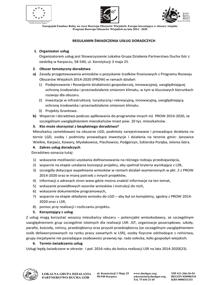 Europejski Fundusz Rolny na rzecz Rozwoju Obszarów Wiejskich: Europa inwestująca w obszary wiejskie Program Rozwoju Obszarów Wiejskich na lata 2014 - 2020 REGULAMIN ŚWIADCZENIA USŁUG DORADCZYCH 1. Organizator usług Organizatorem usług jest Stowarzyszenie Lokalna Grupa Działania Partnerstwo Ducha Gór z siedzibą w Karpaczu, 58-540, ul. Konstytucji 3 maja 25. 2. Obszar tematyczny doradztwa a) Zasady przygotowywania wniosków o pozyskanie środków finansowych z Programu Rozwoju Obszarów Wiejskich 2014-2020 (PROW) w ramach działań: 1) Podejmowanie i Rozwijanie działalności gospodarczej, innowacyjnej, uwzględniającej ochronę środowiska i przeciwdziałanie zmianom klimatu, w tym w kluczowych kierunkach rozwoju dla obszaru. 2) Inwestycje w infrastrukturę turystyczną i rekreacyjną, innowacyjną, uwzględniającą ochronę środowiska i przeciwdziałanie zmianom klimatu. 3) Projekty Grantowe. b) Wsparcie i doradztwo podczas aplikowania do programów innych niż PROW 2014-2020, ze szczególnym uwzględnieniem mieszkańców miast pow. 20 tys. mieszkańców. 3. Kto może skorzystać z bezpłatnego doradztwa? Mieszkańcy zameldowani na obszarze LGD, podmioty zarejestrowane i prowadzące działania na ternie LGD, osoby i podmioty prowadzące inwestycje i działania na terenie gmin: Janowice Wielkie, Karpacz, Kowary, Mysłakowice, Piechowice, Podgórzyn, Szklarska Poręba, Jelenia Góra. 4. Zakres usług doradczych Doradztwo oznacza tutaj: 1) wskazanie możliwości uzyskania dofinansowania na różnego rodzaju przedsięwzięcia, 2) wsparcie na etapie ustalania koncepcji projektu, aby spełniał kryteria wynikające z LSR, 3) szczegóły dotyczące wypełniania wniosków w ramach działań wymienionych w pkt. 2 z PROW 2014-2020 oraz w miarę potrzeb z innych projektów, 4) informacji o adresach stron www gdzie można znaleźć informacje na ten temat, 5) wskazanie prawidłowych wzorów wniosków i instrukcji do nich, 6) wskazanie dokumentów programowych, 7) wsparcie na etapie składania wniosku do LGD – aby był on kompletny, zgodny z PROW 20142020 oraz z LSR, 8) pomoc przy realizacji i rozliczaniu projektu. 5. Korzystający z usług Z usług mogą korzystać wszyscy mieszkańcy obszaru – potencjalni wnioskodawcy, ze szczególnym uwzględnieniem grup szczególnie istotnych dla realizacji LSR: JST, organizacje pozarządowe, szkoły, parafie, kościoły, rolnicy, przedsiębiorcy oraz przyszli przedsiębiorcy (ze szczególnym uwzględnieniem osób defaworyzowanych na rynku pracy zawartych w LSR), osoby fizyczne odchodzące z rolnictwa, grupy inicjatywne nie posiadające osobowości prawnej np. rada sołecka, koło gospodyń wiejskich. 6. Termin świadczenia usług Usługi będą świadczone w okresie: I poł. 2016 roku do końca realizacji LSR na lata 2014-2020(23). LOKALNA GRUPA DZIAŁANIA PARTNERSTWO DUCHA GÓR ul. Konstytucji 3 Maja 25 58-540 Karpacz www.duchgor.org; [email protected], Tel. 75 644 21 65 NIP 611-266-36-54 REGON 020906334 KRS 0000321321 Europejski Fundusz Rolny na rzecz Rozwoju Obszarów Wiejskich: Europa inwestująca w obszary wiejskie Program Rozwoju Obszarów Wiejskich na lata 2014 - 2020 Od wtorku do czwartku w godz. 10.00-14.00, po uprzednim umówieniu telefonicznym spotkania pod nr tel. 075 644 21 65. 7. Miejsce świadczenia usług Biuro LGD Partnerstwo Ducha Gór: 58-540 Karpacz, ul. Konstytucji 3 maja 25 lub w szczególnych wypadkach inne miejsce uzgodnione z doradcą. 8. Sposób świadczenia usług: Spotkanie bezpośrednie, zakończone wypełnieniem Kartu Usług Doradczych, która będzie przejrzystym źródłem informacji o beneficjantach i ich projektach. (załącznik nr 1 do Regulaminu) 9. Badanie jakości i efektywności świadczonego doradztwa: Przez cały okres wdrażania LSR 2014-2020(23) i udzielania doradztwa bezpośredniego będzie prowadzony pomiar pomiar oceny satysfakcji interesantów z jakości świadczonych usług: doradczych ( załącznik nr 2 do Regulaminu ) i szkoleniowych ( załącznik nr 3 do Regulaminu). 1. Ocena jakości świadczonego doradztwa i prowadzonych szkoleń: Ocena jakości świadczonego doradztwa mierzona będzie metodą ankietową, która ma posłużyć ocenie pracowników pod względem: wiedzy i kompetencji, poziomu obsługi klienta, fachowości udzielanych informacji, zaangażowaniu i gotowości do poszukiwania rozwiązań powstałych problemów i innych uwag do świadczonych usług doradczych. Ocena jakości prowadzonych szkoleń również będzie prowadzona metoda ankietową: ogólny poziom szkolenia, metodyka, przystępność i jakość materiałów, przygotowanie trenerów, atmosfera – relacje między uczestnikami a trenerami, możliwość wymiany doświadczeń, satysfakcja z udziału – spełnione oczekiwania, przekonanie o możliwości zastosowania, długość szkolenia, źródło informacji o szkoleniu. Analiza danych uzyskanych z ankiet pozwoli na ulepszanie słabo ocenionych punktów w ankietach co pozwoli na efektywniejsze wdrażanie LSR. 2. Ocena efektywności świadczonego doradztwa: Ocena efektywności świadczonego doradztwa będzie mierzona przez badanie stosunku udzielonego doradztwa do otrzymanych dofinansowań (dane będą dostępne dzięki odpowiedniej rubryce w karcie wykonania usług doradztwa). Załączniki do regulaminu: 1. Karta Wykonania Usług Doradczych. 2. Ankieta – Ocena jakości świadczonych usług doradczych. 3. Ankieta – Ocena jakości świadczonych usług szkoleniowych. LOKALNA GRUPA DZIAŁANIA PARTNERSTWO DUCHA GÓR ul. Konstytucji 3 Maja 25 58-540 Karpacz www.duchgor.org; [email protected], Tel. 75 644 21 65 NIP 611-266-36-54 REGON 020906334 KRS 0000321321