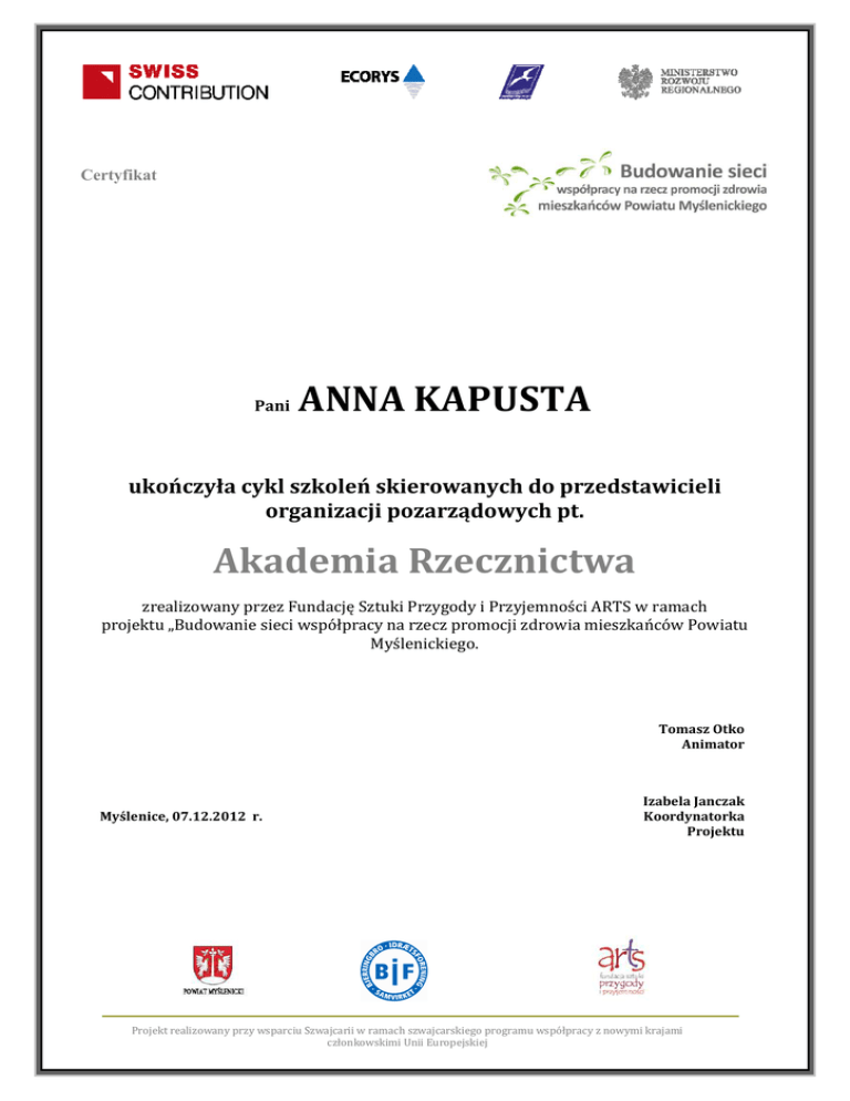Certyfikat Pani ANNA KAPUSTA ukończyła cykl szkoleń skierowanych do przedstawicieli przedstawici organizacji pozarządowych pt. Akademia Rzecznictwa zrealizowany przez Fundację Sztuki Przygody i Przyjemności ARTS w ramach projektu „Budowanie sieci współpracy na rzecz promocji zdrowia mieszkańców Powiatu Myślenickiego. Tomasz Otko Animator Myślenice, 07.12.2012 r. Izabela Janczak Koordynatorka Projektu Projekt realizowany przy wsparciu Szwajcarii w ramach szwajcarskiego programu współpracy z nowymi krajami członkowskimi Unii Europejskiej