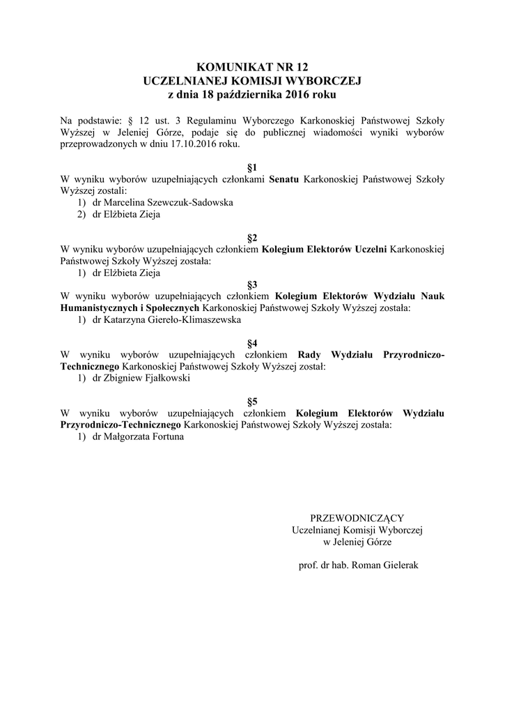 KOMUNIKAT NR 12 UCZELNIANEJ KOMISJI WYBORCZEJ z dnia 18 października 2016 roku Na podstawie: § 12 ust. 3 Regulaminu Wyborczego Karkonoskiej Państwowej Szkoły Wyższej w Jeleniej Górze, podaje się do publicznej wiadomości wyniki wyborów przeprowadzonych w dniu 17.10.2016 roku. §1 W wyniku wyborów uzupełniających członkami Senatu Karkonoskiej Państwowej Szkoły Wyższej zostali: 1) dr Marcelina Szewczuk-Sadowska 2) dr Elżbieta Zieja §2 W wyniku wyborów uzupełniających członkiem Kolegium Elektorów Uczelni Karkonoskiej Państwowej Szkoły Wyższej została: 1) dr Elżbieta Zieja §3 W wyniku wyborów uzupełniających członkiem Kolegium Elektorów Wydziału Nauk Humanistycznych i Społecznych Karkonoskiej Państwowej Szkoły Wyższej została: 1) dr Katarzyna Giereło-Klimaszewska §4 W wyniku wyborów uzupełniających członkiem Rady Wydziału PrzyrodniczoTechnicznego Karkonoskiej Państwowej Szkoły Wyższej został: 1) dr Zbigniew Fjałkowski §5 W wyniku wyborów uzupełniających członkiem Kolegium Elektorów Wydziału Przyrodniczo-Technicznego Karkonoskiej Państwowej Szkoły Wyższej została: 1) dr Małgorzata Fortuna PRZEWODNICZĄCY Uczelnianej Komisji Wyborczej w Jeleniej Górze prof. dr hab. Roman Gielerak