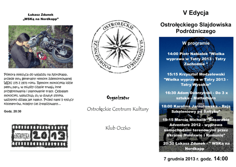 V Edycja Łukasz Zdunek „WSKą na Nordkapp” Ostrołęckiego Slajdowiska Podróżniczego W programie 14:00 Piotr Nabiałek "Wielka wyprawa w Tatry 2013 - Tatry Zachodnie " Półtora miesiąca do wyjazdu na Nordkapp, przede mną generalny remont zdemontowanej WSKi 175 z 1973 roku. Remont motocykla idzie pełną parą, w między czasie trwają inne przygotowania i planowanie trasy. Odpalam motocykl, wsłuchuję się w dźwięk silnika, wszystko działa jak należy. Przed nami 5 tysięcy kilometrów, kolejny cel zrealizowany... Godz. 20:30 15:15 Krzysztof Modzelewski "Wielka wyprawa w Tatry 2013 Tatry Wysokie” Organizator 16:30 Adam Dobrzyński - Do 3 x sztuka – Matterhorn Ostrołęckie Centrum Kultury 18:00 Karolina Jarnutowska – Rejs Szkoleniowy po Bałtyku” Klub Oczko 19:15 Marcin Michalik "Besarabia Adventure 2012 - wyprawa samochodami terenowymi przez Ukrainę Mołdawię i Rumunię" 20:30 Łukasz Zdunek - " WSKą na Nordkapp " 7 grudnia 2013 r. godz. 14:00 Krzysztof Modzelewski i Piotr Nabiałek „Wielka Wyprawa w Tatry 2013” Adam Dobrzyński „Do 3 x sztuka – Matterhorn” charakter rejsów morskich, zasady funkcjonowania na jachcie, nawigacja, manewry w portach. Załoga przekonała się jakie są różnice między żeglarstwem morskim, a śródlądowym. Godz. 18:00 Marcin Michalik "Besarabia Adventure 2012 - wyprawa samochodami terenowymi przez Ukrainę Mołdawię i Rumunię" Wyprawa zorganizowana pod patronatem Stowarzyszenia Ekomena, miała miejsce w dniach 9 23 sierpnia 2013 r. Obejmowała teren Tatr Zachodnich i Wysokich zarówno po polskiej jak i słowackiej stronie. „Przez 14 dni w terenie górskim przeszliśmy 265km pokonując 19680 metrów podejść, zdobywając 32 szczyty lub przełęcze o wysokości przekraczającej 2000 m n.p.m. Ja przy okazji skompletowałem Koronę Tatr Zachodnich i Wysokich. Uwieńczeniem wyprawy było przejście najpiękniejszego ale i zarazem najbardziej niebezpiecznego odcinka w Polskich Tatrach tzw. Orlej Perci czyli szlaku od Przełęczy Zawrat do Przełęczy Krzyżne”. Matterhorn - góra gór. Symbol Alp. Próbowaliśmy go zdobywać trzy razy. Dwukrotnie odeszliśmy pokonani przez własne słabości i pogodę. Ale jak mawiają do trzech razy sztuka. I za trzecim razem się udało... Prezentacja z trzech prób zdobycia Matterhornu 4478 m n.p.m. sierpień 2010 lipiec 2011 sierpień 2013. Szczyt Zdobyty przez Adama Dobrzyńskiego i Marcina Ząbkiewicza Godz. 16:30 Karolina Jarnutowska „Rejs szkoleniowy przez Bałtyk” Piotr Nabiałek „Wielka wyprawa w Tatry 2013 – Tatry Zachodnie” godz. 14:00 „Besarabia Adventure 2012", przemianowania w trakcie na "Nieodżałowany Kiszyniów" to wyprawa karawany 6 samochodów terenowych przemierzających drogi i bezdroża zachodniej Ukrainy, Mołdawii i Rumunii. Podróż zaplanowana była na poznanie tych krajów takimi, jakie są, niezniszczonych przez masową turystykę, kontakt z mieszkańcami i offroadowe wypady samochodowe. Godz. 19:15 Krzysztof Modzelewski „Wielka wyprawa w Tatry – Tary Wysokie” godz. 15:15 Pierwsza wyprawa na morze wodniaków z Harcerskiego Ośrodka Wodnego w Ostrołęce -