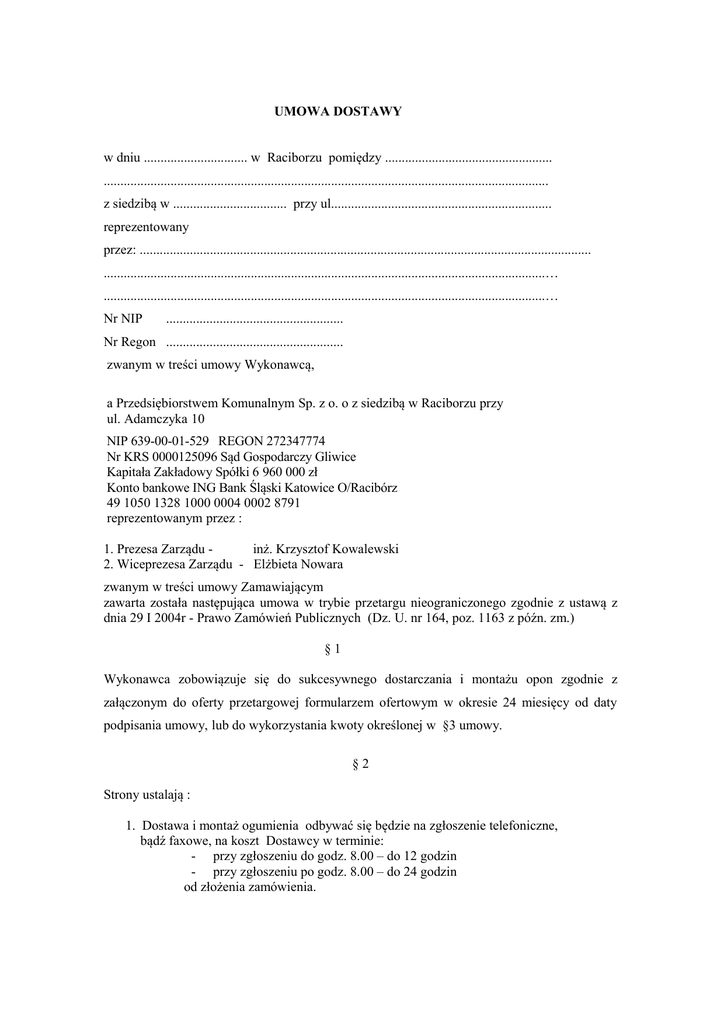 UMOWA DOSTAWY w dniu ............................... w Raciborzu pomiędzy .................................................. ..................................................................................................................................... z siedzibą w .................................. przy ul.................................................................. reprezentowany przez: ....................................................................................................................................... ....................................................................................................................................… ....................................................................................................................................… Nr NIP ..................................................... Nr Regon ..................................................... zwanym w treści umowy Wykonawcą, a Przedsiębiorstwem Komunalnym Sp. z o. o z siedzibą w Raciborzu przy ul. Adamczyka 10 NIP 639-00-01-529 REGON 272347774 Nr KRS 0000125096 Sąd Gospodarczy Gliwice Kapitała Zakładowy Spółki 6 960 000 zł Konto bankowe ING Bank Śląski Katowice O/Racibórz 49 1050 1328 1000 0004 0002 8791 reprezentowanym przez : 1. Prezesa Zarządu inż. Krzysztof Kowalewski 2. Wiceprezesa Zarządu - Elżbieta Nowara zwanym w treści umowy Zamawiającym zawarta została następująca umowa w trybie przetargu nieograniczonego zgodnie z ustawą z dnia 29 I 2004r - Prawo Zamówień Publicznych (Dz. U. nr 164, poz. 1163 z późn. zm.) §1 Wykonawca zobowiązuje się do sukcesywnego dostarczania i montażu opon zgodnie z załączonym do oferty przetargowej formularzem ofertowym w okresie 24 miesięcy od daty podpisania umowy, lub do wykorzystania kwoty określonej w §3 umowy. §2 Strony ustalają : 1. Dostawa i montaż ogumienia odbywać się będzie na zgłoszenie telefoniczne, bądź faxowe, na koszt Dostawcy w terminie: - przy zgłoszeniu do godz. 8.00 – do 12 godzin - przy zgłoszeniu po godz. 8.00 – do 24 godzin od złożenia zamówienia. 2 2. Rozładunek towaru (jeżeli nastąpi taka potrzeba) będzie obejmował również wniesienie go do magazynu Zamawiającego w Raciborzu przy ul. Adamczyka 10. 3. W przypadku, pilnej potrzeby ponadplanowej dostawy towaru Wykonawca dostarczy ogumienie do 8 godzin od złożenia zapotrzebowania. 4. Godziny dostawy ogumienia 900 do 1400 5. W przypadku dostawy zamawianych towarów niezgodnych z zamówieniem Wykonawca zobowiązany jest wymienić towar w terminie do 24 godzin od dostarczenia towaru wadliwego. 6. Ewentualne reklamacje ilościowe dot. zamówienia powinny być złożone w dniu dostawy, natomiast jakościowe w dniu ich ujawnienia. 7. Wykonawca obowiązany jest do załatwienia reklamacji niezwłocznie w terminie nie przekraczającym 24 godz. od jej złożenia pod rygorem odstąpienia od umowy przez Zamawiającego. §3 Cena za dostawę przedmiotu zamówienia zgodnie z załącznikiem cenowym wynosi : netto .................................................................. (słownie: ...............................................................................................................) podatek VAT wynosi: ................ tj. ...................................................................... (słownie: ............................................................................................................... ) Kwota brutto: ........................................................ (słownie: ................................................................................................................ ) 1. Cena oferty musi zawierać wszystkie koszty związane z realizacją zadania określonego w § 3 SIWZ, jak również koszty nie ujęte a niezbędne do wykonania zadania. 2. Zapłata za każdorazową dostawę ogumienia nastąpi przelewem na podstawie wystawionej faktury w terminie 30 dni od dnia doręczenia jej Zamawiającemu. §4 1. Wykonawca zobowiązuje się zapłacić Zamawiającemu karę umowną w przypadku: a) gdy Zamawiający odstąpi od umowy z przyczyn za które ponosi odpowiedzialność Wykonawca w wysokości 10% wartości przedmiotu zamówienia brutto. b) zwłoki w wykonaniu umowy w wysokości 0,2% wartości przedmiotu zamówienia brutto za każdy dzień zwłoki. 3 c) za zwłokę w usunięciu usterek w wysokości 0,5 % wartości przedmiotu zamówienia brutto za każdy dzień zwłoki licząc od dnia wyznaczonego na jej usunięcie. 2. Zamawiający zobowiązuje się zapłacić Wykonawcy karę umowną w przypadku: - gdy Wykonawca odstąpi od umowy z przyczyn za które ponosi odpowiedzialność Zamawiający, w wysokości 10 % wartości przedmiotu zamówienia brutto. 3. Zamawiający może dochodzić odszkodowania przewyższającego karę umowną w przypadku gdy powstała szkoda przewyższa wartość zamówienia, oraz w innych przypadkach, nie wykonania lub nienależytego wykonania umowy. §5 W przypadku nienależytej realizacji umowy przez Wykonawcę, wynikającej z nagminnego niedotrzymywania terminów, a także powtarzających ciągłych się braków w zamawianym asortymencie Zamawiający zastrzega sobie prawo do rozwiązania umowy w trybie natychmiastowym bez wypowiedzenia. §6 Wykonawca udziela gwarancji na : Opony nowe Opony bieżnikowane Dętki Ochraniacze ................................................. ................................................. ................................................. ................................................. §7 Umowa zostaje zawarta na okres 24 miesięcy, zaś ceny nie będą podlegały zmianom przez cały okres trwania umowy. §8 Zamawiający może dochodzić odszkodowania przewyższającego naliczoną karę umowną w przypadku gdy powstała szkoda przewyższa wartość zamówienia oraz w innych przypadkach niewykonania lub nienależytego wykonania umowy. §9 Zmiany niniejszej umowy wymagają formy pisemnej pod rygorem nieważno