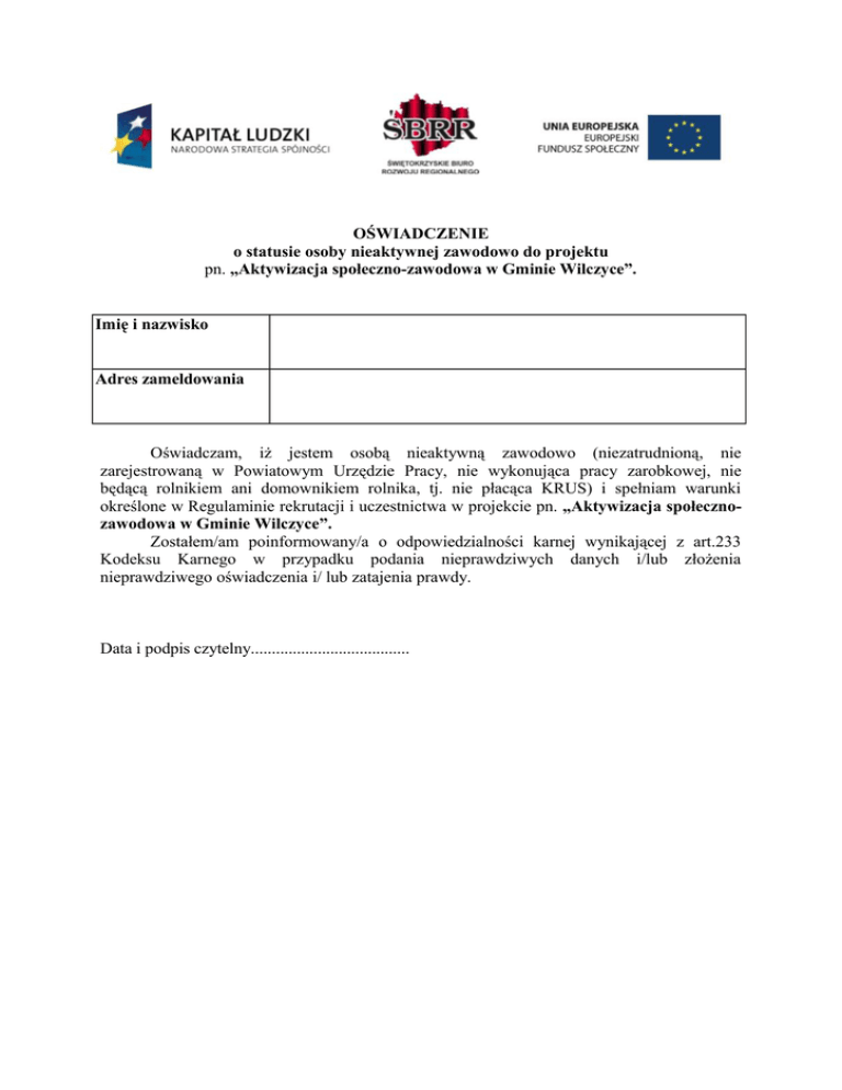 OŚWIADCZENIE o statusie osoby nieaktywnej zawodowo do projektu pn. „Aktywizacja społeczno-zawodowa w Gminie Wilczyce”. Imię i nazwisko Adres zameldowania Oświadczam, iż jestem osobą nieaktywną zawodowo (niezatrudnioną, nie zarejestrowaną w Powiatowym Urzędzie Pracy, nie wykonująca pracy zarobkowej, nie będącą rolnikiem ani domownikiem rolnika, tj. nie płacąca KRUS) i spełniam warunki określone w Regulaminie rekrutacji i uczestnictwa w projekcie pn. „Aktywizacja społecznozawodowa w Gminie Wilczyce”. Zostałem/am poinformowany/a o odpowiedzialności karnej wynikającej z art.233 Kodeksu Karnego w przypadku podania nieprawdziwych danych i/lub złożenia nieprawdziwego oświadczenia i/ lub zatajenia prawdy. Data i podpis czytelny......................................