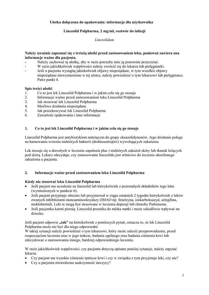 Ulotka dołączona do opakowania: informacja dla użytkownika Linezolid Polpharma, 2 mg/ml, roztwór do infuzji Linezolidum Należy uważnie zapoznać się z treścią ulotki przed zastosowaniem leku, ponieważ zawiera ona informacje ważne dla pacjenta. Należy zachować tę ulotkę, aby w razie potrzeby móc ją ponownie przeczytać. W razie jakichkolwiek wątpliwości należy zwrócić się do lekarza lub pielęgniarki. Jeśli u pacjenta wystąpią jakiekolwiek objawy niepożądane, w tym wszelkie objawy niepożądane niewymienione w tej ulotce, należy powiedzieć o tym lekarzowi lub pielęgniarce. Patrz punkt 4. Spis treści ulotki 1. Co to jest lek Linezolid Polpharma i w jakim celu się go stosuje 2. Informacje ważne przed zastosowaniem leku Linezolid Polpharma 3. Jak stosować lek Linezolid Polpharma 4. Możliwe działania niepożądane 5. Jak przechowywać lek Linezolid Polpharma 6. Zawartość opakowania i inne informacje 1. Co to jest lek Linezolid Polpharma i w jakim celu się go stosuje Linezolid Polpharma jest antybiotykiem należącym do grupy oksazolidynonów. Jego działanie polega na hamowaniu wzrostu niektórych bakterii (drobnoustrojów) wywołujących zakażenia. Lek stosuje się u dorosłych w leczeniu zapalenia płuc i niektórych zakażeń skóry lub tkanek leżących pod skórą. Lekarz zdecyduje, czy zastosowanie linezolidu jest właściwe do leczenia określonego zakażenia u pacjenta. 2. Informacje ważne przed zastosowaniem leku Linezolid Polpharma Kiedy nie stosować leku Linezolid Polpharma Jeśli pacjent ma uczulenie na linezolid lub którykolwiek z pozostałych składników tego leku (wymienionych w punkcie 6). Jeśli pacjent przyjmuje obecnie lub przyjmował w ciągu ostatnich 2 tygodni którykolwiek z leków zwanych inhibitorami monoaminooksydazy (IMAO np. fenelzyna, izokarboksazyd, selegilina, moklobemid). Leki te mogą być stosowane w leczeniu depresji lub choroby Parkinsona. Jeśli pacjentka karmi piersią. Linezolid przenika do mleka matki i może szkodliwie wpływać na dziecko. Jeśli pacjent odpowie „tak” na którekolwiek z poniższych pytań, oznacza to, że lek Linezolid Polpharma może nie być dla niego odpowiedni. W takiej sytuacji należy powiedzieć o tym lekarzowi, który może zalecić przeprowadzenie, przed rozpoczęciem leczenia oraz w jego trakcie, badania ogólnego oraz badania ciśnienia krwi lub zdecydować o zastosowaniu innego, bardziej odpowiedniego leczenia. W razie jakichkolwiek wątpliwości, czy pacjenta dotyczą opisane poniżej sytuacje, należy zapytać lekarza. Czy pacjent ma wysokie ciśnienie tętnicze krwi i czy w związku z tym przyjmuje leki, czy nie? Czy u pacjenta stwierdzono nadczynność tarczycy? 1 Czy pacjent ma guza nadnerczy (guz chromochłonny nadnerczy) lub zespół rakowiaka (spowodowany przez guza układu hormonalnego, z takimi objawami, jak biegunka, uderzenia gorąca, świszczący oddech)? Czy u pacjenta występuje: depresja dwubiegunowa, zaburzenia schizoafektywne, stany dezorientacji lub inne zaburzenia psychiczne? Czy pacjent przyjmuje którykolwiek z następujących leków: - leki zmniejszające przekrwienie błon śluzowych, stosowane w przeziębieniu lub grypie, zawierające pseudoefedrynę lub fenylopropanolaminę, - leki stosowane w leczeniu astmy, np. salbutamol, terbutalina, fenoterol, - leki przeciwdepresyjne, znane jako trójcykliczne leki przeciwdepresyjne lub SSRI (inhibitory wychwytu zwrotnego serotoniny), np. amitryptylina, cypramil, klomipramina, dosulepina, doksepina, fluoksetyna, fluwoksamina, imipramina, lofepramina, paroksetyna, sertralina, - leki stosowane w leczeniu migreny, np. sumatryptan i zolmitryptan, - leki stosowane w leczeniu nagłych, ciężkich reakcji alergicznych, np. adrenalina (epinefryna), - leki które podwyższają ciśnienie krwi, np. noradrenalina (norepinefryna), dopamina i dobutamina, - leki przeciwbólowe stosowane w umiarkowanym lub ciężkim bólu, np. petydyna, - leki stosowane w leczeniu zaburzeń lękowych, np. buspiron, - antybiotyk zwany ryfampicyną. Ostrzeżenia i środki ostrożności Jeżeli u pacjenta występują wymienione niżej zaburzenia, należy poinformować o tym lekarza przed rozpoczęciem przyjmowania leku: skłonność do siniaków i krwawień, niedokrwistość, podatność na zakażenia, występujące w przeszłości napady drgawek, zaburzenia czynności wątroby lub nerek, szczególnie jeśli pacjent jest dializowany, biegunka. Należy niezwłocznie poinformować lekarza, jeżeli podczas leczenia u pacjenta wystąpią: zaburzenia widzenia, takie jak nieostre widzenie, zmiany widzenia barwnego, trudności z dostrzeżeniem szczegółów lub zawężenie pola widzenia; utrata czucia w rękach lub nogach bądź uczucie mrowienia czy kłucia; biegunka, która może wystąpić podczas lub po zakończeniu stosowania antybiotyków, w tym leku Linezolid Polpharma; jeżeli biegunka będzie ciężka lub uporczywa lub jeśli w kale będzie widoczna krew lub śluz, należy niezwłocznie przerwać przyjmowanie leku Linezolid Polpharma i skontaktować się z lekarzem; w takiej sytuacji nie należy przyjmować leków, które zatrzymują lub spowalniają ruchy jelit. nawracające nudności lub wymioty, ból brzucha lub zwiększona częstość oddechów. Linezolid Polpharma a inne leki Linezolid Polpharma może czasami oddziaływać z niektórymi innymi lekami, co z kolei może spowodować działania niepożądane, takie jak zmiana ciśnienia krwi, temperatury lub częstości akcji serca. Jeśli w okresie ostatnich 2 tygodni pacjent stosował którykolwiek z niżej wymienionych leków, należy powiedzieć o tym lekarzowi, ponieważ przeciwwskazane jest wówczas stosowanie leku Linezolid Polpharma (patrz także punkt 2 „Kiedy nie stosować leku Linezolid Polpharma”): inhibitory monoaminooksydazy (IMAO, np. fenelzyna, izokarboksazyd, selegilina, moklobemid). Leki te stosowane są w leczeniu depresji lub choroby Parkinsona. 2 Należy również po