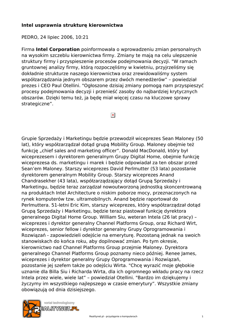 Intel usprawnia strukturę kierownictwa PEDRO, 24 lipiec 2006, 10:21 Firma Intel Corporation poinformowała o wprowadzeniu zmian personalnych na wysokim szczeblu kierownictwa firmy. Zmiany te mają na celu ulepszenie struktury firmy i przyspieszenie procesów podejmowania decyzji. "W ramach gruntownej analizy firmy, którą rozpoczęliśmy w kwietniu, przyjrzeliśmy się dokładnie strukturze naszego kierownictwa oraz zrewidowaliśmy system współzarządzania jednym obszarem przez dwóch menedżerów” – powiedział prezes i CEO Paul Otellini. "Ogłoszone dzisiaj zmiany pomogą nam przyspieszyć procesy podejmowania decyzji i przenieść zasoby do najbardziej krytycznych obszarów. Dzięki temu też, ja będę miał więcej czasu na kluczowe sprawy strategiczne”. Grupie Sprzedaży i Marketingu będzie przewodził wiceprezes Sean Maloney (50 lat), który współzarządzał dotąd grupą Mobility Group. Maloney obejmie też funkcję „chief sales and marketing officer”. Donald MacDonald, który był wiceprezesem i dyrektorem generalnym Grupy Digital Home, obejmie funkcję wiceprezesa ds. marketingu i marek i będzie odpowiadał za ten obszar przed Sean’em Maloney. Starszy wiceprezes David Perlmutter (53 lata) pozostanie dyrektorem generalnym Mobility Group. Starszy wiceprezes Anand Chandrasekher (43 lata), współzarządzający dotąd Grupą Sprzedaży i Marketingu, będzie teraz zarządzał nowoutworzoną jednostką skoncentrowaną na produktach Intel Architecture o niskim poborze mocy, przeznaczonych na rynek komputerów tzw. ultramobilnych. Anand będzie raportował do Perlmuttera. 51-letni Eric Kim, starszy wiceprezes, który współzarządzał dotąd Grupą Sprzedaży i Marketingu, będzie teraz piastował funkcję dyrektora generalnego Digital Home Group. William Siu, weteran Intela (26 lat pracy) – wiceprezes i dyrektor generalny Channel Platforms Group, oraz Richard Wirt, wiceprezes, senior fellow i dyrektor generalny Grupy Oprogramowania i Rozwiązań - zapowiedzieli odejście na emeryturę. Pozostaną jednak na swoich stanowiskach do końca roku, aby dopilnować zmian. Po tym okresie, kierownictwo nad Channel Platforms Group przejmie Maloney. Dyrektora generalnego Channel Platforms Group poznamy nieco później. Renee James, wiceprezes i dyrektor generalny Grupy Oprogramowania i Rozwiązań, pozostanie jej szefem także po odejściu Wirta. "Chcę wyrazić moje głębokie uznanie dla Billa Siu i Richarda Wirta, dla ich ogromnego wkładu pracy na rzecz Intela przez wiele, wiele lat” – powiedział Otellini. "Bardzo im dziękujemy i życzymy im wszystkiego najlepszego w czasie emerytury”. Wszystkie zmiany obowiązują od dnia dzisiejszego. Realitynet.pl - przystępnie o komputerach 1