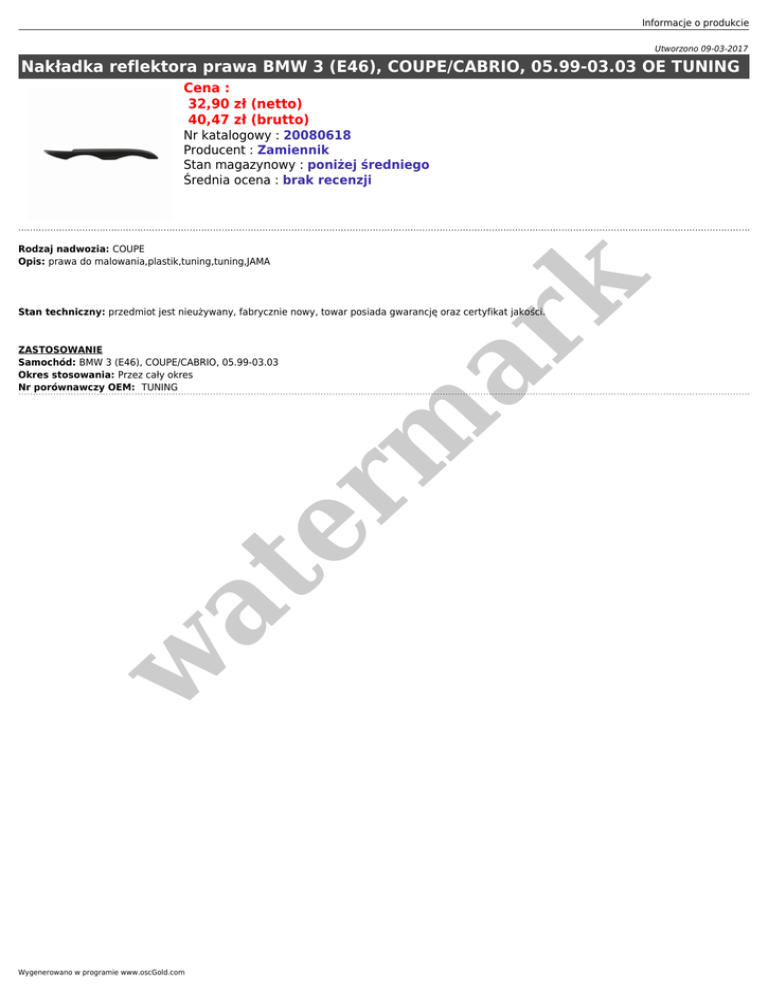 Informacje o produkcie Utworzono 09-03-2017 Nakładka reflektora prawa BMW 3 (E46), COUPE/CABRIO, 05.99-03.03 OE TUNING Cena : 32,90 zł (netto) 40,47 zł (brutto) Nr katalogowy : 20080618 Producent : Zamiennik Stan magazynowy : poniżej średniego Średnia ocena : brak recenzji er m ar k Rodzaj nadwozia: COUPE Opis: prawa do malowania,plastik,tuning,tuning,JAMA Stan techniczny: przedmiot jest nieużywany, fabrycznie nowy, towar posiada gwarancję oraz certyfikat jakości. w at ZASTOSOWANIE Samochód: BMW 3 (E46), COUPE/CABRIO, 05.99-03.03 Okres stosowania: Przez cały okres Nr porównawczy OEM: TUNING Wygenerowano w programie www.oscGold.com