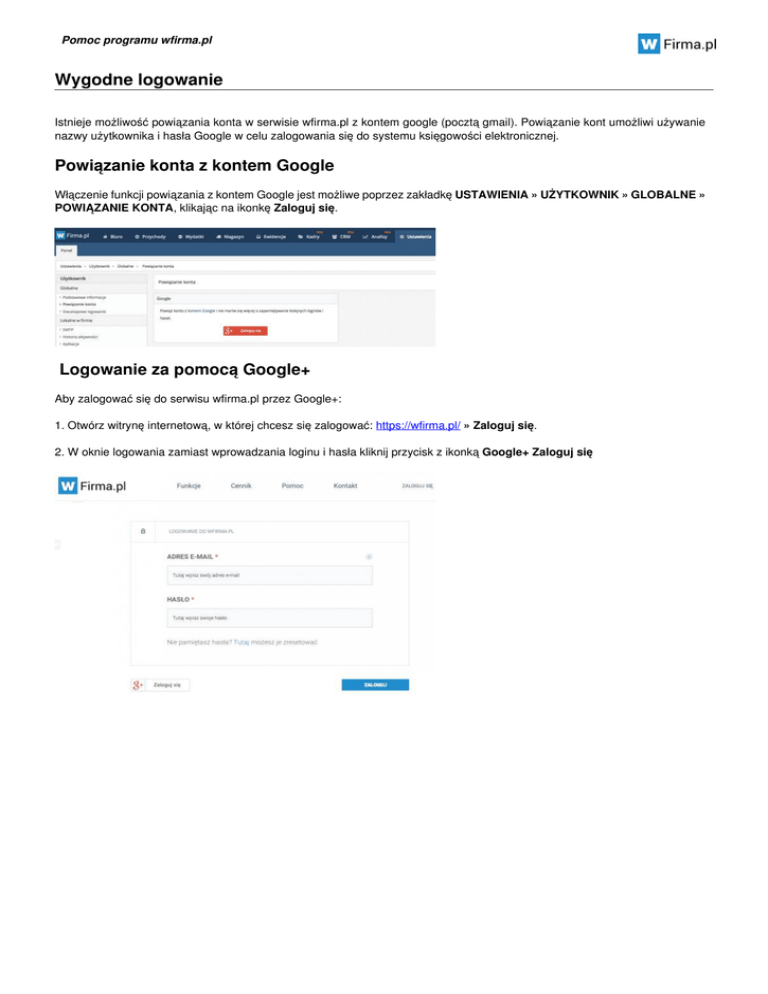 Pomoc programu wfirma.pl Wygodne logowanie Istnieje możliwość powiązania konta w serwisie wfirma.pl z kontem google (pocztą gmail). Powiązanie kont umożliwi używanie nazwy użytkownika i hasła Google w celu zalogowania się do systemu księgowości elektronicznej. Powiązanie konta z kontem Google Włączenie funkcji powiązania z kontem Google jest możliwe poprzez zakładkę USTAWIENIA » UŻYTKOWNIK » GLOBALNE » POWIĄZANIE KONTA, klikając na ikonkę Zaloguj się. Logowanie za pomocą Google+ Aby zalogować się do serwisu wfirma.pl przez Google+: 1. Otwórz witrynę internetową, w której chcesz się zalogować: https://wfirma.pl/ » Zaloguj się. 2. W oknie logowania zamiast wprowadzania loginu i hasła kliknij przycisk z ikonką Google+ Zaloguj się Powered by TCPDF (www.tcpdf.org)