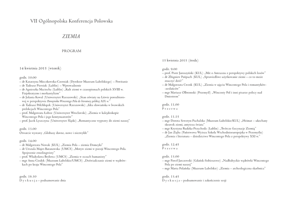 VII Ogólnopolska Konferencja Polowska ZIEMIA PROGRAM 15 kwietnia 2015 (środa) 14 kwietnia 2015 (wtorek) godz. 10.00 – dr Katarzyna Mieczkowska-Czerniak (Dyrektor Muzeum Lubelskiego) – Powitanie – dr Tadeusz Piersiak (Lublin) – Wprowadzenie – dr Agnieszka Maciocha (Lublin) „Kult ziemi w czasopismach polskich XVIII w. Fizjokratyzm i merkantylizm” – dr Jolanta Kowal (Uniwersytet Rzeszowski) „Stan oświaty na Litwie porozbiorowej w perspektywie Pamiętnika Wincentego Pola do literatury polskiej XIX w.” – dr Tadeusz Półchłopek (Uniwersytet Rzeszowski) „Idea słowiańska w lwowskich prelekcjach Wincentego Pola” – prof. Małgorzata Łoboz (Uniwersytet Wrocławski) „Ziemia w kalejdoskopie Wincentego Pola i jego kontynuatorów” – prof. Jacek Lyszczyna (Uniwersytet Śląski) „Romantyczne wyprawy do ziemi naszej” godz. 13.00 Otwarcie wystawy „Globusy dawne, nowe i niezwykłe” godz. 14.00 – dr Małgorzata Nowak (KUL) „Ziemia Pola – ziemia Domeyki” – dr Urszula Majer-Baranowska (UMCS) „Motyw ziemi w poezji Wincentego Pola. Spojrzenie etnolingwisty” – prof. Władysława Bryłowa (UMCS) „Ziemia w oczach humanisty” – mgr Anna Ciodyk (Muzeum Lubelskie/UMCS) „Doświadczanie ziemi w wędrówkach po kraju Wincentego Pola” godz. 9.00 – prof. Piotr Jaroszyński (KUL) „Mit o Anteuszu z perspektywy polskich losów” – dr Zbigniew Pańpuch (KUL) „Sprawiedliwe użytkowanie ziemi – co to może znaczyć dziś?” – dr Małgorzata Cwenk (KUL) „Ziemia w ujęciu Wincentego Pola i romantyków-zesłańców” – mgr Mariusz Olbromski (Przemyśl) „Wincenty Pol i inni pisarze polscy nad Dniestrem” godz. 11.00 Przerwa godz. 11.15 – mgr Dorota Seweryn-Puchalska (Muzeum Lubelskie/KUL) „Heimat – ukochany skrawek ziemi, antyteza świata” – mgr Krystyna Rudzka-Przychoda (Lublin) „Twórcze fascynacje Ziemią” – dr Jan Zięba (Państwowa Wyższa Szkoła Wschodnioeuropejska w Przemyślu) „Ziemia i literatura – dziedzictwo Wincentego Pola z perspektywy XXI w.” godz. 12.45 Przerwa godz. 13.00 – mgr Paweł Jarczewski (Gdańsk-Sobieszewo) „Nadbałtyckie wędrówki Wincentego Pola po ziemi naszej” – mgr Marta Polańska (Muzeum Lubelskie) „Ziemia – archeologiczna skarbnica” godz. 16.30 godz. 13.45 D y s k u s j a – podsumowanie dnia D y s k u s j a – podsumowanie i zakończenie sesji