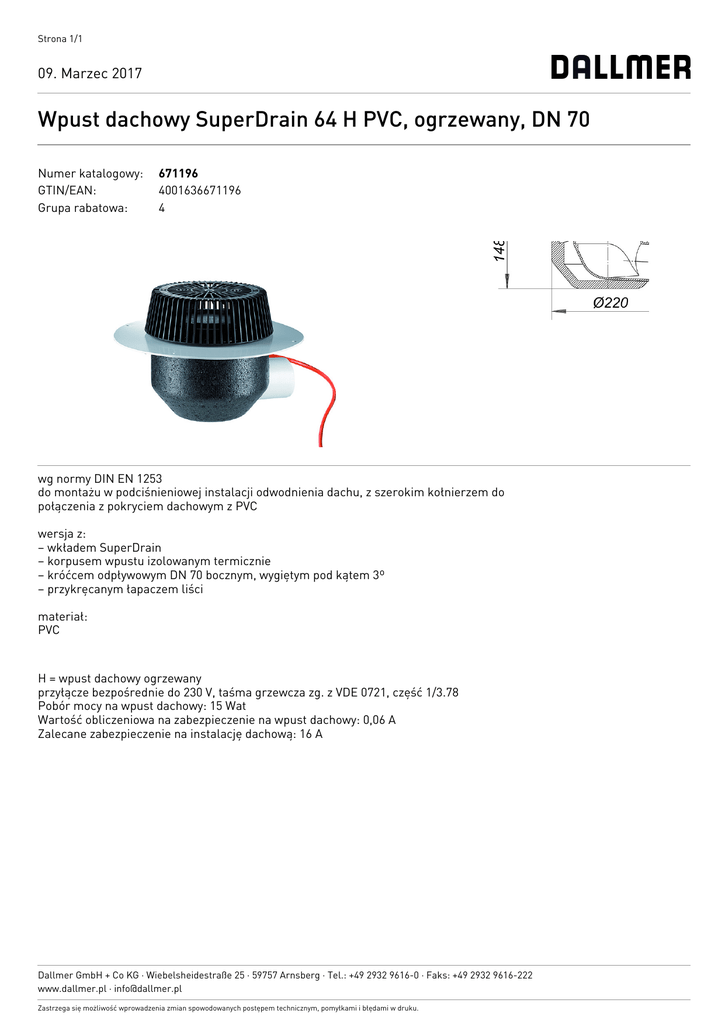 Strona 1/1 09. Marzec 2017 Wpust dachowy SuperDrain 64 H PVC, ogrzewany, DN 70 Numer katalogowy: GTIN/EAN: Grupa rabatowa: 671196 4001636671196 4 wg normy DIN EN 1253 do montażu w podciśnieniowej instalacji odwodnienia dachu, z szerokim kołnierzem do połączenia z pokryciem dachowym z PVC wersja z: – wkładem SuperDrain – korpusem wpustu izolowanym termicznie – króćcem odpływowym DN 70 bocznym, wygiętym pod kątem 3º – przykręcanym łapaczem liści materiał: PVC H = wpust dachowy ogrzewany przyłącze bezpośrednie do 230 V, taśma grzewcza zg. z VDE 0721, część 1/3.78 Pobór mocy na wpust dachowy: 15 Wat Wartość obliczeniowa na zabezpieczenie na wpust dachowy: 0,06 A Zalecane zabezpieczenie na instalację dachową: 16 A Dallmer GmbH + Co KG · Wiebelsheidestraße 25 · 59757 Arnsberg · Tel.: +49 2932 9616-0 · Faks: +49 2932 9616-222 www.dallmer.pl · [email protected] Zastrzega się możliwość wprowadzenia zmian spowodowanych postępem technicznym, pomyłkami i błędami w druku.