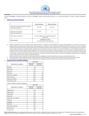 Warunki Oferty Promocyjnej „Era Domowa. Wyjątkowa okazja” w sieci Era Nowa oferta Polskiej Telefonii Cyfrowej Sp. z o.o., operatora sieci Era I. Opis oferty W okresie od 01.07.2009 r. do odwołania, jednakże nie dłużej niż do 31.07.2009 r. (włącznie), Polska Telefonia Cyfrowa Sp. z o.o. (zwana dalej „Operatorem”) w związku z usługami konwergentnymi oferuje: 1. PROMOCYJNĄ TARYFĘ ERA DOMOWA Abonament z upustem promocyjnym na cały okres obowiązywania Załącznika Załącznik na czas oznaczony Oferta z telefonem Oferta bez telefonu 30 zł z VAT 25 zł z VAT 24 lub 36 24 (pełne Cykle rozliczeniowe) 60 minut na połączenia do wszystkich krajowych sieci Minuty wliczone w abonament stacjonarnych Abonament 1 zł z VAT Oferta specjalna a) na 2 pierwsze, pełne Cykle rozliczeniowe Podpisanie Załącznika do Umowy o Świadczenie Usług Telekomunikacyjnych na Świadczenie Usług Konwergentnych (zwanego dalej „Załącznikiem”) w ramach oferty „Era Domowa. Wyjątkowa okazja” jest zawsze związane ze świadczeniem usług konwergentnych w powiązaniu z Umową o Świadczenie Usług Telekomunikacyjnych w odniesieniu do numeru komórkowego w systemie abonamentowym sieci Era (nie dotyczy systemu Era Mix). Z zastrzeżeniem wyłączenia numerów systemu Era Mix, numer komórkowy, z którym jest powiązany numer stacjonarny może być wyłącznie aktywnym (na podstawie uprzednio zawartej Umowy), abonamentowym numerem w sieci Era lub numerem abonamentowym w sieci Era bezpłatnie zawieszonym na podstawie niniejszych Warunków Oferty Promocyjnej przydzielonym w ramach taryfy Era Nowy Komfort z Ofertą uniwersalną lub w ramach innej taryfy, dla której zakończył się okres obowiązywania umowy terminowej zawartej w ramach promocji, przy czym w dowolnym momencie dostępna jest możliwość odwołania statusu zawieszenia i przydzielenia mu statusu aktywny w ramach taryfy, w której ten numer komórkowy został zawieszony lub w ramach taryfy cennikowej (nie promocyjnej). Uprawnienie do bezpłatnego zawieszania numeru w przypadkach opisanych powyżej Abonent nabywa w związku z podpisaniem Załącznika. Numer stacjonarny nie może być powiązany z numerem użytkownika telefonu działającego w usłudze Podział Płatności lub aktywnym na taryfie Pakiet Biznes Firma. 2. b) Pozostałe szczegółowe warunki usług konwergentnych świadczonych na warunkach niniejszej promocji i naliczania opłat za te usługi opisane są w „Cenniku taryfy Era Domowa”. c) Numer stacjonarny nie może być powiązany z numerem użytkownika telefonu działającego w usłudze Podział Płatności lub aktywnym na taryfie Pakiet Biznes Firma. PROMOCYJNE CENY TELEFONÓW I URZĄDZEŃ: Cena z VAT Model telefonu / urządzenia Umowa na 24 pełne Cykle rozliczeniowe Era ED20 Umowa na 36 pełnych Cykli rozliczeniowych 49 1 Netkom ED1 99 1 Nokia 1209 69 1 Nokia 2610 Nokia 2610 + podstawka 99 19 129 49 Nokia 3110 clasic 199 69 Panasonic KX-TW500 199 129 Sony Ericsson T280i 149 1 Telefony i urządzenia w ograniczonej dostępności Cena z VAT Model telefonu / urządzenia Umowa na 24 pełne Cykle rozliczeniowe Umowa na 36 pełnych Cykli rozliczeniowych Sagem myH10L 49 1 Sagem RL300 99 1 Sagem RL302 99 49 Nokia 1208 69 1 149 1 Sagem my411X + podstawka LG KG130 99 1 LG KG275 49 1 Nokia 1600 69 1 Nokia 1600 + podstawka 69 1 Samsung C140 69 1 Samsung C170 99 1 Polska Telefonia Cyfrowa Sp. z o.o. z siedzibą: 02-222 Warszawa, Al. Jerozolimskie 181, zarejestrowana w Sądzie Rejonowym dla m. st. Warszawy w XII Wydziale Gospodarczym Krajowego Rejestru Sądowego, pod numerem rejestrowym KRS 29159, NIP 526-10-40-567, Regon: 011417295, o kapitale zakładowym w wysokości 471 mln PLN Kod promocji 039/07 Strona 1 z 3 Samsung C260 79 1 Opłata za telefony i urządzenia podana jest w złotych i zawiera podatek VAT 3. PRZYŁĄCZENIE DO SIECI ERA Opłata za przyłączenie w niniejszej promocji związanej z usługami konwergentnymi wynosi 1 zł z VAT (0,82 zł netto). Opłata ta jest uwzględniana na pierwszej fakturze. Karta SIM związana z numerem stacjonarnym, działa w każdym telefonie oferowanym przez Operatora oraz w każdym innym telefonie GSM/3G nieposiadającym blokady karty SIM i przystosowanym do współpracy z kartami SIM sieci Era. 4. POZOSTAŁE WARUNKI: a) b) Cesja nie powoduje zmiany niniejszych warunków oferty promocyjnej. Operator zastrzega sobie prawo do określenia warunków koniecznych do przeprowadzenia cesji w Załączniku cenowym. Z oferty może skorzystać osoba fizyczna, która przy zakupie aktywacji w taryfie Era Domowa w Autoryzowanym Punkcie Sprzedaży sieci Era, w Salonie lub Sklepie Firmowym sieci Era spełni łącznie poniższe warunki: • przedstawi dowód osobisty oraz, • okaże oryginał Aneksu do Umowy lub Umowę o Świadczenie Usług Telekomunikacyjnych (z wyłączeniem Umowy z taryfą Nowy Komfort Zawieszony) w terminie nie późniejszym niż 21 dni od daty jego podpisania. Aneks lub Umowa muszą być wystawione na osobę zawierającą nowy Załącznik w ramach oferty promocyjnej „Era Domowa. Wyjątkowa okazja” oraz, • podpisze Załącznik na czas oznaczony 24 lub 36 pełnych Cykli rozliczeniowych. c) Z oferty może skorzystać każdy przedsiębiorca w rozumieniu odpowiednich przepisów prawa, który przy zakupie aktywacji w taryfie Era Domowa w Autoryzowanym Punkcie Sprzedaży sieci Era, w Salonie lub Sklepie Firmowym sieci Era, u Doradcy Biznesowego lub Autoryzowanego Doradcy Biznesowego spełni łącznie poniższe warunki: • przedłoży dokumenty potrzebne do zawarcia Umowy o Świadczenie Usług Telekomunikacyjnych oraz • okaże oryginał Aneksu do Umowy bądź Umowę o Świadczenie Usług Telekomunikacyjnych (z wyłączeniem Umowy z taryfą Nowy Komfort Zawieszony) w terminie nie późniejszym niż 21 dni od daty jego podpisania. Aneks lub Umowa muszą być wystawione na osobę zawierającą nowy Załącznik w ramach oferty promocyjnej „Era Domowa. Wyjątkowa okazja” oraz, • 