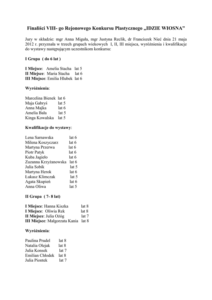 Finaliści VIII- go Rejonowego Konkursu Plastycznego „IDZIE WIOSNA” Jury w składzie: mgr Anna Miguła, mgr Justyna Reclik, dr Franciszek Nieć dnia 21 maja 2012 r. przyznała w trzech grupach wiekowych I, II, III miejsca, wyróżnienia i kwalifikacje do wystawy następującym uczestnikom konkursu: I Grupa ( do 6 lat ) I Miejsce: Amelia Stacha lat 5 II Miejsce: Maria Stacha lat 6 III Miejsce: Emilia Hlubek lat 6 Wyróżnienia: Marcelina Bienek Maja Gabryś Anna Majka Amelia Bała Kinga Kowalska lat 6 lat 5 lat 6 lat 5 lat 5 Kwalifikacje do wystawy: Lena Sarnawska Milena Koszyczarz Martyna Przerwa Piotr Patyk Kuba Jagieło Zuzanna Krzyżanowska Julia Sobik Martyna Herok Łukasz Klimczak Agata Skupień Anna Oliwa lat 6 lat 6 lat 6 lat 6 lat 6 lat 6 lat 5 lat 6 lat 5 lat 6 lat 5 II Grupa ( 7- 8 lat) I Miejsce: Hanna Kiszka I Miejsce: Oliwia Rek II Miejsce: Julia Ożóg III Miejsce: Małgorzata Kania Wyróżnienia: Paulina Prudel lat 8 Natalia Olejak lat 8 Julia Konsek lat 7 Emilian Chłodek lat 8 Julia Piontek lat 7 lat 8 lat 8 lat 7 lat 8 Kwalifikacje do wystawy: Zuzanna Witkowska lat 7 Karolina Przerwa lat 8 Nikodem Ławniczek lat 8 Anna Tomalak lat 7 Martyna Przemyk lat 7 Irmina Lepiarczyk lat 8 Alicja Baranowska lat 8 III Grupa ( 9-10 lat ) I Miejsce: Patrycja Tkocz lat 10 II Miejsce: Patrycja Wala lat 9 III Miejsce: Nikola Gliklich lat 9 Wyróżnienia: Łukasz Kosior Nikola Niemiec Anna Maria Skrzypiec Karol Draga Julia Wawrzyczek Wojciech Garstka lat 9 lat 9 lat10 lat 10 lat 10 lat 11 Kwalifikacje do wystawy: Wiktoria Wolny Karolina Rachwał Zuzanna Janik Natalia Sypka Wiktoria Surma Gabriela Parma lat 9 lat 9 lat 9 lat 9 lat 9 lat 9 Nagroda Dyrektora OPP Zespół „Przygoda”: Aleksandra Mandrysz Oliwia Kąkol lat 8 lat 8