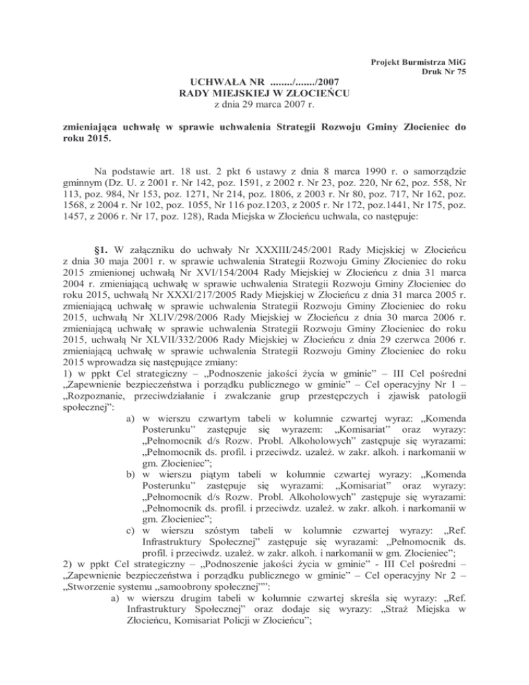 Projekt Burmistrza MiG Druk Nr 75 UCHWAŁA NR ......../......./2007 RADY MIEJSKIEJ W ZŁOCIEŃCU z dnia 29 marca 2007 r. zmieniająca uchwałę w sprawie uchwalenia Strategii Rozwoju Gminy Złocieniec do roku 2015. Na podstawie art. 18 ust. 2 pkt 6 ustawy z dnia 8 marca 1990 r. o samorządzie gminnym (Dz. U. z 2001 r. Nr 142, poz. 1591, z 2002 r. Nr 23, poz. 220, Nr 62, poz. 558, Nr 113, poz. 984, Nr 153, poz. 1271, Nr 214, poz. 1806, z 2003 r. Nr 80, poz. 717, Nr 162, poz. 1568, z 2004 r. Nr 102, poz. 1055, Nr 116 poz.1203, z 2005 r. Nr 172, poz.1441, Nr 175, poz. 1457, z 2006 r. Nr 17, poz. 128), Rada Miejska w Złocieńcu uchwala, co następuje: §1. W załączniku do uchwały Nr XXXIII/245/2001 Rady Miejskiej w Złocieńcu z dnia 30 maja 2001 r. w sprawie uchwalenia Strategii Rozwoju Gminy Złocieniec do roku 2015 zmienionej uchwałą Nr XVI/154/2004 Rady Miejskiej w Złocieńcu z dnia 31 marca 2004 r. zmieniającą uchwałę w sprawie uchwalenia Strategii Rozwoju Gminy Złocieniec do roku 2015, uchwałą Nr XXXI/217/2005 Rady Miejskiej w Złocieńcu z dnia 31 marca 2005 r. zmieniającą uchwałę w sprawie uchwalenia Strategii Rozwoju Gminy Złocieniec do roku 2015, uchwałą Nr XLIV/298/2006 Rady Miejskiej w Złocieńcu z dnia 30 marca 2006 r. zmieniającą uchwałę w sprawie uchwalenia Strategii Rozwoju Gminy Złocieniec do roku 2015, uchwałą Nr XLVII/332/2006 Rady Miejskiej w Złocieńcu z dnia 29 czerwca 2006 r. zmieniającą uchwałę w sprawie uchwalenia Strategii Rozwoju Gminy Złocieniec do roku 2015 wprowadza się następujące zmiany: 1) w ppkt Cel strategiczny – „Podnoszenie jakości Ŝycia w gminie” – III Cel pośredni „Zapewnienie bezpieczeństwa i porządku publicznego w gminie” – Cel operacyjny Nr 1 – „Rozpoznanie, przeciwdziałanie i zwalczanie grup przestępczych i zjawisk patologii społecznej”: a) w wierszu czwartym tabeli w kolumnie czwartej wyraz: „Komenda Posterunku” zastępuje się wyrazem: „Komisariat” oraz wyrazy: „Pełnomocnik d/s Rozw. Probl. Alkoholowych” zastępuje się wyrazami: „Pełnomocnik ds. profil. i przeciwdz. uzaleŜ. w zakr. alkoh. i narkomanii w gm. Złocieniec”; b) w wierszu piątym tabeli w kolumnie czwartej wyrazy: „Komenda Posterunku” zastępuje się wyrazami: „Komisariat” oraz wyrazy: „Pełnomocnik d/s Rozw. Probl. Alkoholowych” zastępuje się wyrazami: „Pełnomocnik ds. profil. i przeciwdz. uzaleŜ. w zakr. alkoh. i narkomanii w gm. Złocieniec”; c) w wierszu szóstym tabeli w kolumnie czwartej wyrazy: „Ref. Infrastruktury Społecznej” zastępuje się wyrazami: „Pełnomocnik ds. profil. i przeciwdz. uzaleŜ. w zakr. alkoh. i narkomanii w gm. Złocieniec”; 2) w ppkt Cel strategiczny – „Podnoszenie jakości Ŝycia w gminie” - III Cel pośredni – „Zapewnienie bezpieczeństwa i porządku publicznego w gminie” – Cel operacyjny Nr 2 – „Stworzenie systemu „samoobrony społecznej””: a) w wierszu drugim tabeli w kolumnie czwartej skreśla się wyrazy: „Ref. Infrastruktury Społecznej” oraz dodaje się wyrazy: „StraŜ Miejska w Złocieńcu, Komisariat Policji w Złocieńcu”; b) w wierszu trzecim tabeli w kolumnie czwartej skreśla się wyrazy: „Ref. Plan. Przestrz. Gosp. Kom. i Inwe.”; c) w wierszu czwartym tabeli w kolumnie czwartej wyrazy: „Ref. Infrastruktury Społecznej” zastępuje się wyrazami: „StraŜ Miejska w Złocieńcu”; 3) w ppkt - Cel strategiczny – „Powszechna dostępność dóbr, usług i informacji” – I Cel pośredni – „Stworzenie zrównowaŜonego systemu transportowego w gminie” – Cel operacyjny Nr 1 – „Opracowanie i realizacja kompleksowego programu modernizacji i rozwoju infrastruktury transportowej gminy do 2015 roku zintegrowanego z systemem i infrastrukturą wojewódzką, krajową i międzynarodową” w wierszu siódmym tabeli w kolumnie czwartej skreśla się wyrazy: „Ref. Infrastruktury Społecznej”; 4) w ppkt Cel strategiczny – „Powszechna dostępność dóbr, usług i informacji” – IV Cel pośredni – „Kształtowanie i utrzymanie ładu przestrzennego oraz dziedzictwa kulturowego” – Cel operacyjny Nr 2 – „ZrównowaŜony rozwój funkcji aktywizujących w zakresie działalności gospodarczej, mieszkalnictwa, usług i turystyki”: a) w wierszu piątym tabeli w kolumnie czwartej skreśla się wyrazy: „Ref. Infrastruktury Społecznej”; b) w wierszu siódmym tabeli w kolumnie drugiej wyrazy: „Na wsiach rozwijać funkcję letniskową” zastępuje się wyrazami: „Sprzyjać rozwojowi funkcji letniskowej” oraz w kolumnie czwartej wyrazy: „Ref. Infrastruktury Społecznej” zastępuje się wyrazami: „Ref. Strategii. Rozw. Gospodarczego i Promocji Gm.”; 5) w ppkt Cel strategiczny – „Powszechna dostępność dóbr, usług i informacji” – IV Cel pośredni – „Kształtowanie i utrzymanie ładu przestrzennego oraz dziedzictwa kulturowego” – Cel operacyjny Nr 4 – „Poprawa ładu i wizerunku przestrzennego gminy i racjonalnego wykorzystania przestrzeni juŜ zagospodarowanej” w wierszu piątym tabeli w kolumnie czwartej na końcu dodaje się wyrazy: „Stanowisko ds. inwestycji krajowych i zagranicznych”; 6) w ppkt Cel strategiczny – „Poprawa konkurencyjności gminy Złocieniec” – II Cel pośredni – „Rozwój funkcji turystyczno – rekreacyjnej” – Cel operacyjny Nr 1 – „Wprowadzenie i wdroŜenie programu rozwoju turystyki w gminie, jako jednego z elementów programu rozwoju gospodarczego regionu” : a) w wierszu drugim tabeli w kolumnie czwartej wyrazy: „Ref. Infrastruktury Społecznej” i „Stowarzyszenie Turysta” zastępuje się wyrazami: „Ref. Strategii. Rozw. Gospodarczego i Promocji Gm.”; b) w wierszu trzecim tabeli w kolumnie czwartej wyrazy: „Stowarzyszenie Turysta” zastępuje się wyrazami: „Ref. Strategii. Rozw. Gospodarczego i Promocji Gm.”; c) w wierszu czwartym tabeli w kolumnie czwartej wyrazy: „Ref.
