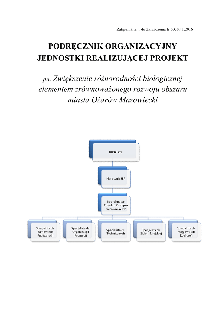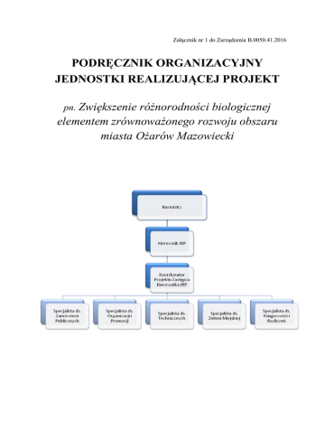 Załącznik nr 1 do Zarządzenia B.0050.41.2016 PODRĘCZNIK ORGANIZACYJNY JEDNOSTKI REALIZUJĄCEJ PROJEKT pn. Zwiększenie różnorodności biologicznej elementem zrównoważonego rozwoju obszaru miasta Ożarów Mazowiecki KIEROWNIK JEDNOSTKI REALIZAUJĄCEJ PROJEKT Cel działalności: Zapewnienie prawidłowej realizacji i rozliczenia Projektu zgodnie z umową o dofinansowanie Projektu. Zadania: 1. Odpowiedzialność za ostateczne brzmienie wszystkich załączników do Umowy o dofinansowanie, które zatwierdza swoim podpisem. Dotyczy to także aktualizacji załączników. 2. Zatwierdzanie i podpisywanie lub poświadczanie dokumentów potwierdzających prawidłowe wykonanie zakresu rzeczowego części lub całości Projektu: protokoły częściowego odbioru wykonanych robót, świadectwa przyjęcia, świadectwa wykonania lub protokoły końcowego odbioru i przekazania do eksploatacji, przejściowe świadectwa płatności, protokoły konieczności łącznie z protokołami negocjacji, dokumenty potwierdzające osiągnięcie zakładanych efektów ekologicznych, raport końcowy itp. 3. Odpowiedzialność przed Beneficjentem za prawidłowe zrealizowanie i rozliczenie Projektu zgodnie z Umową o dofinansowanie oraz decyzjami Instytucji Wdrażającej. 4. Odpowiedzialność za przygotowanie i przeprowadzenie postępowania o udzielanie zamówień publicznych, zgodnie z ustawą Prawo zamówień publicznych, a przede wszystkim za przygotowanie i publikację ogłoszeń, przygotowanie specyfikacji istotnych warunków zamówienia (SIWZ), w tym kryteriów oceny ofert. 5. Odpowiedzialność za poprawność i kompletność umów z wykonawcą, które opatruje swoją parafą. 6. Odpowiedzialność za wymagane przepisami warunki przechowywania i udostępniania dokumentacji związanej z realizacją Projektu zgodnie z zasadami określonymi w Umowie o dofinansowanie. 7. Monitoring rzeczowego i finansowego postępu w realizacji Projektu oraz zgodność realizacji projektu z przepisami prawa krajowego i wspólnotowego, 8. Co najmniej raz na trzy miesiące sporządzanie, zatwierdzanie, podpisanie i przekazanie do Instytucji Wdrażającej wniosku o płatność, z rozbudowaną częścią sprawozdawczą, zgodnie z harmonogramem rzeczowo-finansowym dołączonym do zatwierdzonej Umowy o dofinansowaniu, biorąc pod uwagę datę podpisania Umowy. 9. Odpowiedzialność za wyniki kontroli dotyczącej realizacji Umowy o dofinansowanie zawartej z Instytucją Wdrażającą. 10. Reprezentacja Beneficjenta przed organami kontrolującymi wykonywanie Projektu, w tym również odpowiada za kontrolę Umowy o dofinansowanie zawartej z Instytucja Wdrażającą. Uprawnienia i odpowiedzialność: Kierownik JRP jest odpowiedzialny za: realizację ww. celu działalności, zapewnienie właściwych metod jego realizacji, udostępnianie wszystkich niezbędnych do pracy informacji pracownikom JRP w Urzędzie Miejskim w Ożarowie Mazowieckim. Kierownik JRP jest uprawniony do: podpisywania korespondencji i dokumentów przygotowywanych w JRP, Zatwierdzanie i podpisywanie, poświadczanie dokumentów potwierdzających prawidłowe wykonanie 2 zakresu rzeczowego części lub całości projektu KOORDYNATOR PROJEKTU Cel działalności: Zapewnienie prawidłowej pracy i funkcjonowania Jednostki Realizującej Projekt. Nadzór i kontrola nad pracownikami JRP, koordynacja realizacji projektu opracowywanie i wdrażanie procedur. Monitorowanie postępu prac zgodnie z harmonogramem rzeczowo – finansowym. Identyfikacja zagrożeń w realizacji projektu i informowanie Kierownika JRP o nieprawidłowościach. Zapewnienie nadzoru nad działaniami informacyjnymi i promocyjnymi. Zadania: 1. Przestrzeganie instrukcji i procedur wdrażania projektu zgodnie z obowiązującymi wytycznymi i przepisami. 2. Organizowanie, kierowanie, koordynowanie i nadzór nad pracami JRP. 3. Bezpośredni nadzór nad prawidłową realizacja zadań zgodnie z umową o dofinansowanie Projektu zawartą z Narodowym Funduszem Ochrony Środowiska i Gospodarki Wodnej. 4. Nadzór nad sporządzaniem i zatwierdzanie sprawozdań i raportów z przebiegu realizacji projektu. 5. Nadzór nad przygotowaniem niezbędnych materiałów i analiz. 6. Nadzór nad przygotowaniem Harmonogramów Realizacji Projektu, Planów Płatności Harmonogramów Rzeczowo – Finansowych. 7. Nadzór nad sporządzaniem, weryfikacja i zatwierdzanie Specyfikacji Istotnych Warunków Zamówienia dla wszystkich postępowań o udzielenie zamówienia publicznego ogłaszanych w ramach projektu. 8. Udział w pracach komisji przetargowych. 9. Przygotowanie i nadzór nad wdrożeniem wewnętrznych regulacji określających organizację, skład, tryb pracy oraz zakres obowiązków komisji przetargowych. 10. Niezwłoczne informowanie Kierownika JRP o istniejących bądź przewidywanych zagrożeniach mających wpływ na właściwe wykonanie Projektu oraz przedkładanie propozycji rozwiązań. 11. Zapewnienie właściwej komunikacji w ramach realizowanego projektu. 12. Zapewnienie działań na rzecz właściwej popularyzacji i przepływu informacji dotyczących finansowania i realizacji Projektu. 13. Zapewnienie wglądu do dokumentacji upoważnionym instytucjom. 14. Nadzór nad sporządzaniem i zatwierdzaniem Raportów Monitorujących Projekt. 15. Wykonywanie innych zadań i czynności zleconych przez Kierownika JRP. 3 Uprawnienia i odpowiedzialność: Koordynator Projektu jest odpowiedzialny za: realizację ww. celu działalności, zapewnienie właściwych metod jego realizacji, udostępnianie wszystkich niezbędnych do pracy informacji pracownikom JRP w Urzędzie Miejskim w Ożarowie Mazowieckim. Koordynator Projektu jest uprawniony do: podpisywania korespondencji i dokumentów przygotowywanych w JRP, występowania z wnioskami organizacyjnymi i personalnymi dotyczącymi pracowników JRP. 4 SPECJALISTA DS. KSIĘGOWOŚCI I ROZLICZEŃ Cel działalności: Zapewnienie prowadzenia właściwej rachunkowości i sprawozdawczości finansowej w zakres
