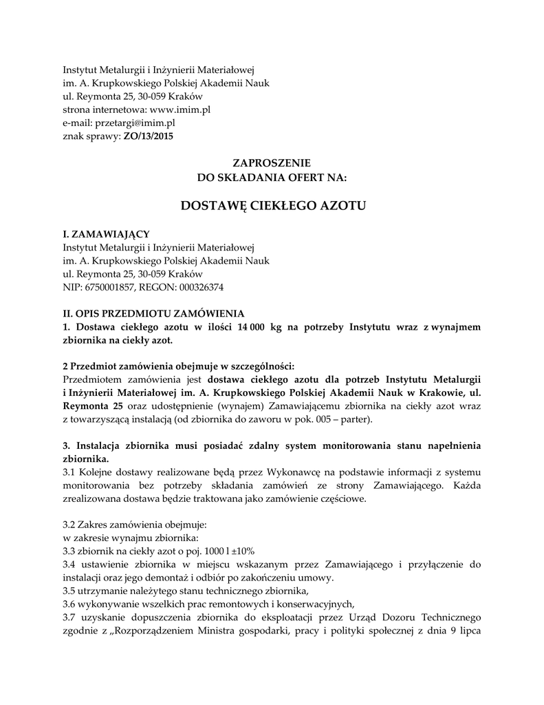 dostawę ciekłego azotu - Instytut Metalurgii i Inżynierii Materiałowej