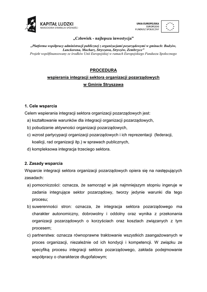 „Człowiek - najlepsza inwestycja” „Platforma współpracy administracji publicznej z organizacjami pozarządowymi w gminach: Budzów, Lanckorona, Mucharz, Stryszawa, Stryszów, Zembrzyce” Projekt współfinansowany ze środków Unii Europejskiej w ramach Europejskiego Funduszu Społecznego PROCEDURA wspierania integracji sektora organizacji pozarządowych w Gminie Stryszawa 1. Cele wsparcia Celem wspierania integracji sektora organizacji pozarządowych jest: a) kształtowanie warunków dla integracji organizacji pozarządowych, b) pobudzanie aktywności organizacji pozarządowych, c) wzrost partycypacji organizacji pozarządowych i ich reprezentacji (federacji, koalicji, rad organizacji itp.) w sprawach publicznych, d) kompleksowa integracja trzeciego sektora. 2. Zasady wsparcia Wsparcie integracji sektora organizacji pozarządowych opiera się na następujących zasadach: a) pomocniczości: oznacza, że samorząd w jak najmniejszym stopniu ingeruje w zadania integrujące sektor pozarządowy, tworzy jedynie warunki dla tego procesu; b) suwerenności stron: oznacza, że integracja sektora pozarządowego ma charakter autonomiczny, dobrowolny i oddolny oraz wynika z przekonania organizacji pozarządowych o korzyściach oraz kosztach związanych z tym procesem; c) partnerstwa: oznacza równoprawne traktowanie wszystkich zaangażowanych w proces organizacji, niezależnie od ich kondycji i kompetencji. W związku ze specyfiką procesu integracji sektora pozarządowego, zakłada podejmowanie współpracy o charakterze długofalowym; „Człowiek - najlepsza inwestycja” „Platforma współpracy administracji publicznej z organizacjami pozarządowymi w gminach: Budzów, Lanckorona, Mucharz, Stryszawa, Stryszów, Zembrzyce” Projekt współfinansowany ze środków Unii Europejskiej w ramach Europejskiego Funduszu Społecznego d) efektywności: sprzyja tworzeniu reprezentacji sektora pozarządowego, poprzez łączenie kompetencji i zasobów pozwalających aktywnie uczestniczyć w procesie konsultacji polityk publicznych (strategie, wieloletnie plany działania). Zasada odwołuje się do przekonania, że zintegrowane środowisko lepiej i skuteczniej realizuje powierzone zadania. Zakłada również, że wiedza o aktywnych - w najbliższym otoczeniu - podmiotach pozwala tworzyć porozumienia i partnerstwa zdolne do efektywniejszej realizacji zadań publicznych. Integracja pozwala również na eliminowanie dublowania realizacji zadań i konkurowania o tego samego klienta.; e) uczciwej konkurencji: oznacza, że szanse udziału w integracji sektora mają wszystkie działające na terenie gminy lub regionu organizacje pozarządowe. Zakłada również, że istnieje możliwość tworzenia wielu reprezentacji branżowych trzeciego sektora, z którymi samorząd podejmuje współpracę; f) jawność: zakłada, że powszechnie dostępne są informacje o zarejestrowanych podmiotach trzeciego sektora, porozumieniach pomiędzy organizacjami i o ich reprezentacjach, a także o udziale przedstawicieli organizacji pozarządowych w ciałach dialogu (np. rady zatrudnienia, rady działalności pożytku publicznego, komisje dialogu). 3. Podstawowe formy wsparcia Wsparcie integracji sektora organizacji pozarządowych ze strony Gminy może polegać w szczególności na: a) organizacji spotkań, szkoleń i warsztatów problemowych i wykorzystywanie ich jako formy działań integracyjnych i płaszczyzn wymiany doświadczeń czy okazji nawiązania partnerstwa i współpracy; b) organizacji spotkań nieformalnych (np. bali, koncertów, pikników itp.), których jednym z celów jest również integracja trzeciego sektora, c) tworzenie tematycznych grup problemowych, d) podejmowanie wspólnych działań promocyjnych, „Człowiek - najlepsza inwestycja” „Platforma współpracy administracji publicznej z organizacjami pozarządowymi w gminach: Budzów, Lanckorona, Mucharz, Stryszawa, Stryszów, Zembrzyce” Projekt współfinansowany ze środków Unii Europejskiej w ramach Europejskiego Funduszu Społecznego e) dofinansowanie i/lub organizacja przez Gminę udziału przedstawicieli lokalnego sektora pozarządowego w ważnych wydarzeniach, f) udostępnianie kanałów informacyjnych do promocji organizacji pozarządowych, g) powoływanie rad działalności pożytku publicznego. 4. Zgłoszenie zainteresowania wsparciem 4.1 Organizacje pozarządowe zainteresowane wsparciem mogą złożyć do Gminy stosowny wniosek (dalej: Wniosek). 4.2 Wniosek powinien zawierać w szczególności następujące dane: a) dane adresowe Wnioskodawców oraz dane kontaktowe (adres mailowy, telefon), b) opis prowadzonej przez Wnioskodawców działalności, c) opis wnioskowanego wsparcia wraz z uzasadnieniem, d) podpis osoby/osób uprawnionych do reprezentacji Wnioskodawców. 4.3 Do Wniosku należy dołączyć kopię/odpis statut Wnioskodawców. 5. Weryfikacja Wniosku 5.1 Gmina może wzywać Wnioskodawców od dokonania uzupełnień Wniosku, złożenia dodatkowych dokumentów, wyjaśnień itp. Gmina może również przeprowadzić bezpośrednie rozmowy/negocjacje. 5.2 Wniosek weryfikowany jest pod względem formalnym oraz merytorycznym. Okres weryfikacji nie powinien przekraczać 45 dni, przy czym ulega on zawieszeniu na czas konieczny do wykonania przez Wnioskodawców wezwań, o których mowa w ust. 1 powyżej. 5.3 O ostatecznej decyzji Gmina informuje Wnioskodawców w drodze pisemnej. „Człowiek - najlepsza inwestycja” „Platforma współpracy administracji publicznej z organizacjami pozarządowymi w gminach: Budzów, Lanckorona, Mucharz, Stryszawa, Stryszów, Zembrzyce” Projekt współfinansowany ze środków Unii Europejskiej w ramach Europejskiego Funduszu Społecznego 6. Zawarcie umowy dotyczącej wsparcia W przypadku pozytywnej decyzji Gminy strony zawierają umowę regulującą zasady wsparcia. 7. Postanowienia końcowe Niniejsza procedura nie wyłącza innych, przewidzianych przepisami prawa, trybów wspierania integracji sektor