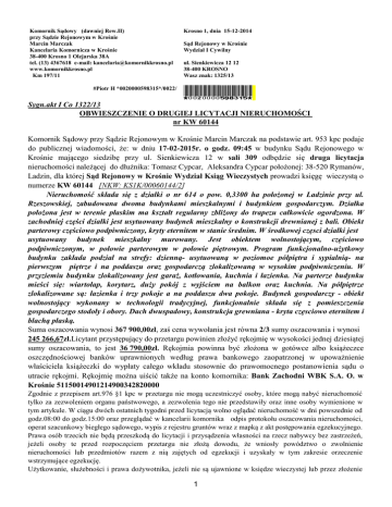 Komornik Sądowy (dawniej Rew.II) przy Sądzie Rejonowym w Krośnie Marcin Marczak Kancelaria Komornicza w Krośnie 38-400 Krosno 1 Olejarska 38A tel. (13) 4367618 e-mail: [email protected] www.komornikkrosno.pl Km 197/11 #Piotr H *0020000598315*/0022/ Krosno 1, dnia 15-12-2014 Sąd Rejonowy w Krośnie Wydział I Cywilny ul. Sienkiewicza 12 12 38-400 KROSNO Wasz znak: 1325/13 *0020000598315* Sygn.akt I Co 1322/13 OBWIESZCZENIE O DRUGIEJ LICYTACJI NIERUCHOMOŚCI nr KW 60144 Komornik Sądowy przy Sądzie Rejonowym w Krośnie Marcin Marczak na podstawie art. 953 kpc podaje do publicznej wiadomości, że: w dniu 17-02-2015r. o godz. 09:45 w budynku Sądu Rejonowego w Krośnie mającego siedzibę przy ul. Sienkiewicza 12 w sali 309 odbędzie się druga licytacja nieruchomości należącej do dłużnika: Tomasz Cypcar, Aleksandra Cypcar położonej: 38-520 Rymanów, Ladzin, dla której Sąd Rejonowy w Krośnie Wydział Ksiąg Wieczystych prowadzi księgę wieczystą o numerze KW 60144 [NKW: KS1K/00060144/2] Nieruchomość składa się z działki o nr 614 o pow. 0,3300 ha położonej w Ladzinie przy ul. Rzeszowskiej, zabudowana dwoma budynkami mieszkalnymi i budynkiem gospodarczym. Działka położona jest w terenie płaskim ma kształt regularny zbliżony do trapezu całkowicie ogordzona. W zachodniej części działki jest usytuowany budynek mieszkalny o konstrukcji drewnianej z bali. Obiekt parterowy częściowo podpiwniczony, kryty eternitem w stanie średnim. W środkowej częsci działki jest usytuowany budynek mieszkalny murowany. Jest obiektem wolnostojącym, częściowo podpiwniczonym, w połowie parterowym w połowie piętrowym. Program funkcjonalno-użytkowy budynku zakłada podział na strefy: dzienną- usytuowaną w poziomoe półpiętra i sypialnią- na pierwszym piętrze i na poddaszu oraz gospodarczą zlokalizowaną w wysokim podpiwniczeniu. W przyziemiu budynku zlokalizowany jest garaż, kotłowania, kuchnia i łazienka. Na parterze budynku mieści się: wiartołap, korytarz, duży pokój z wyjściem na balkon oraz kuchnia. Na półpiętrze zlokalizowane są: łazienka i trzy pokoje a na poddaszu dwa pokoje. Budynek gospodarczy - obiekt wolnostojący wykonany w technologii tradycyjnej, funkcjonalnie składa się z pomieszczenia gospodarczego stodoły i obory. Dach dwuspadowy, konstrukcja grewniana - kryta częsciowo eternitem i blachą płaską. Suma oszacowania wynosi 367 900,00zł, zaś cena wywołania jest równa 2/3 sumy oszacowania i wynosi 245 266,67zł.Licytant przystępujący do przetargu powinien złożyć rękojmię w wysokości jednej dziesiątej sumy oszacowania, to jest 36 790,00zł. Rękojmia powinna być złożona w gotówce albo książeczce oszczędnościowej banków uprawnionych według prawa bankowego zaopatrzonej w upoważnienie właściciela książeczki do wypłaty całego wkładu stosownie do prawomocnego postanowienia sądu o utracie rękojmi. Rękojmię można uiścić także na konto komornika: Bank Zachodni WBK S.A. O. w Krośnie 51150014901214900342820000 Zgodnie z przepisem art.976 §1 kpc w przetargu nie mogą uczestniczyć osoby, które mogą nabyć nieruchomość tylko za zezwoleniem organu państwowego, a zezwolenia tego nie przedstawiły oraz inne osoby wymienione w tym artykule. W ciągu dwóch ostatnich tygodni przed licytacją wolno oglądać nieruchomość w dni powszednie od godz.08:00 do godz.15:00 oraz przeglądać w kancelarii komornika odpis protokołu oszacowania nieruchomości, operat szacunkowy biegłego sądowego, wypis z rejestru gruntów wraz z mapką z akt postępowania egzekucyjnego. Prawa osób trzecich nie będą przeszkodą do licytacji i przysądzenia własności na rzecz nabywcy bez zastrzeżeń, jeżeli osoby te przed rozpoczęciem przetargu nie złożą dowodu, że wniosły powództwo o zwolnienie nieruchomości lub przedmiotów razem z nią zajętych od egzekucji i uzyskały w tym zakresie orzeczenie wstrzymujące egzekucję. Użytkowanie, służebności i prawa dożywotnika, jeżeli nie są ujawnione w księdze wieczystej lub przez złożenie 1 dokumentu do zbioru dokumentów i nie zostaną zgłoszone najpóźniej na trzy dni przed rozpoczęciem licytacji, nie będą uwzględnione w dalszym toku egzekucji i wygasną z chwilą uprawomocnienia się postanowienia o przysądzeniu własności. Komornik Sądowy Marcin Marczak 2