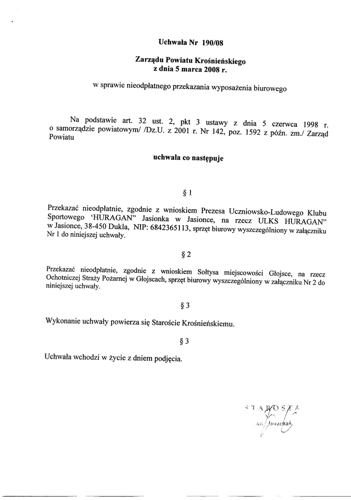 Uchwała Nr 190/08 Zarządu Powiatu Krośnieńskiego z dnia 5 marca 2008 r. w sprawie nieodpłatnego przekazania wyposażenia biuro wego Na podstawie art. 32 ust. 2, pkt 3 ustawy z dnia 5 czerwca 1998 r. o samorządzie powi atow ym/ /Dz.U. z 2001 r. Nr 142, poz. 1592 z późn. zm./ Zarząd Powiatu uchwala co następuje §1 Przekazać nieodpłatnie, zgodnie z wnioskiem Prezesa Uczniowsko-Ludowego Klubu Sportowego 'HUR AGA N" Jasionka w Jasionce, na rzecz ULKS HUR AGA N" w Jasionce, 38-450 Dukla, NIP: 6842365113, sprzęt biuro wy wyszczególniony w załączniku Nr 1 do niniejszej uchwały. §2 Przekazać nieodpłatnie, zgodnie z wnioskiem Sołty sa miejscowości Głojsce, na rzecz Ochotniczej Straży Pożarnej w Głojscach, sprzęt biurowy wysz czególniony w załączniku Nr 2 do niniejszej uchwały. §3 Wykonanie uchwały powi erza się Staroście Krośnieńskiemu. §3 Uchwała wchodzi w życie z dniem podjęcia. Załącznik Nr 1 do Uchwały Zarządu Nr 190108 z dnia 05. 03. 2008 r. Wyka z sprzętu biurowego przekazanego nieodpłatnie na rzecz ULKS HURAGAN" w Jasionce Lp. Wyszczególnienie 1 Biurko z przystawką 2 Krzesło 3 Nr Inwentarzowy Wartość /zł./ SPK-1-1/94 0,83 drewn iane tapicerowane SPK-1-8/297 0,31 Krzesło drewn iane tapicerowane SPK-1-8/515 0,31 4 Krzesło drewn iane tapicerowane SPK-1-8/518 0,20 5 Krzesło drewniane tapicerowane SPK-1-8/685 0,32 6 Krzesło drewniane tapicerowane SPK-1-8/785 0,32 7 Krzesło drewniane tapicerowane SPK-1-8/787 0,32 8 Krzesło drewniane tapicerowane SPK-1-8/788 0,32 9 Krzesło tapicerowane SPK-1-8/191 0,32 10 Fotel drewniany SPK-1-7/45 0,78 Załącznik Nr 2 do Uchwały Zarządu Nr 190108 z dn ia 05. 03. 20 08 r. Wykaz sprzętu biurowego przekazanego OSP w Lp. 1 Wyszczególnienie Głojscach nieodpłatnie Nr Inwentarzowy na rzecz Wartość /zł./ Se gm en t ga bin eto wy 5-częściowy SPK-1-4/4 2 Krzesło dre wn ian e tapicerowane SPK-I-8/513 3 Krzesło dre wn ian e tap ice row an e SPK-I-8/523 4 Krzesło dre wn ian e tap ice row an e SPK-1-8/696 5 Krzesło dre wn ian e tap ice row an e SPK-1-8/335 6 Krzesło 7 Fotel dre wn ian y tap ice row an e SPK-I-8/140 SPK-I-7/46 34,08 0,31 0,26 0,32 0,05 0,32 0,13