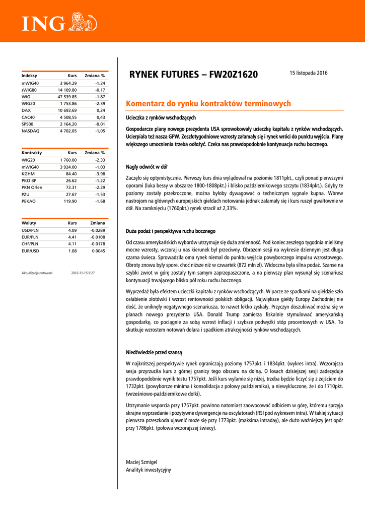 Indeksy Kurs Zmiana % mWIG40 3 964.29 -1.24 sWIG80 14 109.80 -0.17 WIG 47 539.85 -1.87 1 753.86 -2.39 10 693,69 0,24 WIG20 DAX CAC40 4 508,55 0,43 SP500 2 164,20 -0.01 NASDAQ 4 702,05 -1,05 Kontrakty Kurs Zmiana % WIG20 1 760.00 -2.33 mWIG40 3 924.00 -1.03 KGHM 84.40 -3.98 PKO BP 26.62 -1.22 PKN Orlen 73.31 -2.29 PZU 27.67 -1.53 PEKAO 119.90 -1.68 Waluty Kurs Zmiana USD/PLN 4.09 -0.0289 EUR/PLN 4.41 -0.0108 CHF/PLN 4.11 -0.0178 EUR/USD 1.08 0.0045 Aktualizacja notowań: 2016-11-15 8:27 RYNEK FUTURES – FW20Z1620 15 listopada 2016 Komentarz do rynku kontraktów terminowych Ucieczka z rynków wschodzących Gospodarcze plany nowego prezydenta USA sprowokowały ucieczkę kapitału z rynków wschodzących. Ucierpiała też nasza GPW. Zeszłotygodniowe wzrosty załamały się i rynek wróci do punktu wyjścia. Plany większego umocnienia trzeba odłożyć. Czeka nas prawdopodobnie kontynuacja ruchu bocznego. Nagły odwrót w dół Zaczęło się optymistycznie. Pierwszy kurs dnia wylądował na poziomie 1811pkt., czyli ponad pierwszymi oporami (luka bessy w obszarze 1800-1808pkt.) i blisko październikowego szczytu (1834pkt.). Gdyby te poziomy zostały przekroczone, można byłoby dywagować o technicznym sygnale kupna. Wbrew nastrojom na głównych europejskich giełdach notowania jednak załamały się i kurs ruszył gwałtownie w dół. Na zamknięciu (1760pkt.) rynek stracił aż 2,33%. Duża podaż i perspektywa ruchu bocznego Od czasu amerykańskich wyborów utrzymuje się duża zmienność. Pod koniec zeszłego tygodnia mieliśmy mocne wzrosty, wczoraj u nas kierunek był przeciwny. Obrazem sesji na wykresie dziennym jest długa czarna świeca. Sprowadziła oma rynek niemal do punktu wyjścia powyborczego impulsu wzrostowego. Obroty znowu były spore, choć niższe niż w czwartek (872 mln zł). Widoczna była silna podaż. Szanse na szybki zwrot w górę zostały tym samym zaprzepaszczone, a na pierwszy plan wysunął się scenariusz kontynuacji trwającego blisko pół roku ruchu bocznego. Wyprzedaż była efektem ucieczki kapitału z rynków wschodzących. W parze ze spadkami na giełdzie szło osłabienie złotówki i wzrost rentowności polskich obligacji. Największe giełdy Europy Zachodniej nie dość, że uniknęły negatywnego scenariusza, to nawet lekko zyskały. Przyczyn doszukiwać można się w planach nowego prezydenta USA. Donald Trump zamierza fiskalnie stymulować amerykańską gospodarkę, co pociągnie za sobą wzrost inflacji i szybsze podwyżki stóp procentowych w USA. To skutkuje wzrostem notowań dolara i spadkiem atrakcyjności rynków wschodzących. Niedźwiedzie przed szansą W najkrótszej perspektywie rynek ograniczają poziomy 1757pkt. i 1834pkt. (wykres intra). Wczorajsza sesja przyrzuciła kurs z górnej granicy tego obszaru na dolną. O losach dzisiejszej sesji zadecyduje prawdopodobnie wynik testu 1757pkt. Jeśli kurs wyłamie się niżej, trzeba będzie liczyć się z zejściem do 1732pkt. (powyborcze minima i konsolidacja z połowy października), a niewykluczone, że i do 1710pkt. (wrześniowo-październikowe dołki). Utrzymanie wsparcia przy 1757pkt. powinno natomiast zaowocować odbiciem w górę, któremu sprzyja skrajne wyprzedanie i pozytywne dywergencje na oscylatorach (RSI pod wykresem intra). W takiej sytuacji pierwsza przeszkoda ujawnić może się przy 1773pkt. (maksima intraday), ale dużo ważniejszy jest opór przy 1786pkt. (połowa wczorajszej świecy). Maciej Szmigel Analityk inwestycyjny 15 listopada 2016 FW20 – wykres intraday FW20 – dzienny Nadzór nad Biurem Maklerskim ING Banku Śląskiego S.A., będącym wyodrębnioną organizacyjnie jednostką ING Banku Śląskiego S.A. z siedzibą w Katowicach przy ulicy Sokolskiej 34, sprawuje Komisja Nadzoru Finansowego. Niniejsza publikacja została przygotowana przez Biuro Maklerskie wyłącznie w celach informacyjnych i nie stanowi analizy inwestycyjnej ani analizy finansowej w rozumieniu Ustawy z dnia 29 lipca 2005 r. o obrocie instrumentami finansowymi, ani też rekomendacji w rozumieniu przepisów rozporządzenia Ministra Finansów z dnia 19 października 2005 r. w sprawie informacji stanowiących rekomendacje dotyczące instrumentów finansowych, ich emitentów lub wystawców. Biuro Maklerskie dołożyło należytej staranności w celu zapewnienia, by zawarte informacje nie były błędne lub nieprawdziwe w dniu ich publikacji, jednak Biuro Maklerskie i jego pracownicy nie ponoszą odpowiedzialności za ich prawdziwość i kompletność, jak również za wszelkie szkody powstałe w wyniku wykorzystania niniejszej publikacji lub zawartych w niej informacji. Biuro Maklerskie udostępnia niniejszą publikację nieodpłatnie. Dokument ten jest chroniony zgodnie z Ustawą z dnia 4 lutego 1994 r. o prawie autorskim i prawach pokrewnych. Zabronione jest powielanie i rozpowszechnianie tego dokumentu bez zgody Biura Maklerskiego.