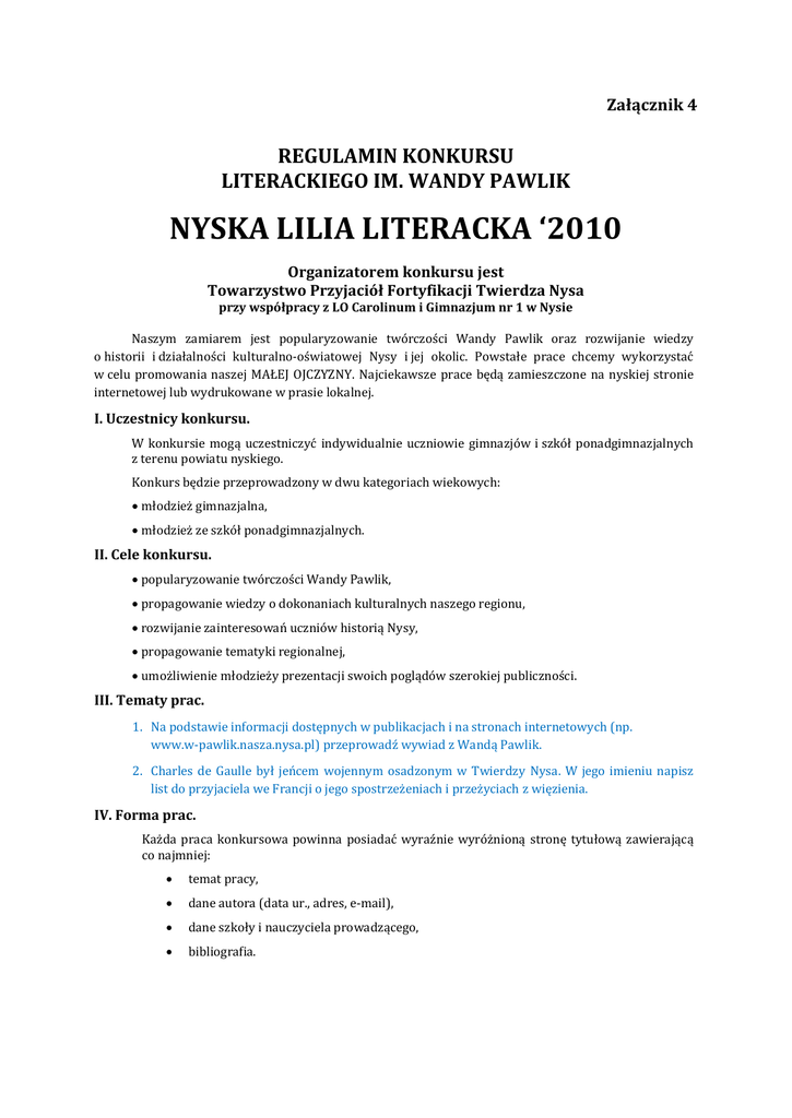 Załącznik 4 REGULAMIN KONKURSU LITERACKIEGO IM. WANDY PAWLIK NYSKA LILIA LITERACKA ‘2010 Organizatorem konkursu jest Towarzystwo Przyjaciół Fortyfikacji Twierdza Nysa przy współpracy z LO Carolinum i Gimnazjum nr 1 w Nysie Naszym zamiarem jest popularyzowanie twórczości Wandy Pawlik oraz rozwijanie wiedzy o historii i działalności kulturalno-oświatowej Nysy i jej okolic. Powstałe prace chcemy wykorzystać w celu promowania naszej MAŁEJ OJCZYZNY. Najciekawsze prace będą zamieszczone na nyskiej stronie internetowej lub wydrukowane w prasie lokalnej. I. Uczestnicy konkursu. W konkursie mogą uczestniczyć indywidualnie uczniowie gimnazjów i szkół ponadgimnazjalnych z terenu powiatu nyskiego. Konkurs będzie przeprowadzony w dwu kategoriach wiekowych: młodzież gimnazjalna, młodzież ze szkół ponadgimnazjalnych. II. Cele konkursu. popularyzowanie twórczości Wandy Pawlik, propagowanie wiedzy o dokonaniach kulturalnych naszego regionu, rozwijanie zainteresowań uczniów historią Nysy, propagowanie tematyki regionalnej, umożliwienie młodzieży prezentacji swoich poglądów szerokiej publiczności. III. Tematy prac. 1. Na podstawie informacji dostępnych w publikacjach i na stronach internetowych (np. www.w-pawlik.nasza.nysa.pl) przeprowadź wywiad z Wandą Pawlik. 2. Charles de Gaulle był jeńcem wojennym osadzonym w Twierdzy Nysa. W jego imieniu napisz list do przyjaciela we Francji o jego spostrzeżeniach i przeżyciach z więzienia. IV. Forma prac. Każda praca konkursowa powinna posiadać wyraźnie wyróżnioną stronę tytułową zawierającą co najmniej: temat pracy, dane autora (data ur., adres, e-mail), dane szkoły i nauczyciela prowadzącego, bibliografia. Wymagania dotyczące prac konkursowych 1. Objętość tekstu jest ograniczona do 5 stron maszynopisu formatu A4 tzn. 10 000 znaków (bez spacji), 2. Objętość strony tekstu, powinna być liczona wg ogólnie przyjętych zasad tj. format A4, czcionką 12 Arial, z odstępami pomiędzy wierszami 1,5. 3. Zamieszczone w pracy zdjęcia i ilustracje powinny być opisane nazwiskiem autora lub nazwą instytucji. 4. Prace powinny być przygotowane zgodnie z przepisami o prawie autorskim. 5. Wszystkie pace powinny być wydrukowane oraz zapisane na płycie CD-R w formacie MS Word 2003 (*.doc) lub jako tekst sformatowany (format *.rtf), V. Termin nadsyłania prac. Zgłoszenia do konkursu należy przesłać do 8 listopada br., a prace należy dostarczyć do dnia 12 listopada na adres: Gimnazjum nr 1 48-300 Nysa, ul. Chodowieckiego 7 LO Carolinum 48-300 Nysa, ul. Sobieskiego 2 z dopiskiem „Konkurs Literacki”. Prace winny być dostarczane wraz z informacją o uczestniku (nazwisko, imię, adres, nazwa szkoły, do której uczęszcza, i nazwisko nauczyciela j. polskiego). Przesyłane drogą pocztową prace winny być odpowiednio zabezpieczone przed uszkodzeniami mechanicznymi. VI. Ocena prac. Oceny prac finałowych dokonuje Komisja Konkursu, której przewodniczącą jest Anna Pilecka (polonistka, córka Wandy Pawlik). Ponadto w skład komisji wchodzą: nauczyciele języka polskiego, nauczyciele historii Oceniane będą: forma wykonania, samodzielność i oryginalność pracy. Członkowie komisji oceniają prace w zakresie od 0 do 10 punktów. W razie równej liczby punktów dokonane zostanie kolejne głosowanie, przy ponownej, równej liczbie głosów, decyduje głos przewodniczącego. Wyłonionych zostanie trzech laureatów w każdej grupie wiekowej. Komisja może przyznawać wyróżnienia. Wyniki konkursu zostaną ogłoszone 16 listopada w Nyskim Domu Kultury w trakcie uroczystego koncertu.. VII. Inne postanowienia. Organizatorzy zastrzegają sobie prawo do nieodpłatnego rozpowszechniania wszystkich zgłoszonych do konkursu prac. Prace pozostają w archiwum TPF. Aktualne informacje o przebiegu konkursu będą podane na stronie internetowej http://www.ndk.nysa.pl . Wszelkie pytania proszę kierować na adres e-mail: [email protected]